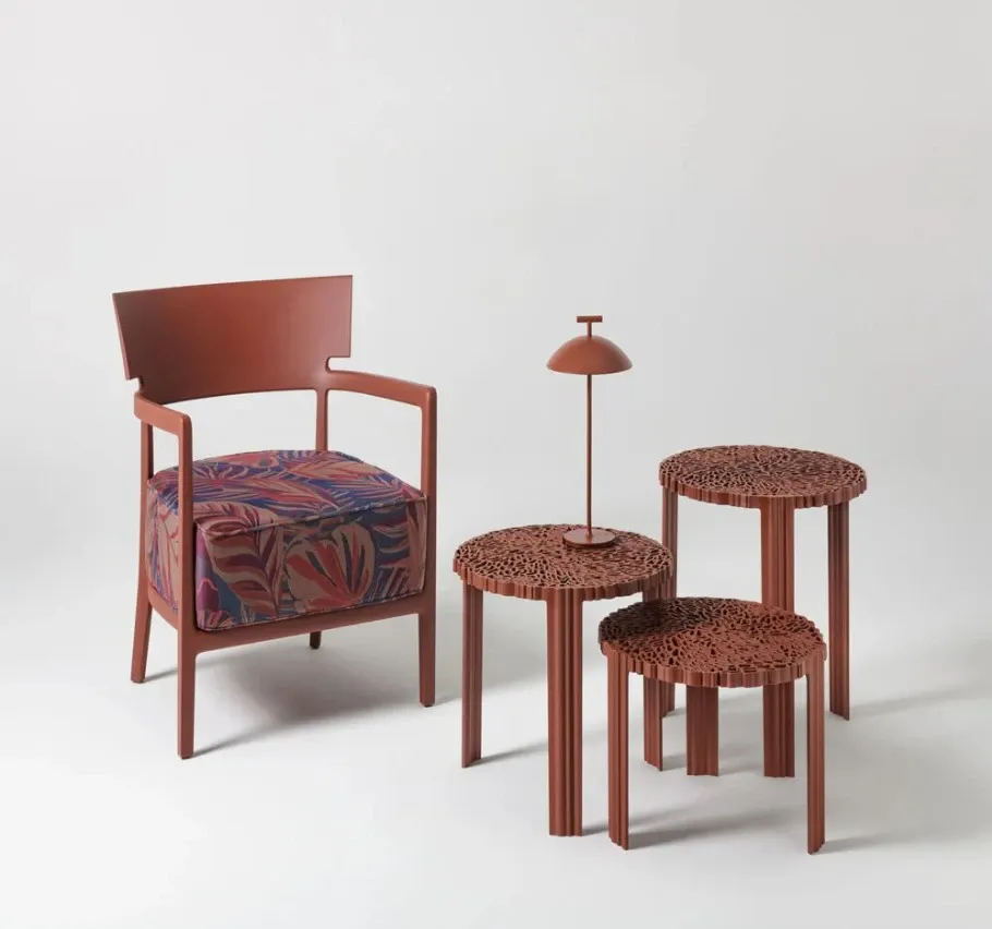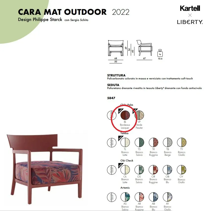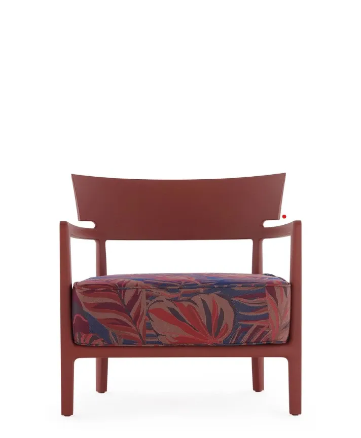 La poltrona Cara di Philippe Starck si presentano con una nuova veste, grazie all'utilizzo dei tessuti Liberty appositamente progettati per gli spazi all'aperto.