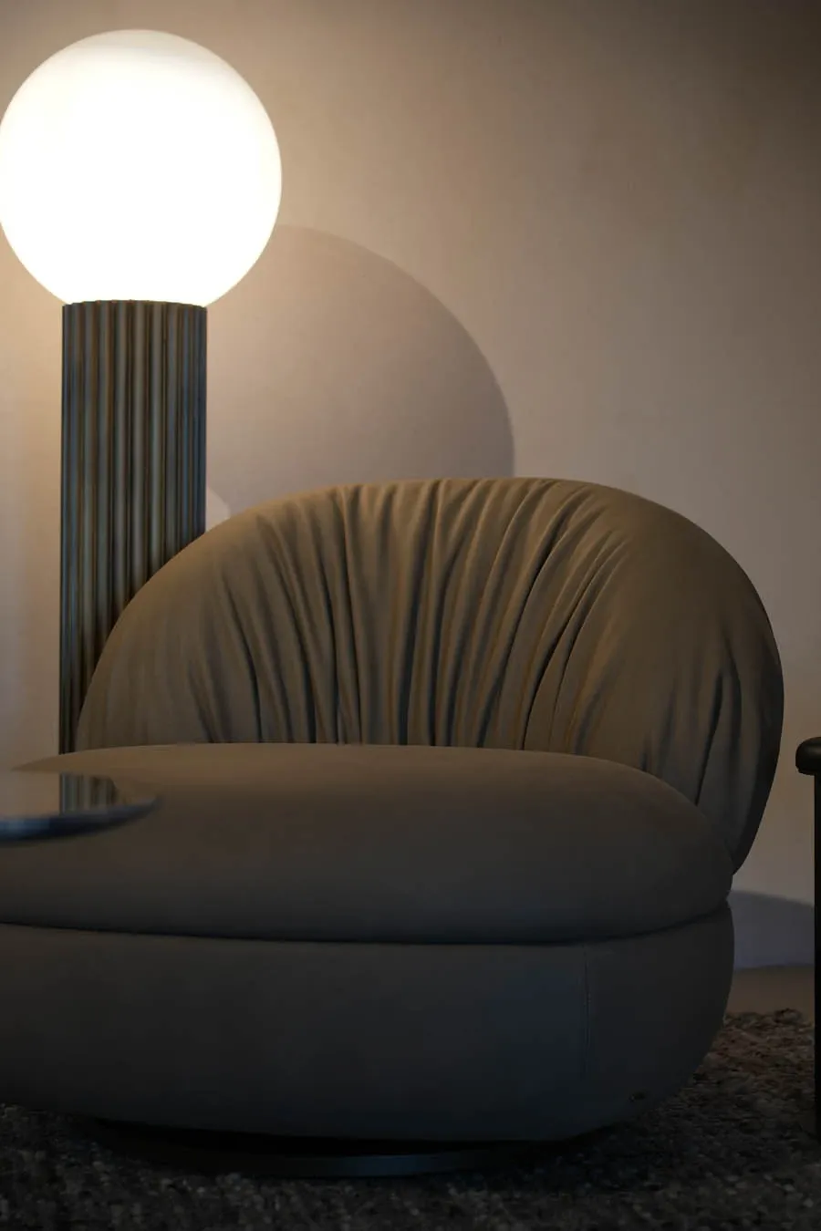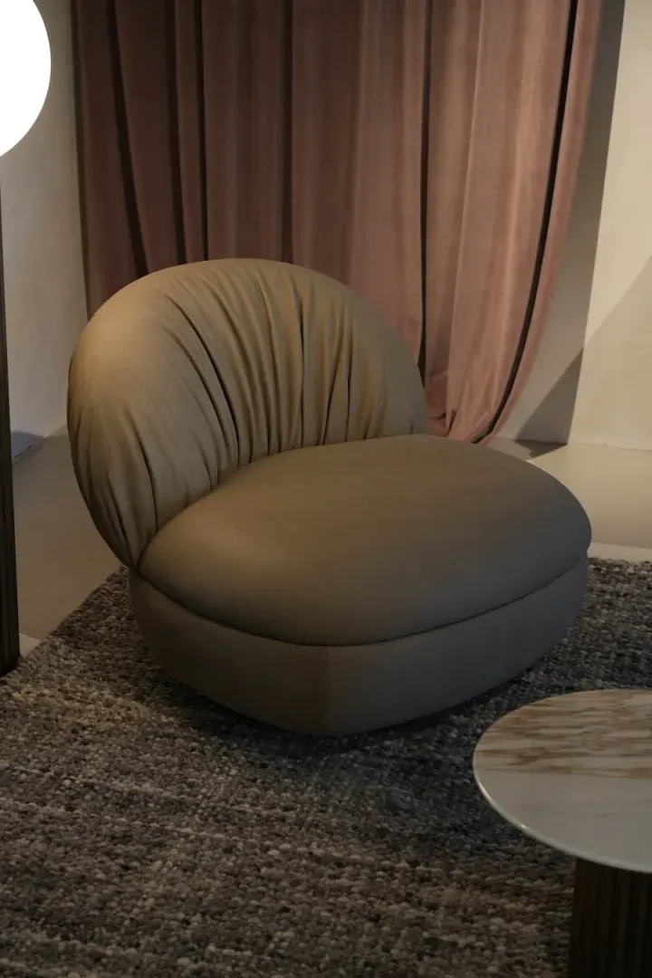 Fandango è una poltrona dell'azienda Rugiano, dalle forme generose e compatte, progettata per offrire un comfort avvolgente e immediato. Il suo design si distingue per uno schienale alto e morbido, impreziosito da un drappeggio irregolare che crea un effetto visivo ricco di movimento. Le pieghe del rivestimento si aprono con naturalezza, conferendo alla poltrona un carattere sofisticato e non convenzionale.
