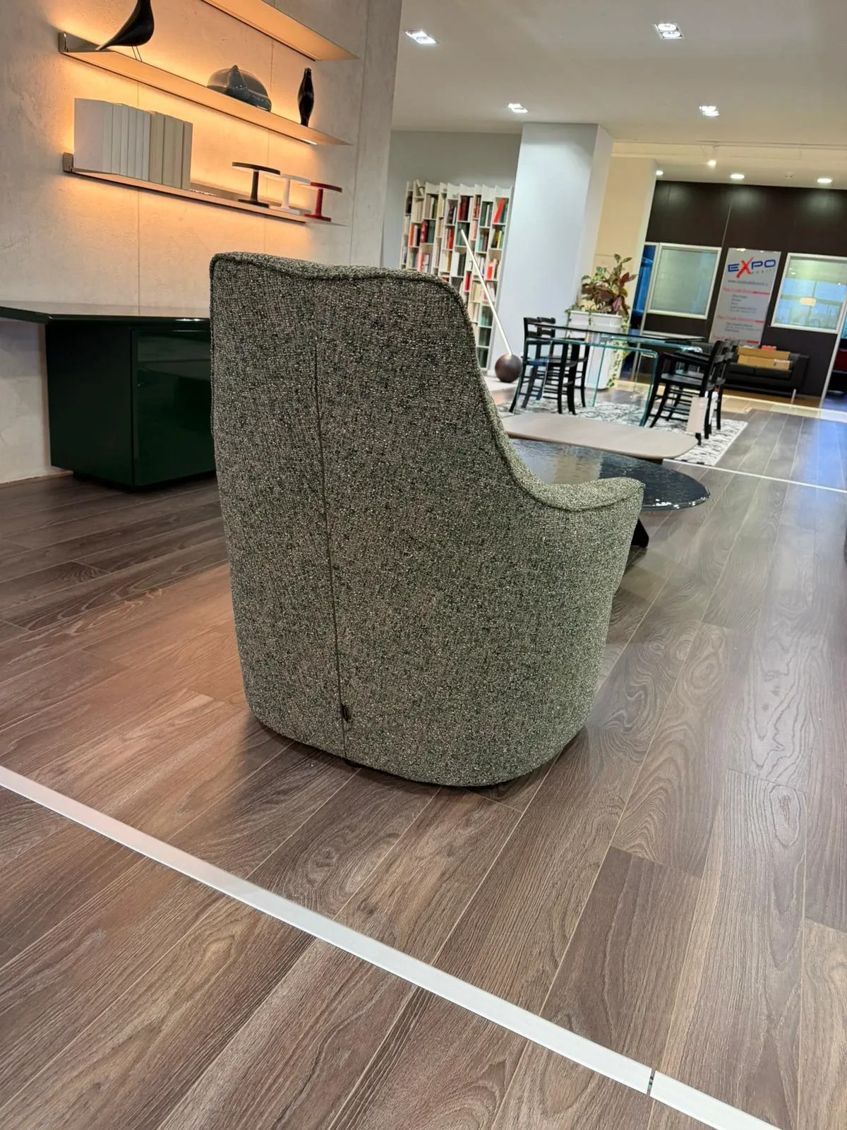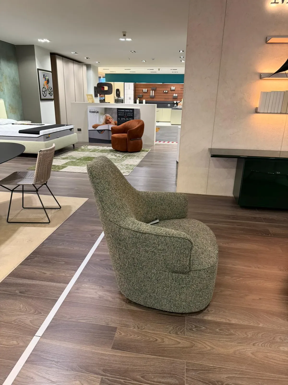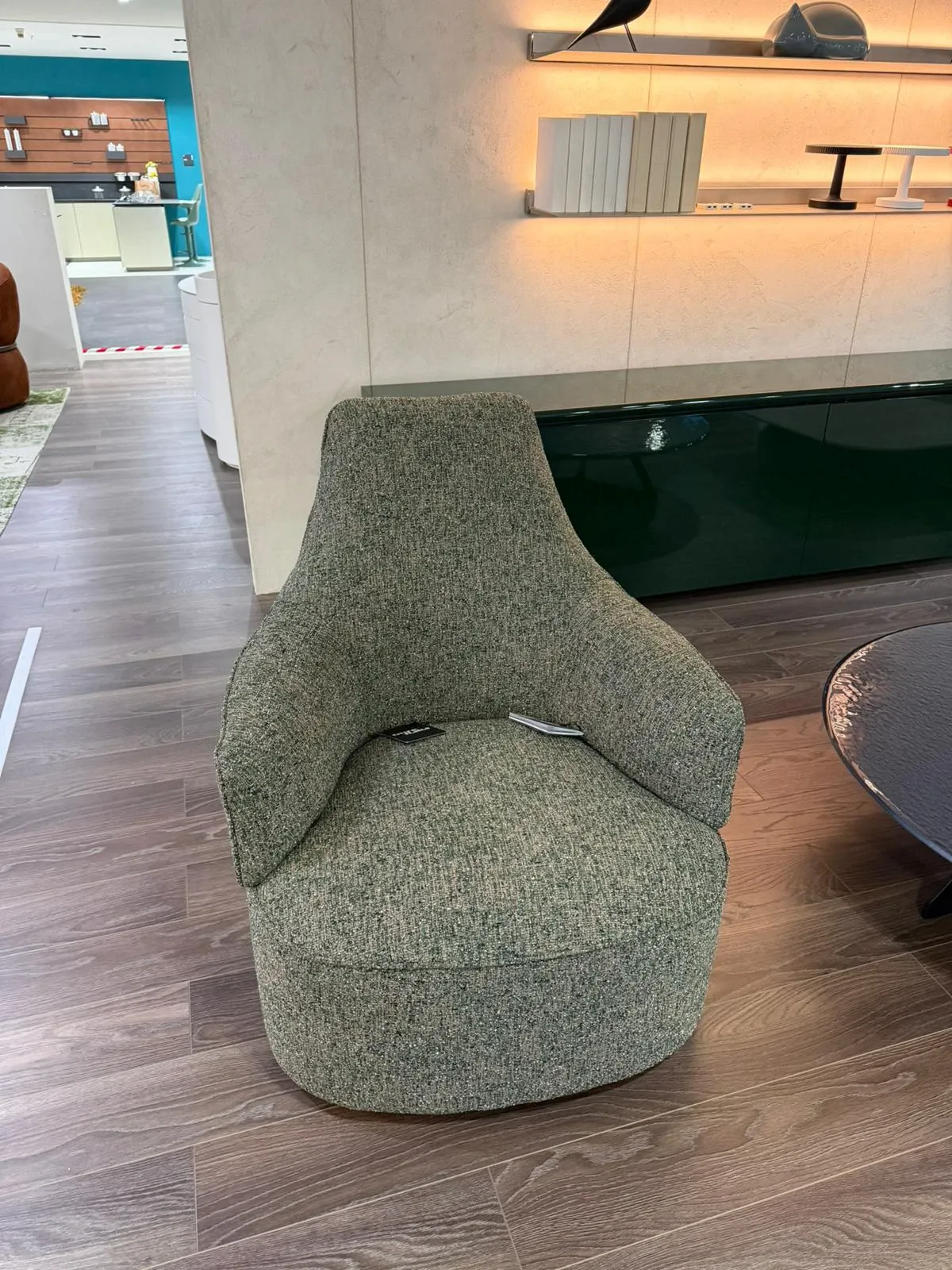 Le linee morbide e avvolgenti definiscono un design equilibrato, capace di integrarsi con naturalezza sia in contesti residenziali che professionali. Il rivestimento in tessuto contribuisce a un comfort visivo e tattile elevato, rendendo la poltrona ideale per momenti di relax quotidiano.