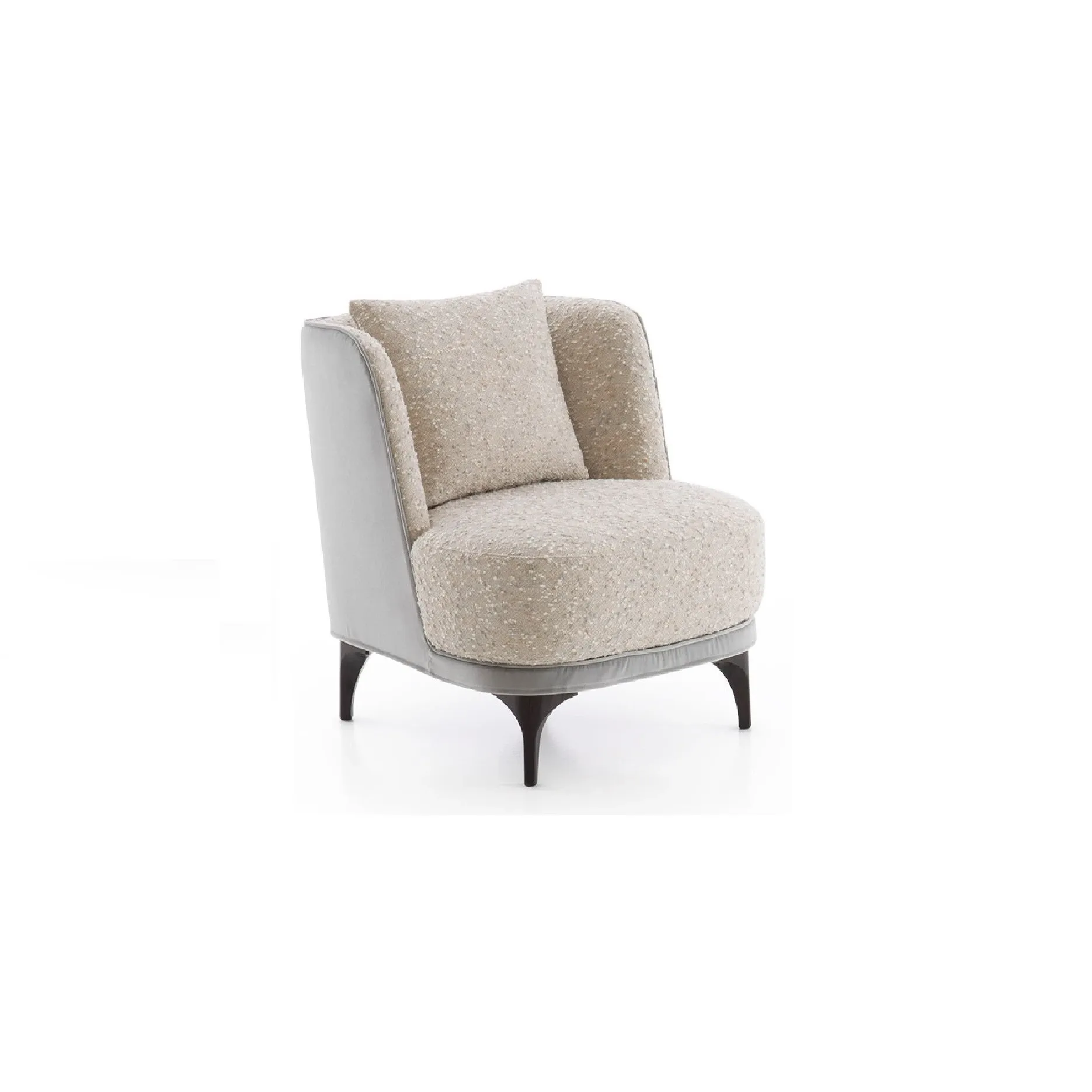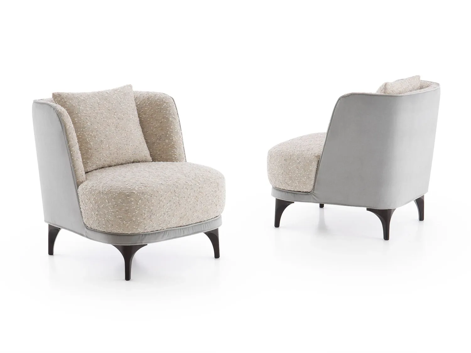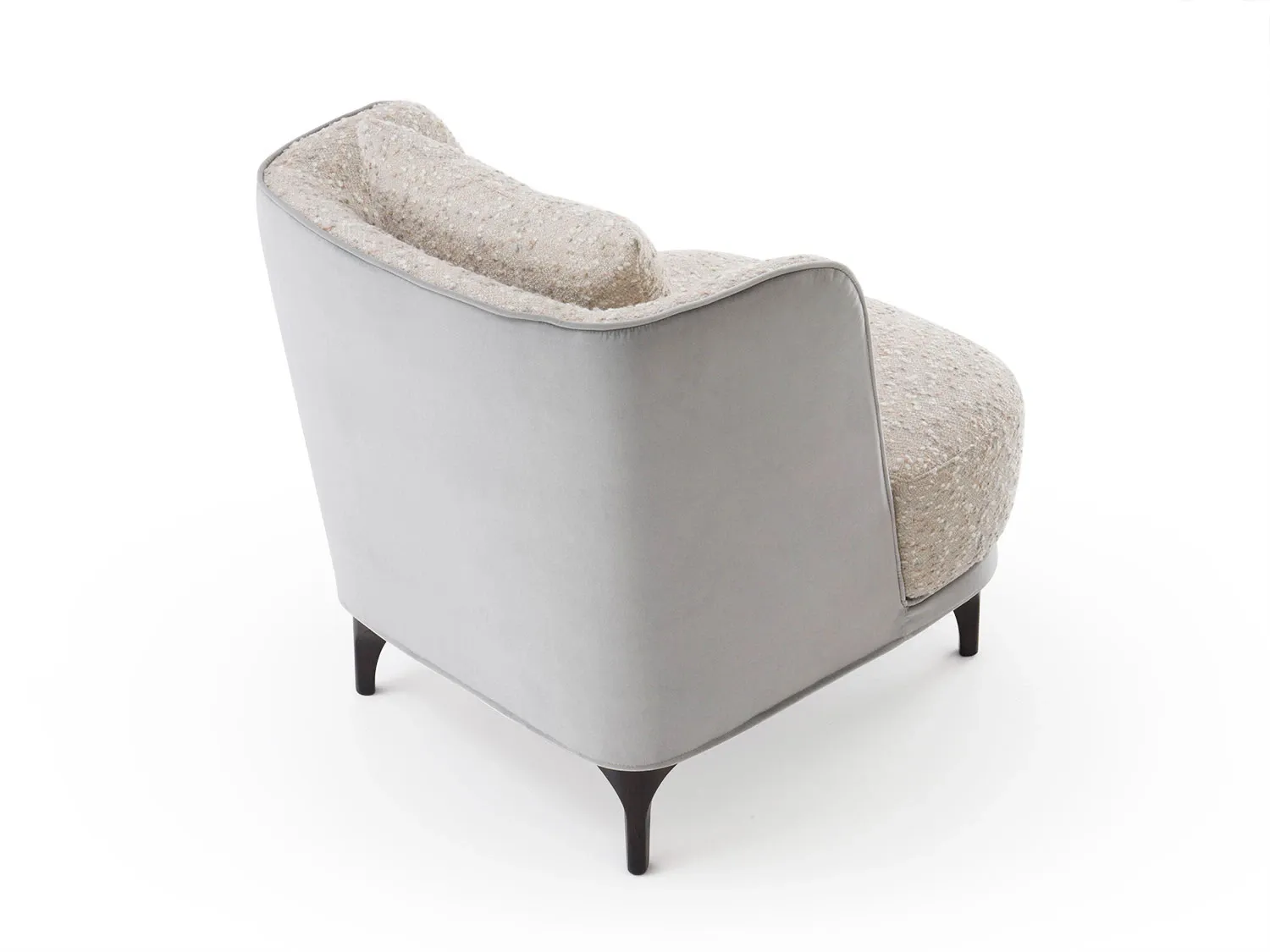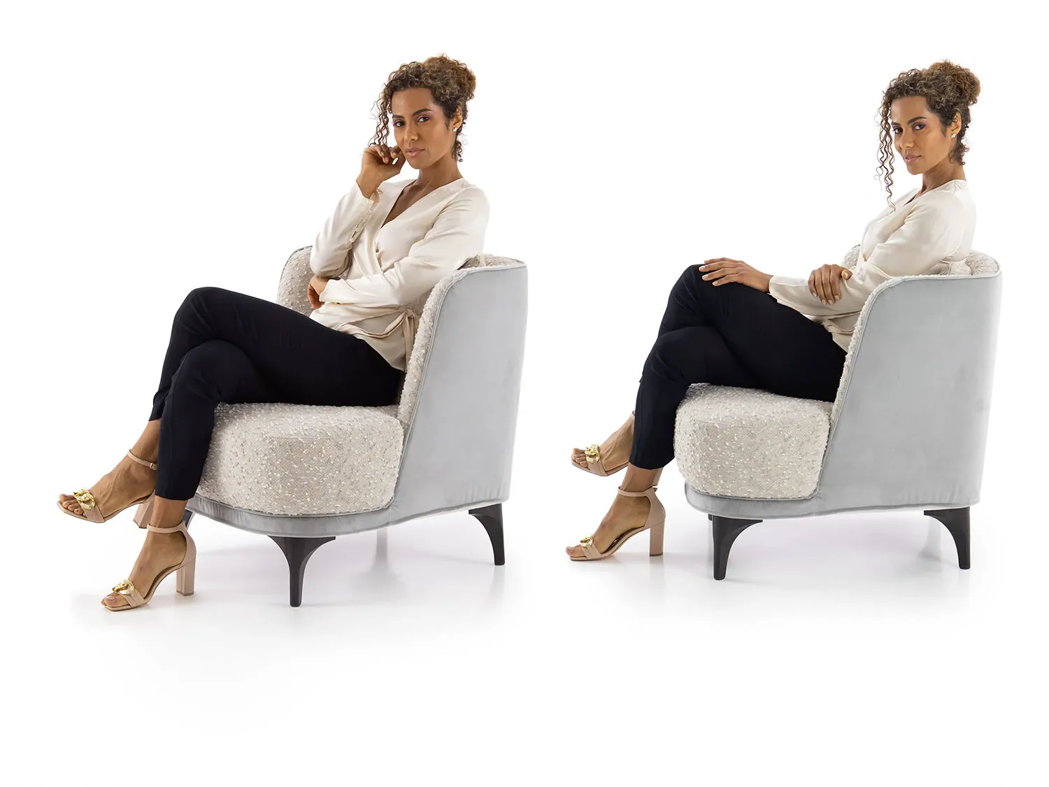Il rivestimento bicolore, raffinato e ricco di personalità, abbina con equilibrio un tessuto bouclé misto lana per l interno schienale e la seduta, a un velluto effetto scrivente utilizzato per la struttura e il retro schienale, creando un contrasto elegante che valorizza la poltrona Amanda Outlet.