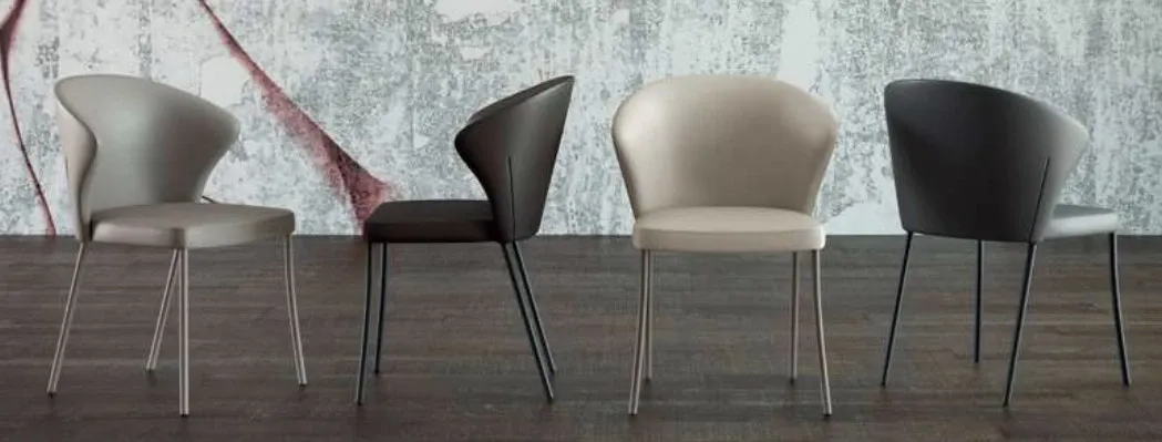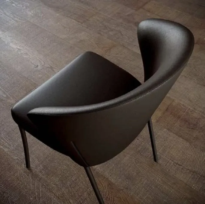 Poltroncina dalla seduta imbottita ed avvolgente in eco pelle o velvet, cuciture in tinta. Gambe curvate in metallo verniciato a sezione tonda.