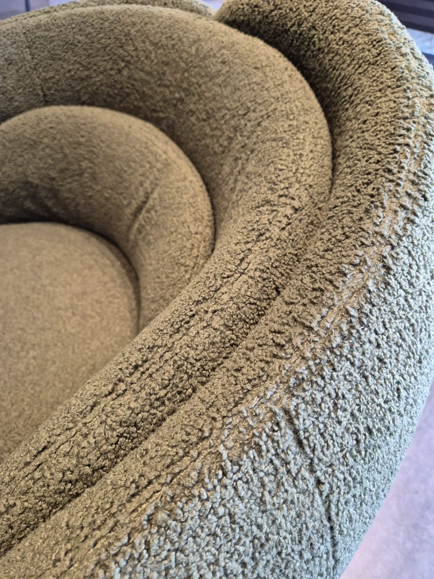Il rivestimento in tessuto categoria B, modello Acacia 14, caratterizzato da una tonalità calda e naturale, regala un senso di morbidezza e calore, invitando a rilassarsi e godersi momenti di pausa con stile. Il basamento fisso, rivestito con cura, aggiunge un tocco di eleganza discreta e una solida base, per un equilibrio perfetto tra design e funzionalità.