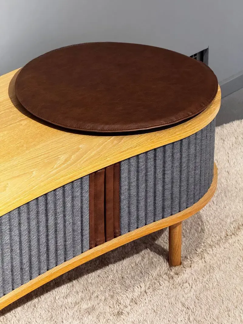 Questa composizione in rovere naturale e tessuto tecnico lavabile antracite è impreziosita da un cuscino di seduta in ecopelle marrone come i dettagli delle antine scorrevoli.
