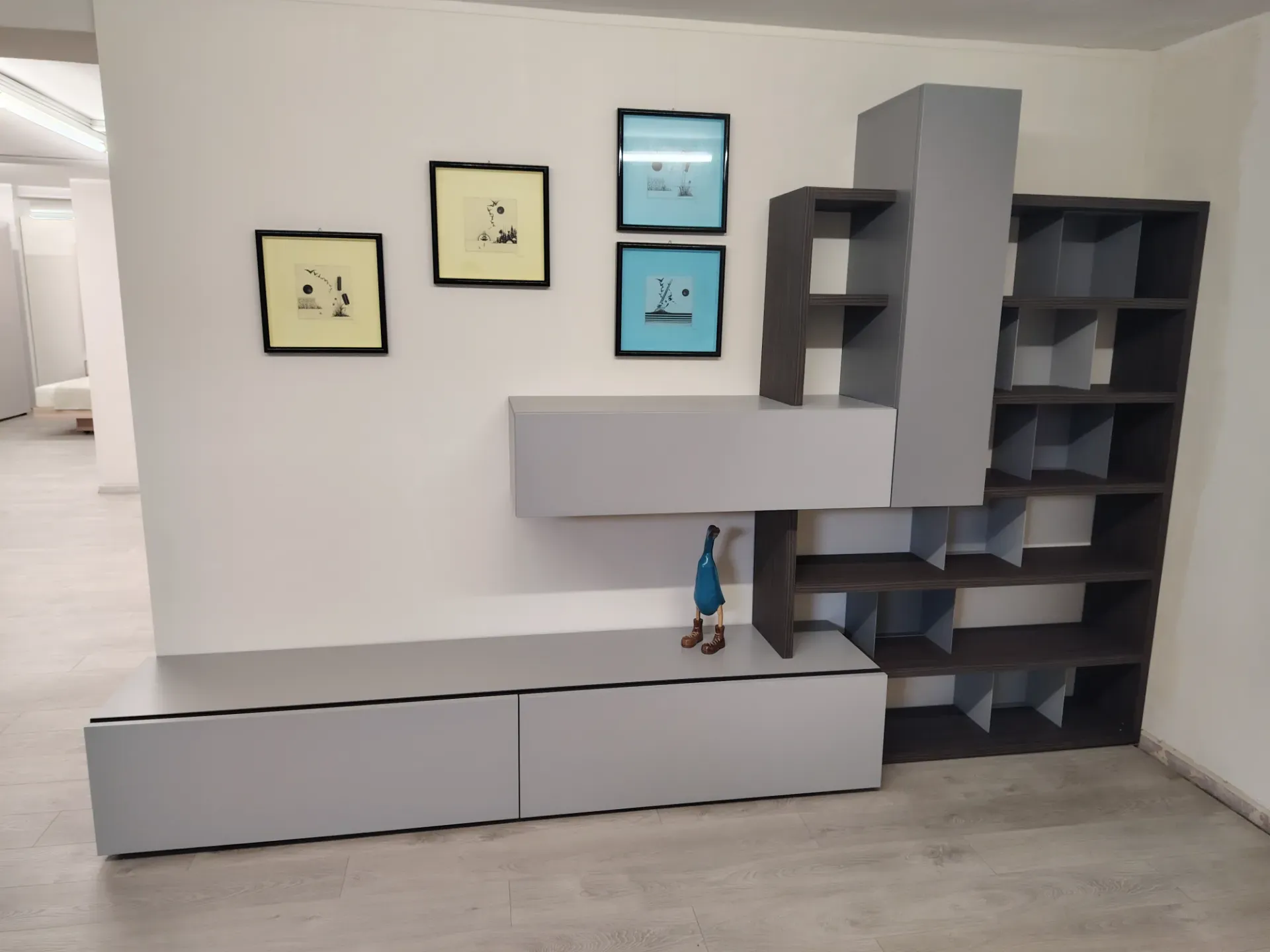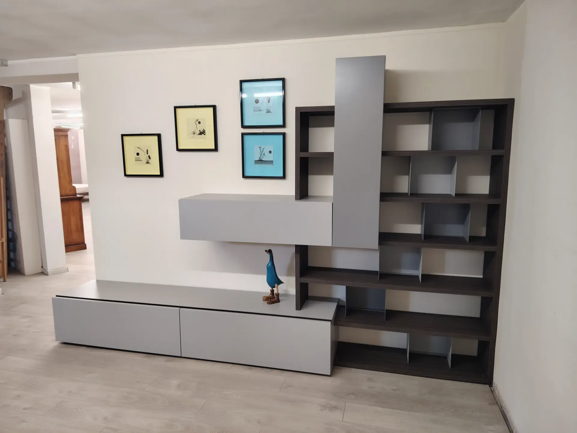Composizione Porta TV di dimensioni: LARGHEZZA 352 CM / ALTEZZA 195,5 - 224,5 / PROFONDITA' 51,6 - 46,5 - 34. - Mobile soggiorno porta Tv composto da elemento libreria senza schienale realizzato in laminato legno " Plisse' " con box in metallo che fungono da sostegno, finitura Laccato opaco Ferro / Grafite.