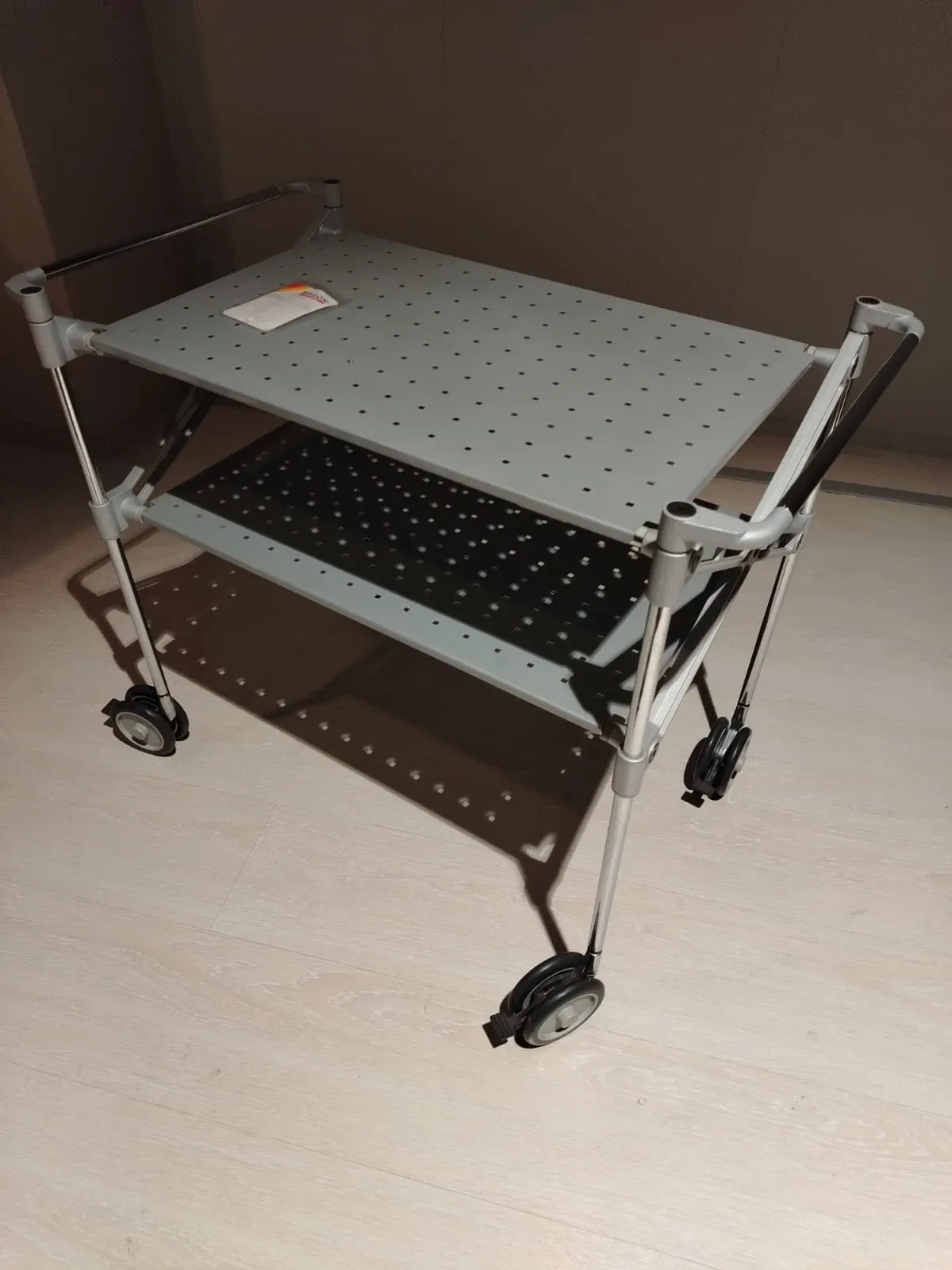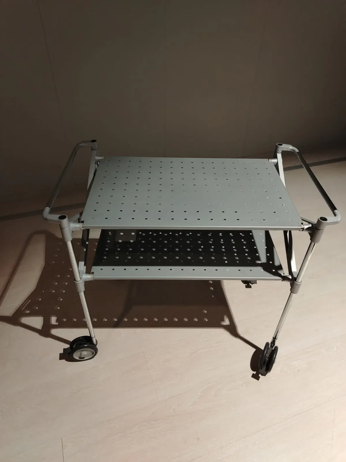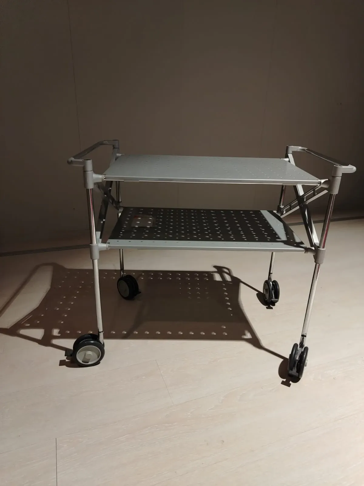 Carrello porta tv con doppio piano struttura cromata, piani in lamiera traforata finitura alluminio