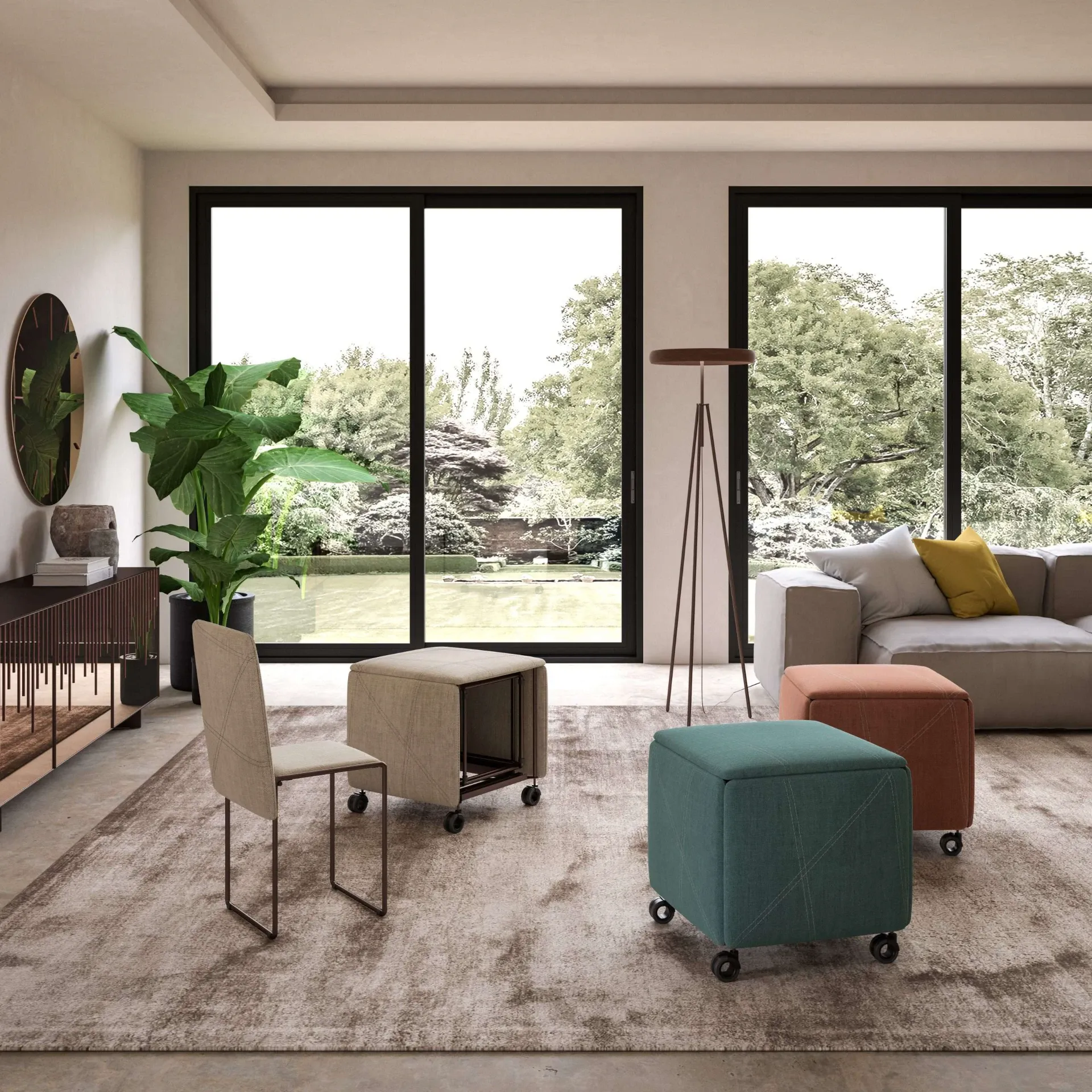 Pouf trasformabile dotato di quattro ruote per una facile movimentazione.