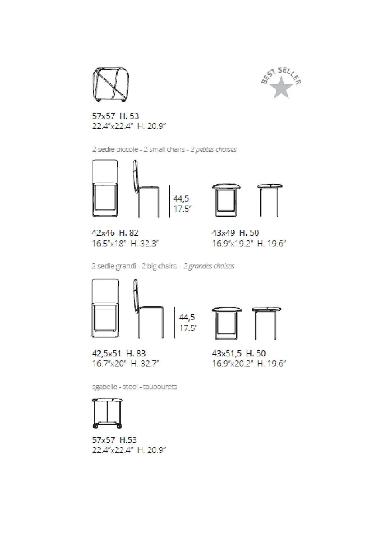 Contiene al suo interno 4 sedie pieghevoli con seduta e poggi schiena imbottita.