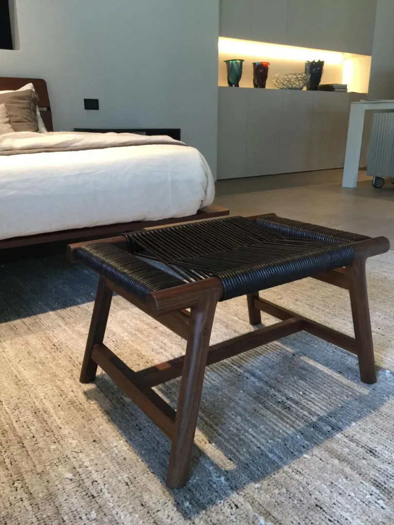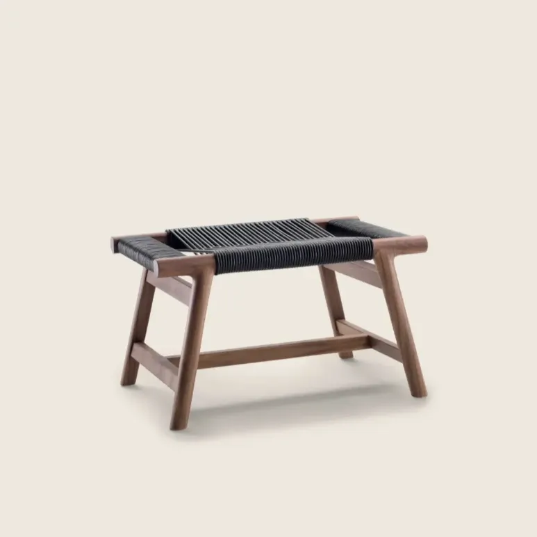 Un pouf di piccole dimensioni, ma dalla spiccata personalità. La pulizia formale del disegno si traduce in lavorazioni sapienti riconducibili alla tradizione ebanista. La struttura del pouf è interamente realizzata in legno massello proposto in un ampia gamma cromatica e presenta un elegante linea svasata che rende il pouf particolarmente leggero alla vista. La parte superiore presenta un originale quanto sofisticata lavorazione con un particolare intreccio eseguito interamente a mano e realizzato con un cordoncino di cuoio. Il pouf Giano è un oggetto bello e funzionale che può costituire un pratico accessorio per completare l'arredo dello spazio living.