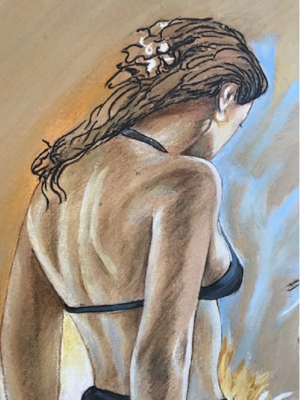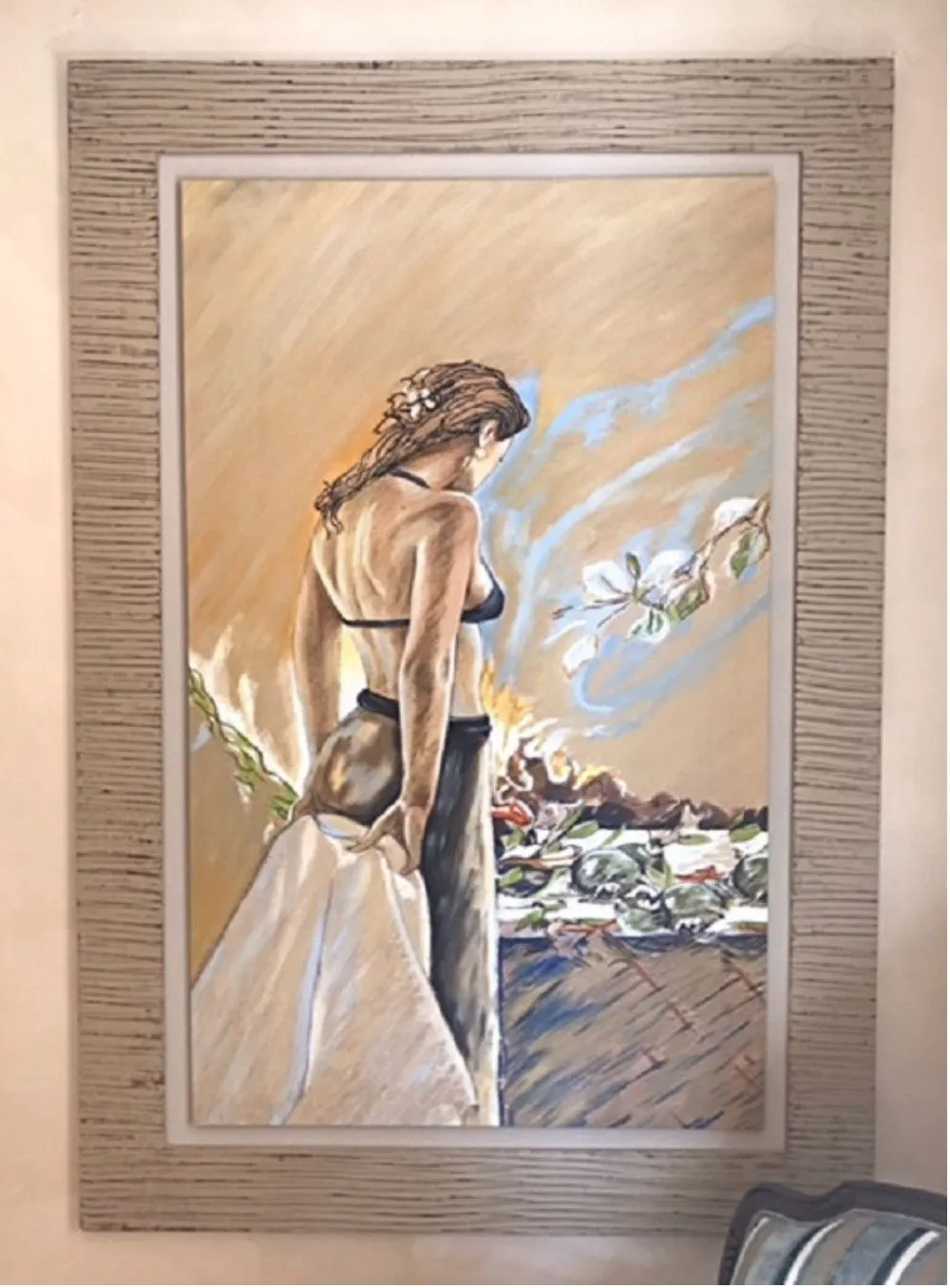 Quadro Donna Vinciguerra Shop Collection olio su tela, con cornice in legno, raffigurante una donna vista di spalle. Sullo sfondo si vede un ramo con dei fiori e altri elementi naturali.
