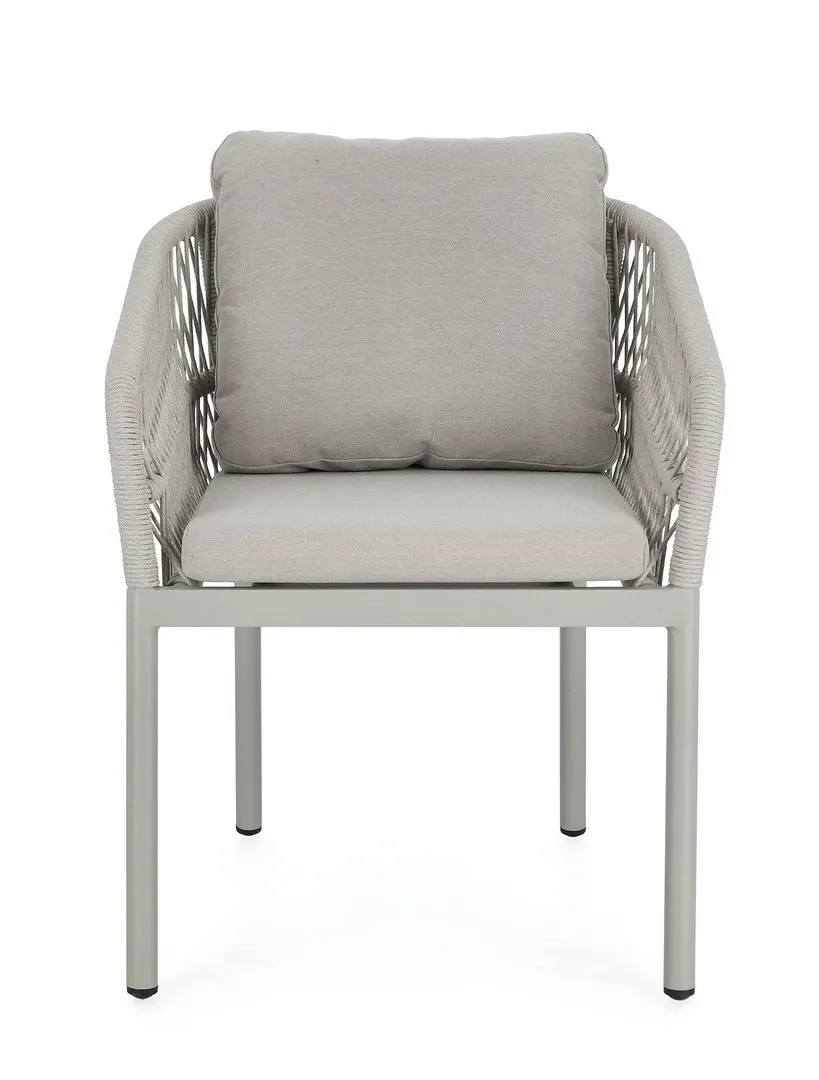 STRUTTURA IN ALLUMINIO VERNICIATA A POLVERE (POLIESTERE). INTRECCIO PER ESTERNO IN CORDA POLIESTERE. CUSCINI SFODERABILI IN TESSUTO IDROREPELLENTE 100% POLIESTERE. IMPILABILE. Misure: Larghezza 62 cm, profondità 66 cm, altezza 78 cm.