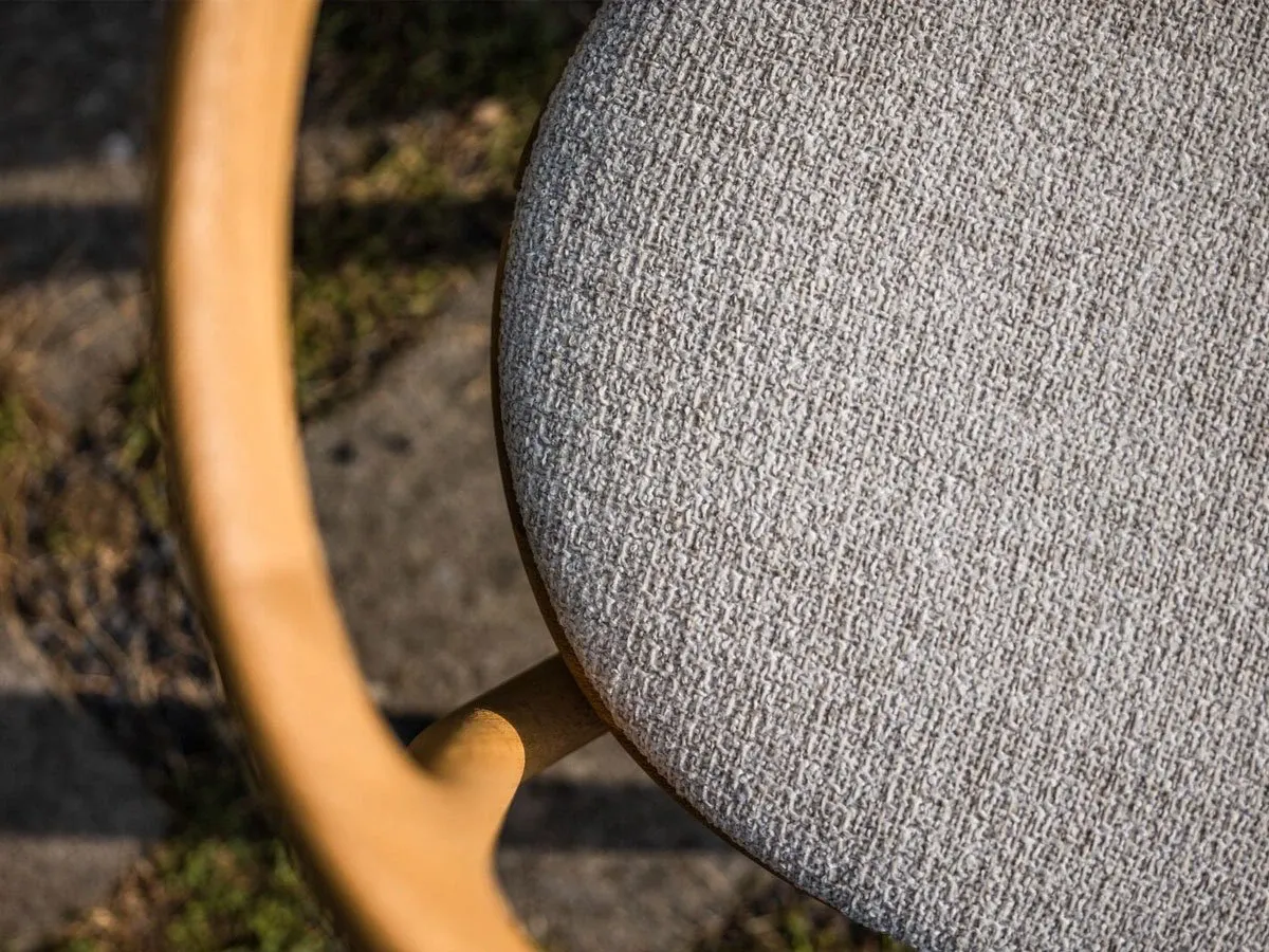 La Poltroncina Himba Outdoor Baxter è caratterizzata dalla struttura in massello di iroko naturale sabbiato con finitura a olio e dalla cuscinatura in poliuretano espanso a densità unica in viscofibra con fodera idrorepellente per outdoor. Il cuscino di seduta è predisposto per aggancio schienali tramite magneti.