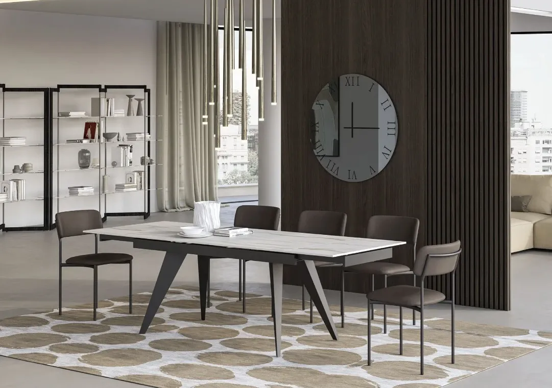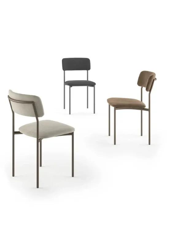 Sedia dalle linee moderne, con struttura in metallo e seduta rivestita in ecopelle, velvet o tessuto Bon. Un design stilizzato e contemporaneo, in linea con le ultime tendenze, per un ambiente dallo stile sofisticato.