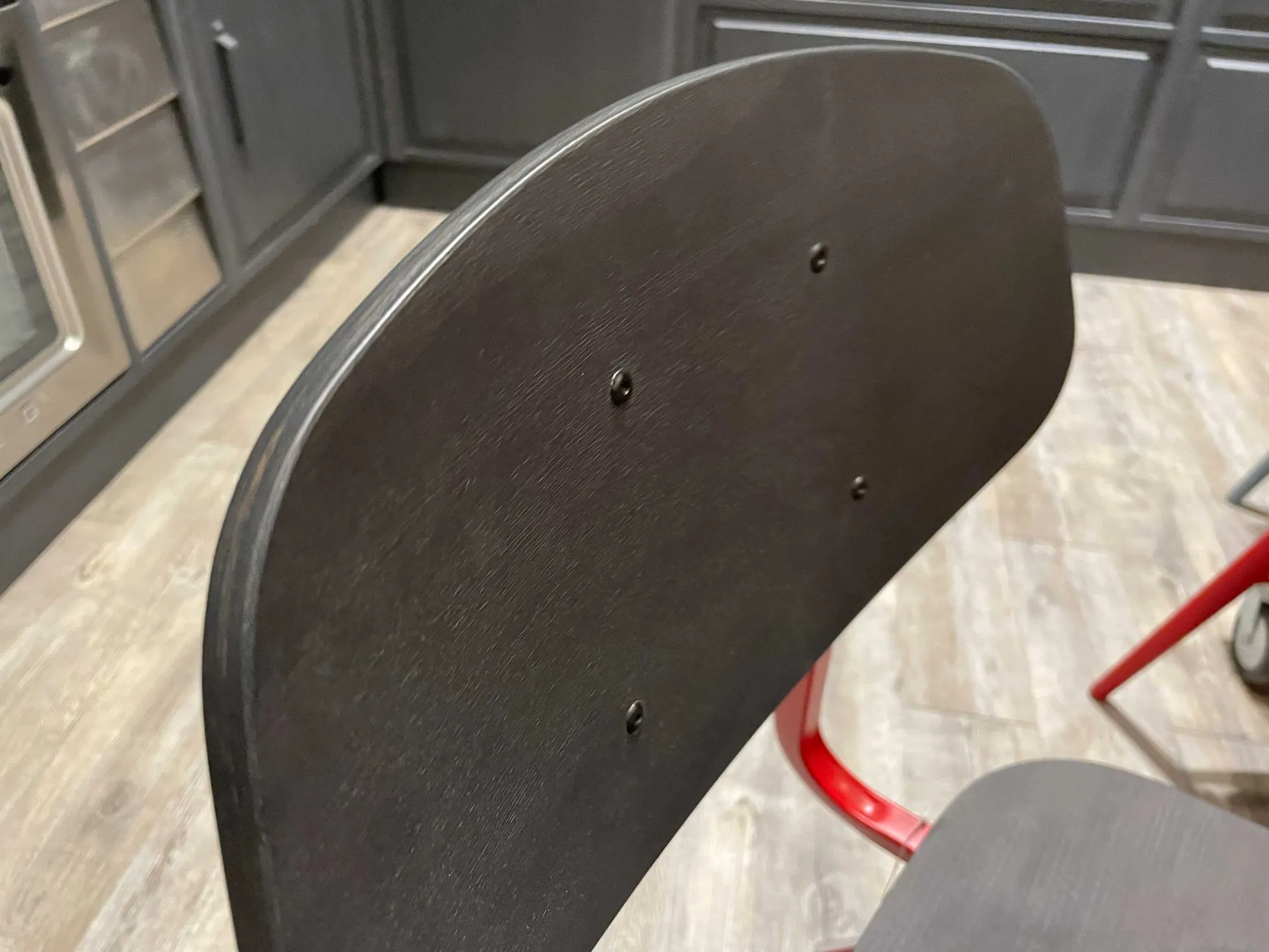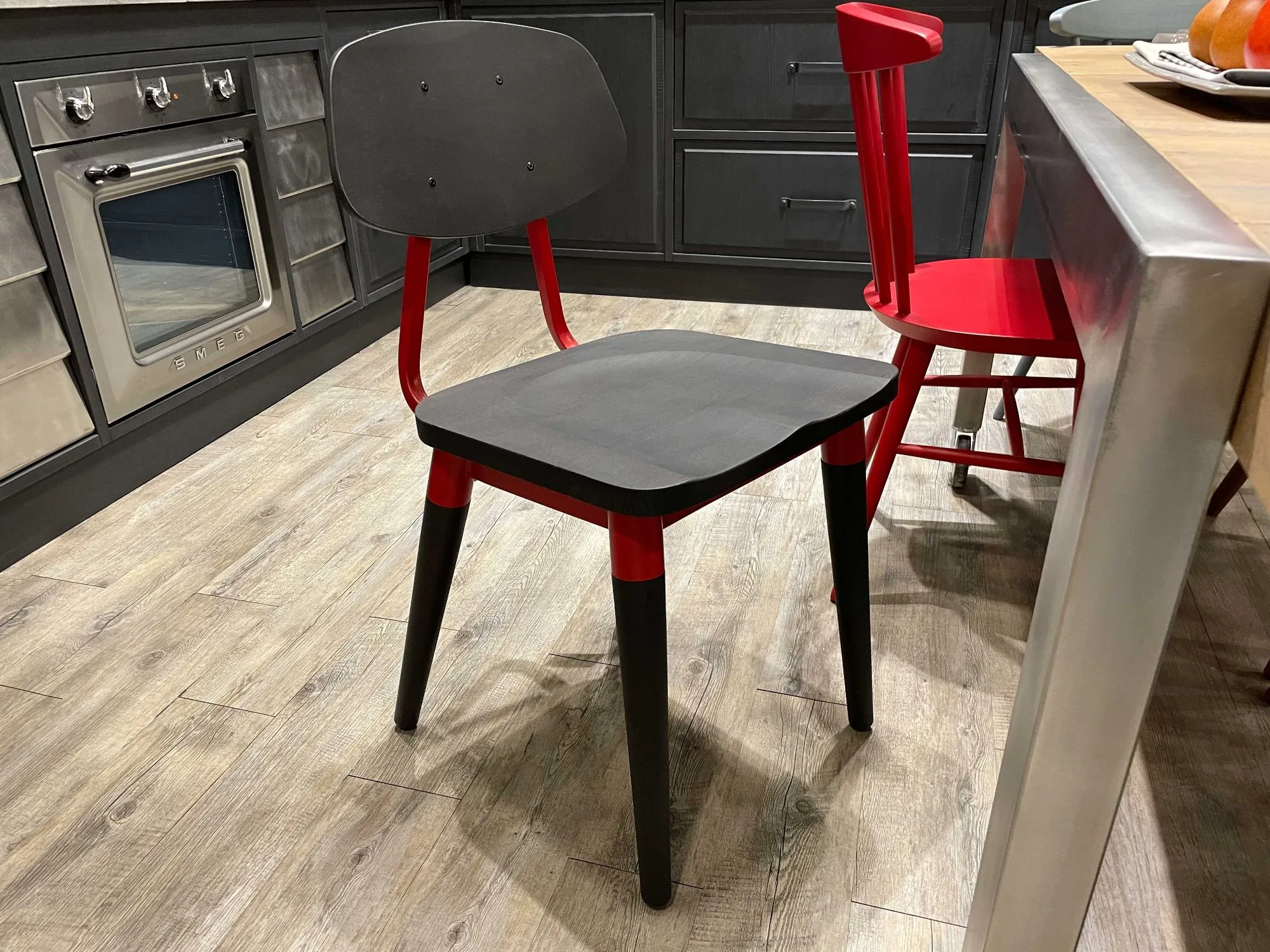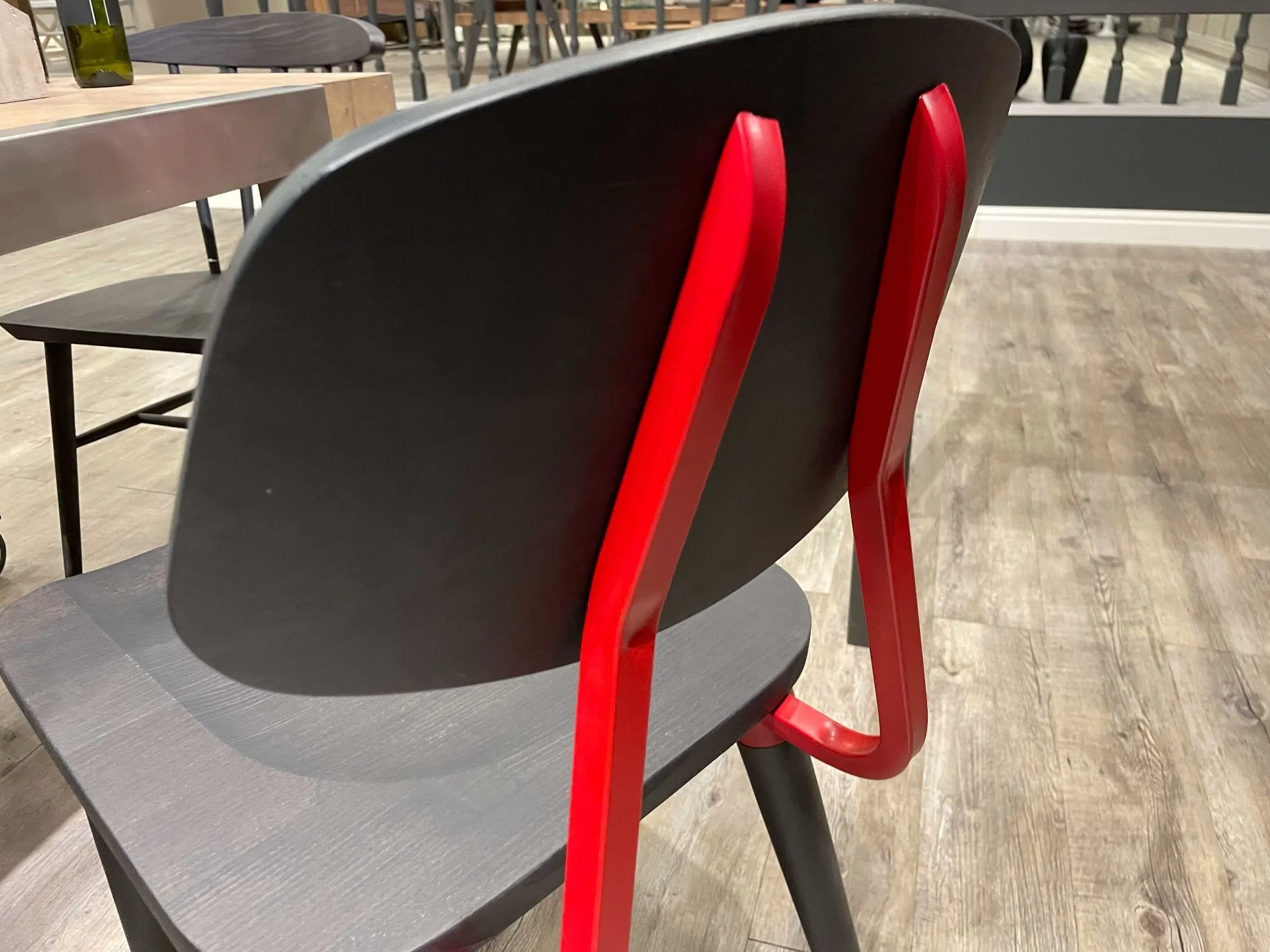 DB004081_SEDIA H.83 L.43X51 REALIZZATA IN LEGNO DI FAGGIO DI COLORE NERO VINTAGE, STRUTTURA IN METALLO DI COLORE ROSSO.