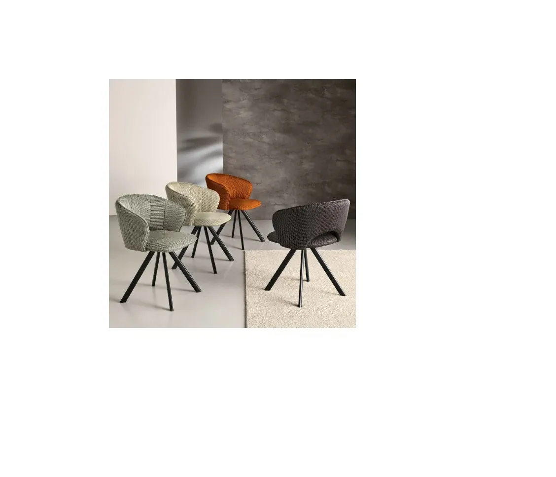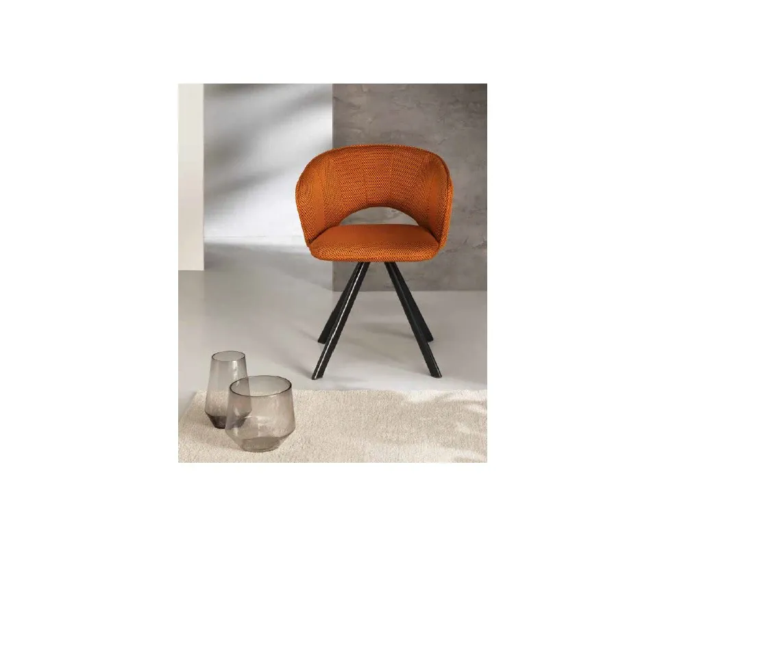 Scopri il perfetto equilibrio tra comfort e design. Questa sedia imbottita conquista al primo sguardo grazie allo schienale avvolgente con braccioli integrati, arricchito da eleganti impunture verticali che donano carattere e raffinatezza. La struttura in metallo verniciato nero, con le gambe che si aprono dal centro verso il pavimento, crea una linea dinamica e contemporanea, capace di valorizzare qualsiasi ambiente.