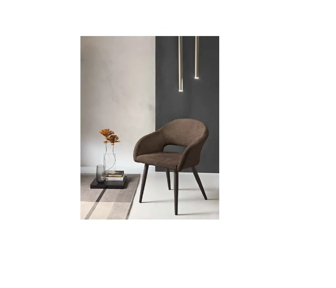 Comfort e stile in perfetto equilibrio. Questa sedia imbottita in tessuto unisce morbidezza e design funzionale: lo schienale arrotondato si apre nella zona lombare, creando un dettaglio visivo che alleggerisce la struttura e invita a sedersi. I braccioli integrati seguono con continuità la seduta imbottita, mentre la solida base in metallo verniciato completa il profilo con eleganza e sobrietà.