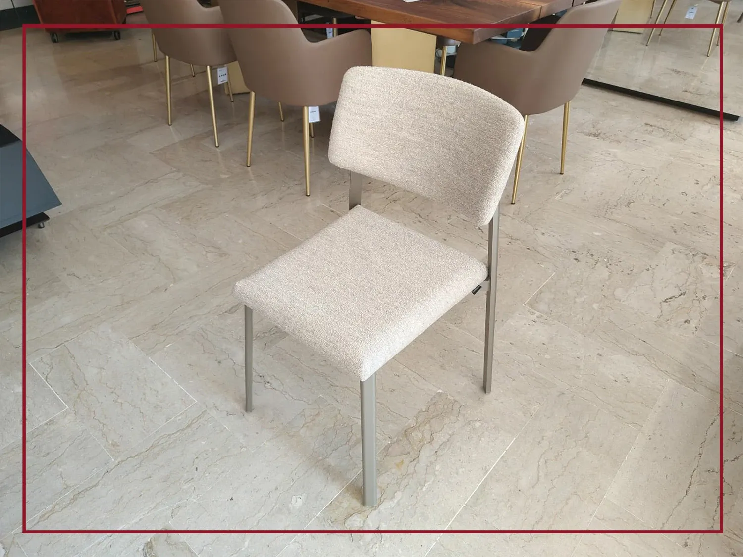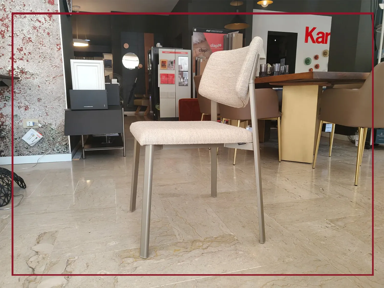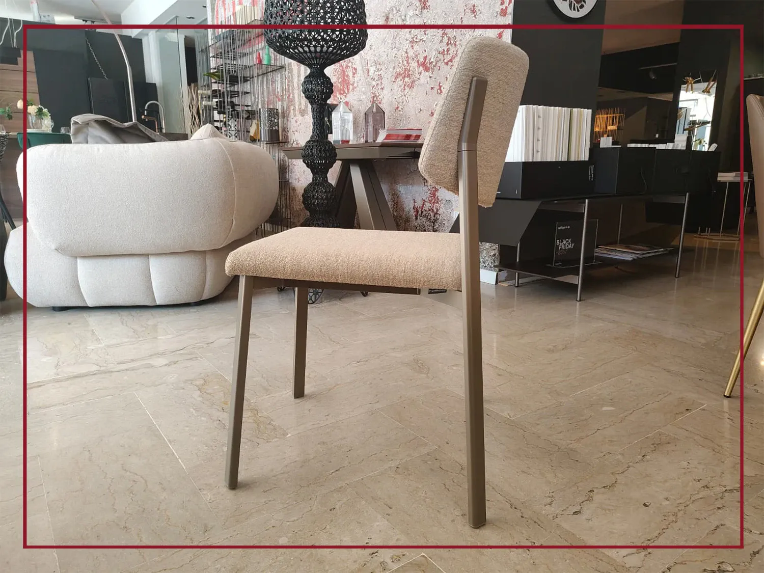 La struttura è realizzata in alluminio estruso verniciato, leggera ma resistente, con un sistema di fissaggio dello schienale privo di viti a vista, che dona alla sedia un profilo pulito e sofisticato.