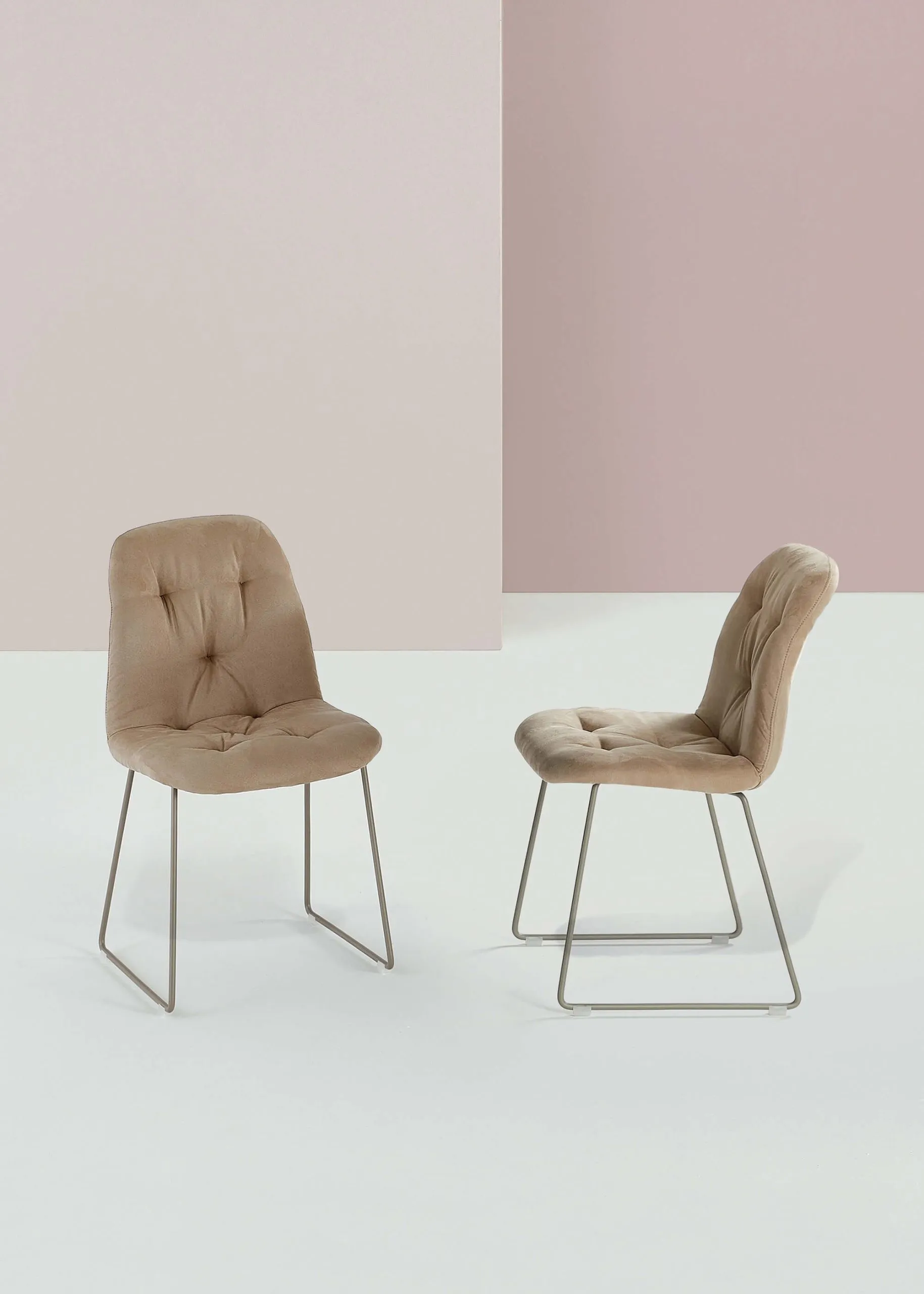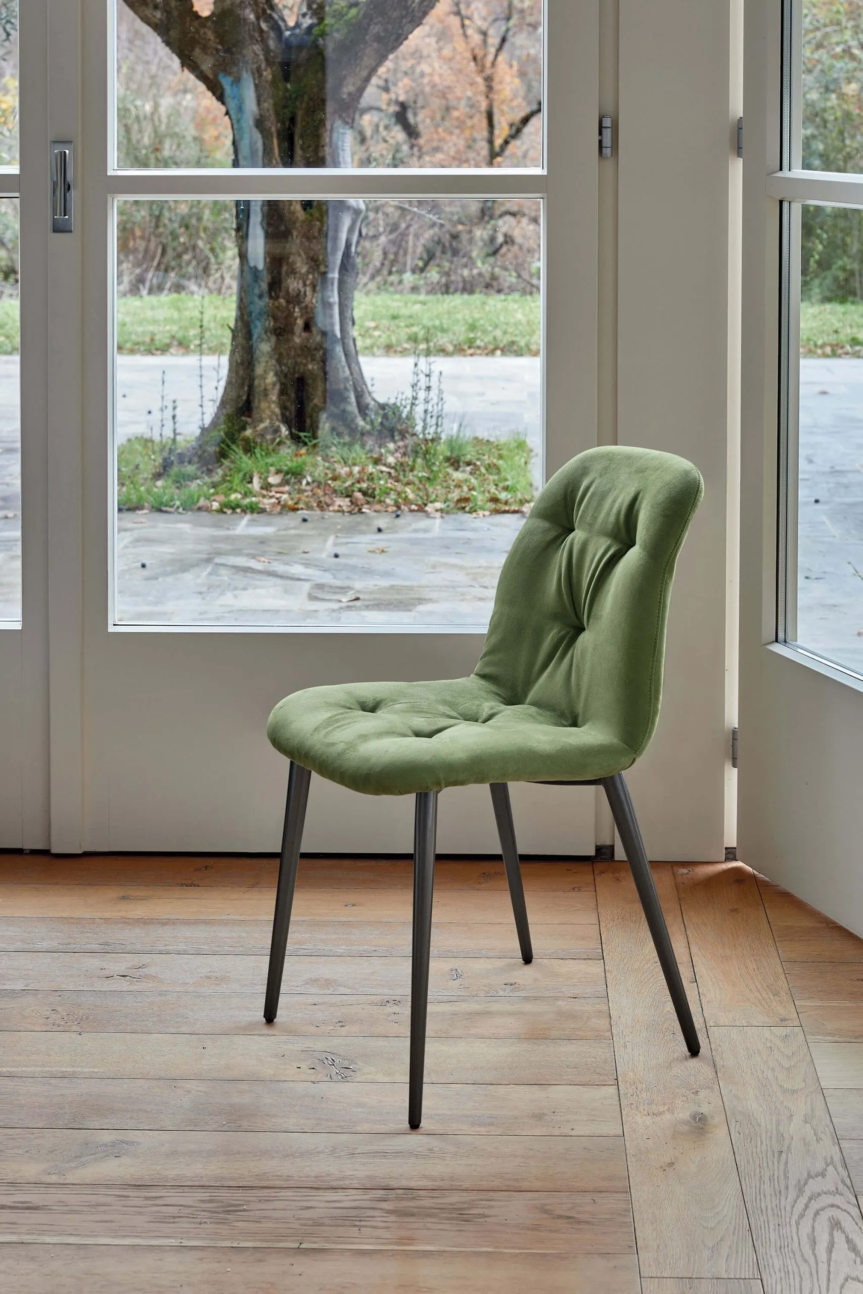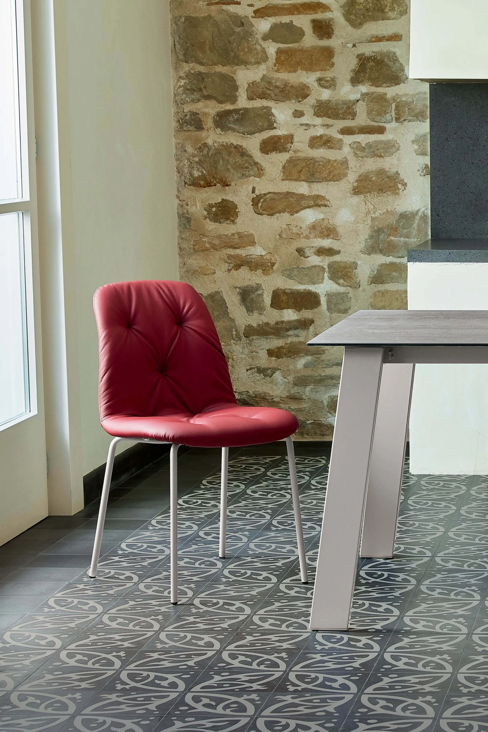 Il suo carattere è tutto nella scocca imbottita: la seduta avvolge senza appesantire, con un profilo morbido che rompe la linearità della struttura in acciaio. Le gambe a sezione tonda in acciaio laccato sono il dettaglio che distingue questa versione un tocco più raffinato rispetto alla sezione quadra, che alleggerisce visivamente la sedia e le dà un'aria più contemporanea.
