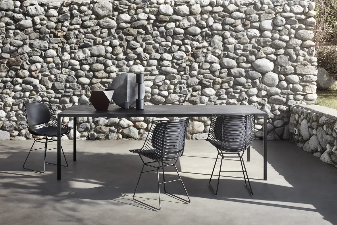 La versione da interno si caratterizza per finiture lucide e raffinate, come il cromo nero o il nichel, che esaltano la purezza del disegno. Nonostante l apparente leggerezza, la sedia è solida e ben bilanciata, con una base a slitta che contribuisce alla sua stabilità e le dona un aria quasi sospesa.