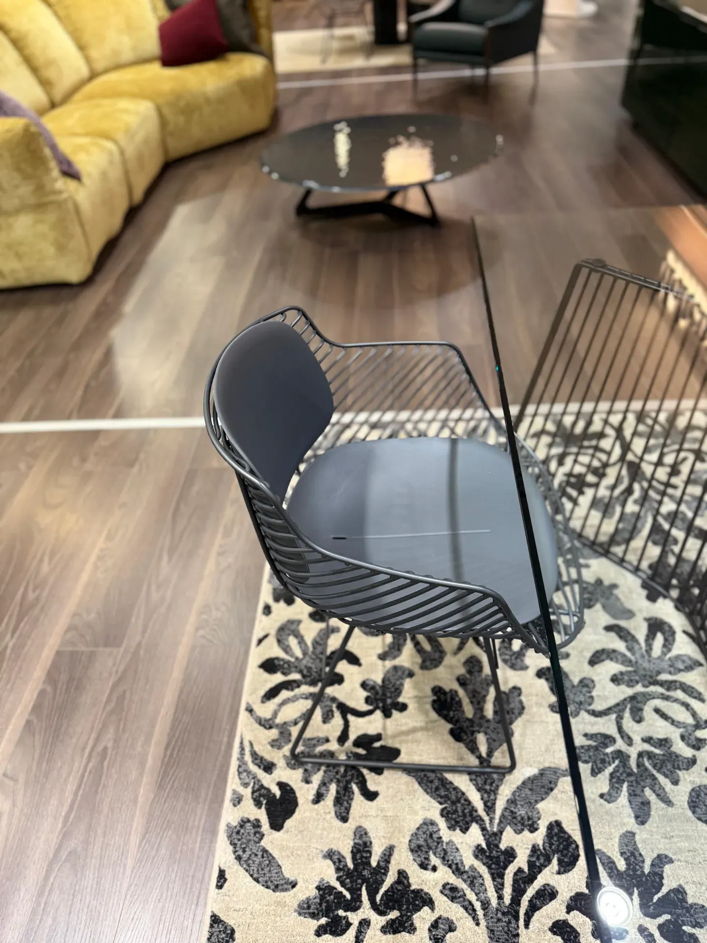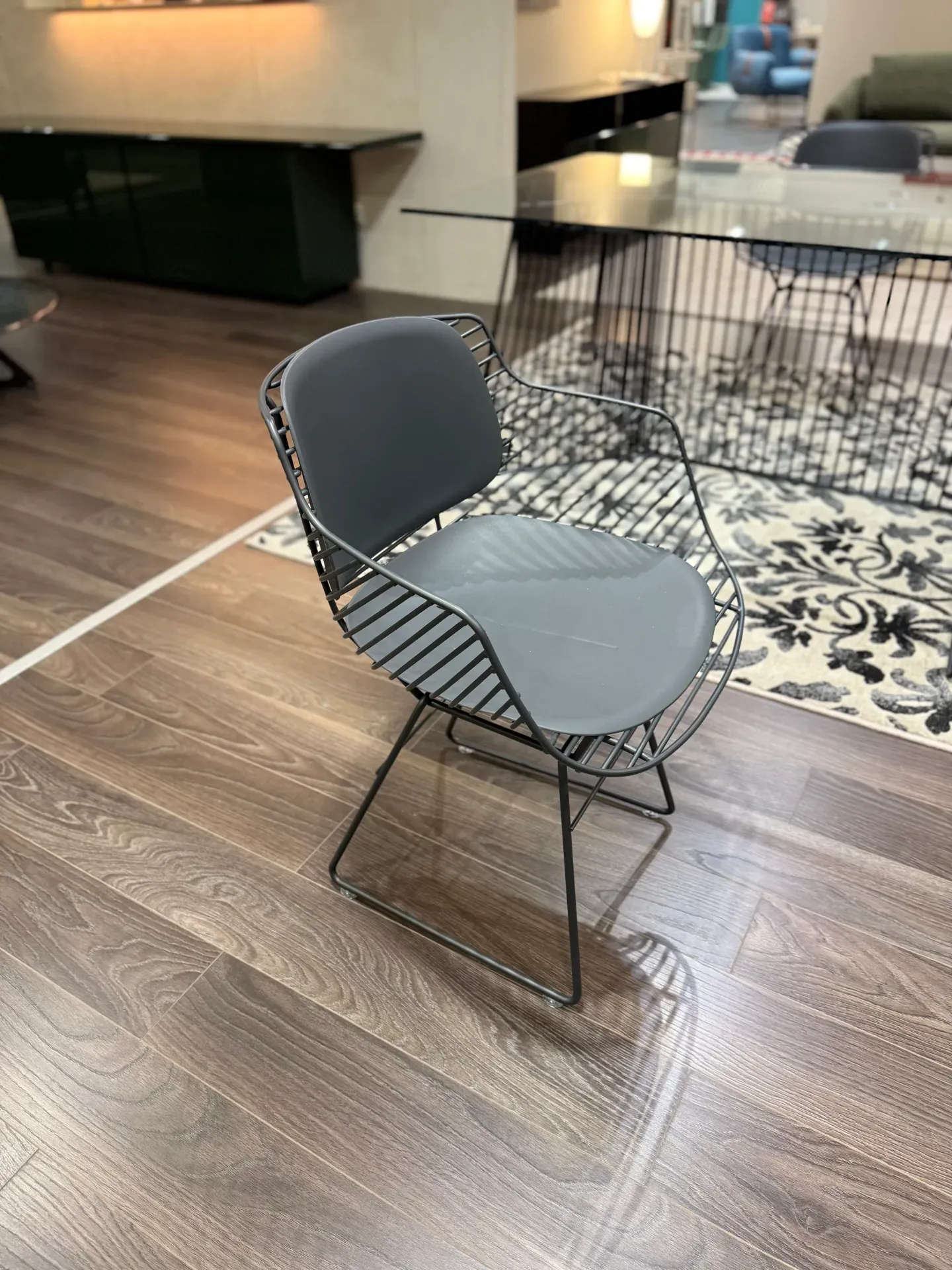 Un elemento distintivo della Flow Filo è la possibilità di personalizzazione: può essere utilizzata nuda, mettendo in risalto la geometria del metallo, oppure arricchita con cuscini in cuoio imbottito, disponibili sia per la seduta che per lo schienale. I pad, realizzati in cuoio pieno fiore conciato al vegetale, aggiungono comfort e un tocco di calore materico, creando un contrasto interessante con il rigore della struttura in metallo.