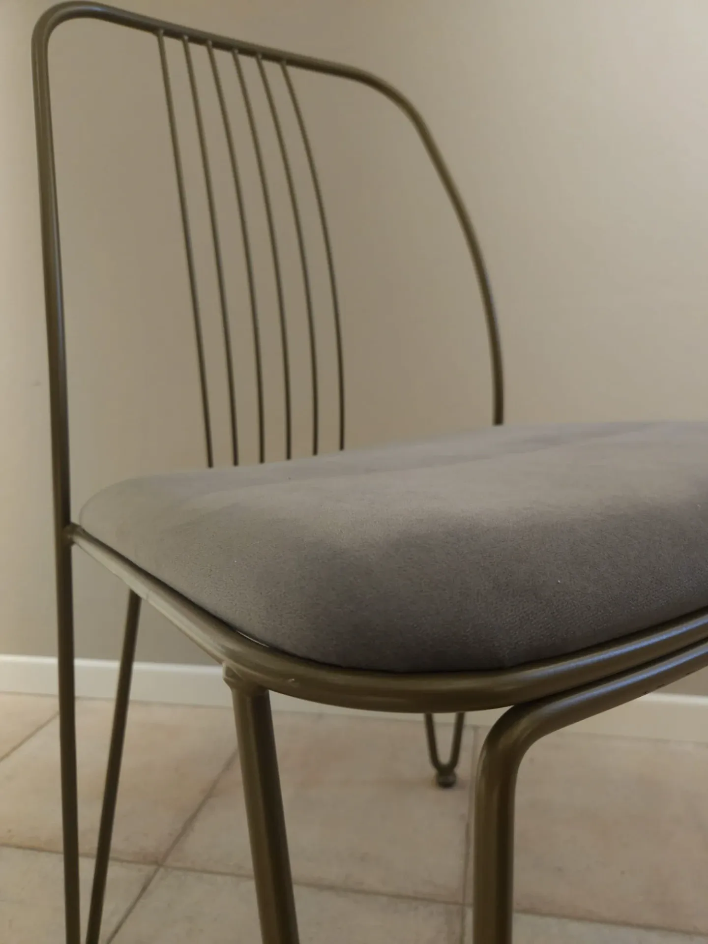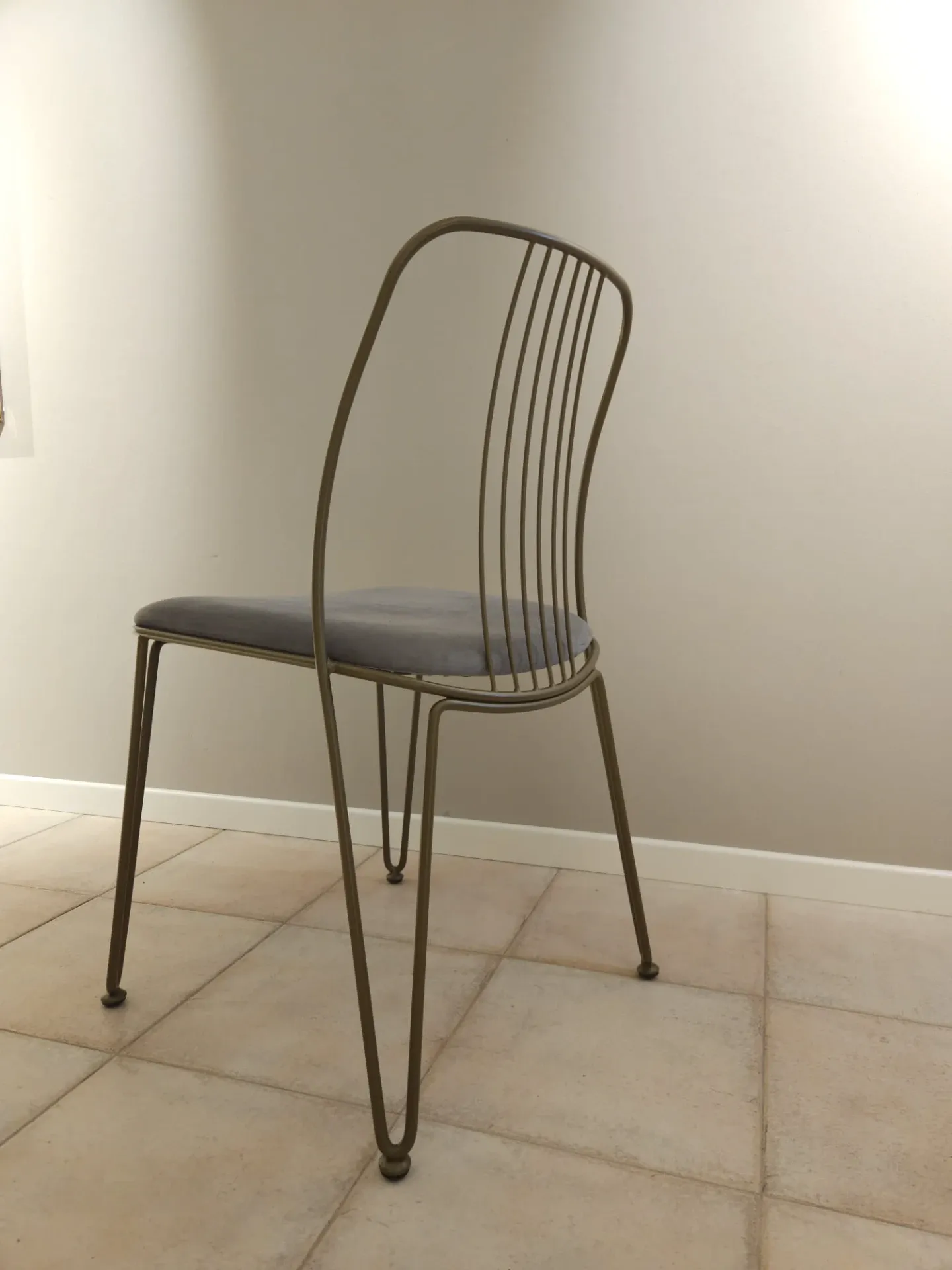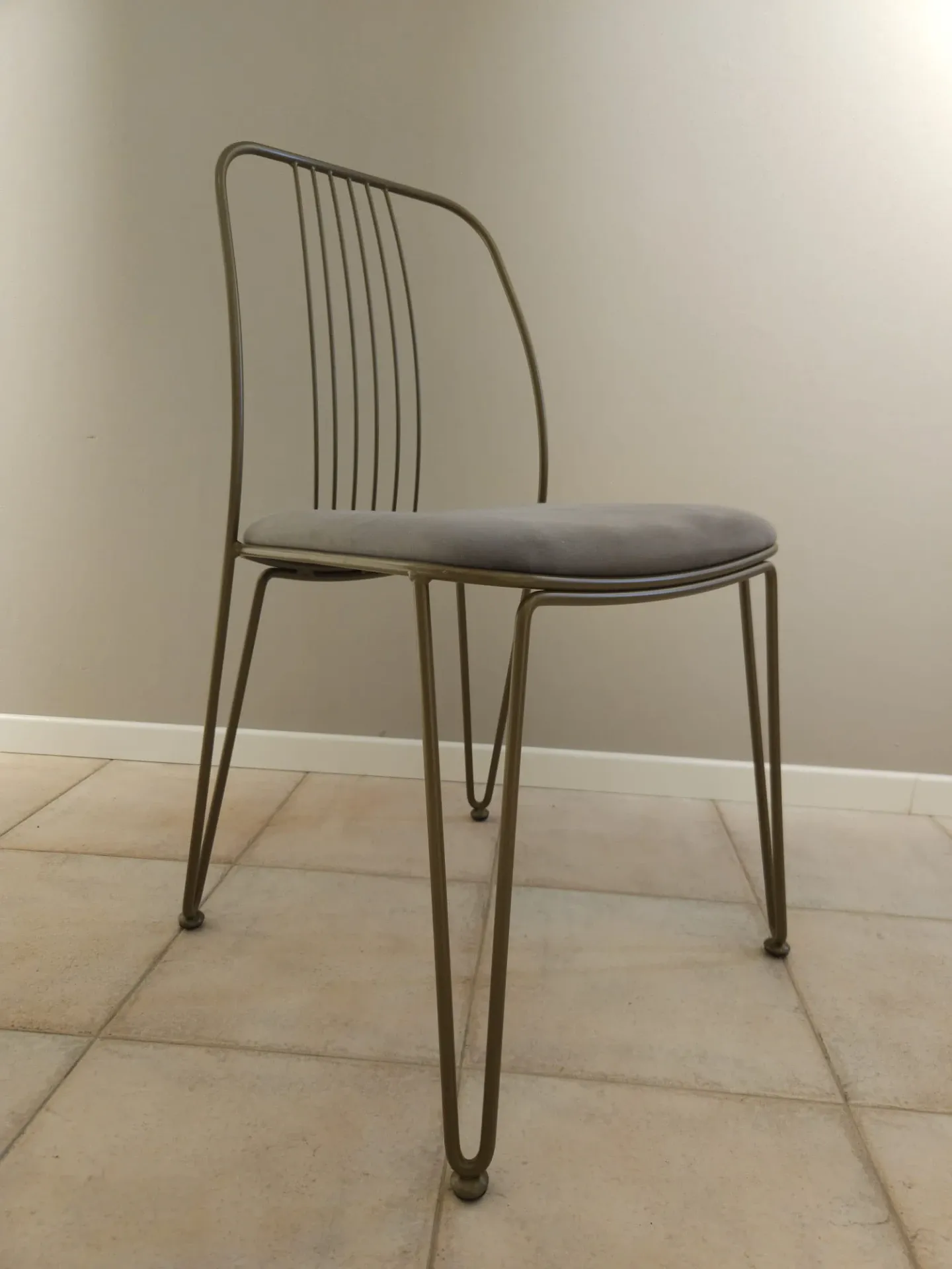 Sedia con struttura in metallo verniciato bronzo e seduta rivestita in morbida microfibra effetto velluto grafite.