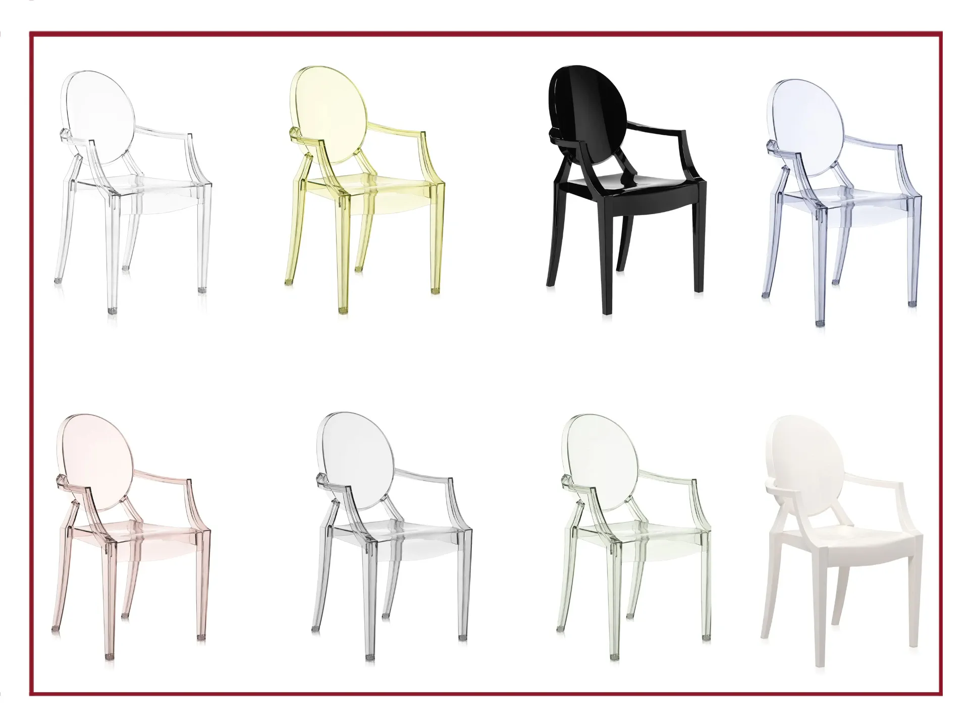 Louis Ghost è il più coraggioso esempio al mondo d iniezione del policarbonato in un unico stampo. Una seduta ispirata alle linee della poltroncina Luigi XV, l'ideotipo del barocco, che Philippe Starck ha saputo reinterpretare per stupire, emozionare, affascinare. Nonostante l immagine evanescente e cristallina, Louis Ghost è stabile e resistente, a prova di urti e agenti atmosferici, impilabile fino a 6 pezzi. Un prodotto dal forte carisma e dal notevole appeal estetico, da inserire in ogni contesto, abitativo o collettivo.