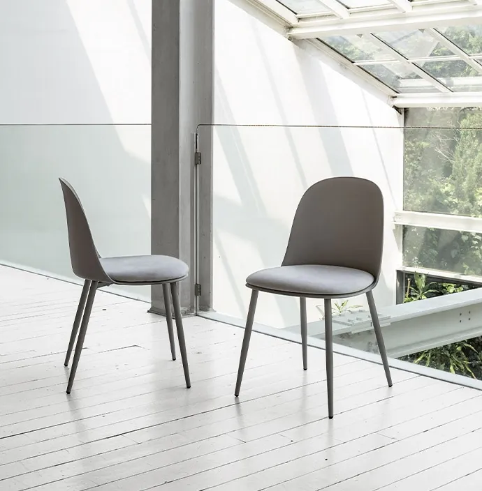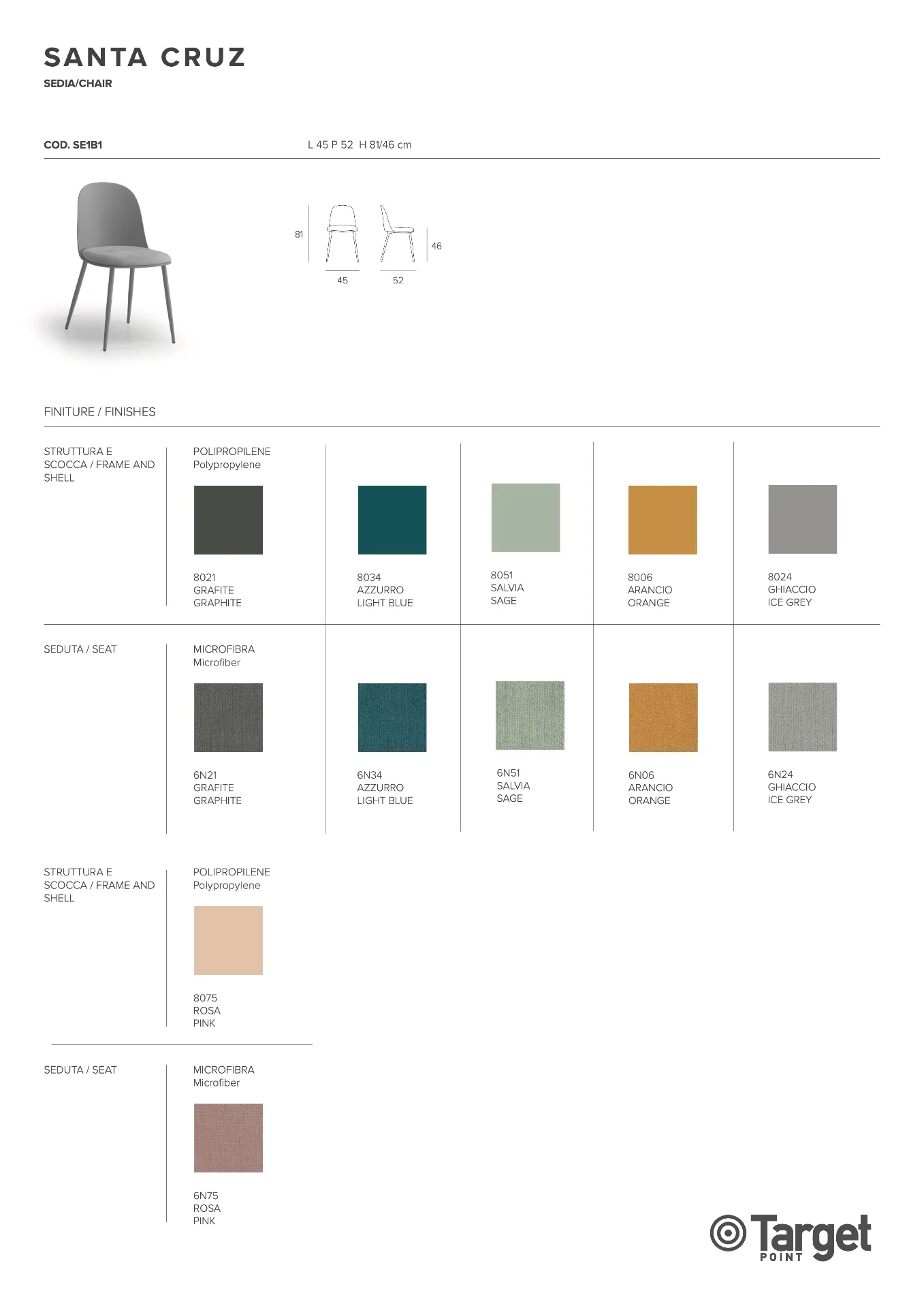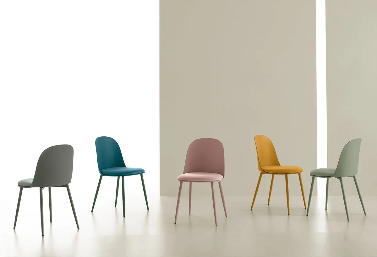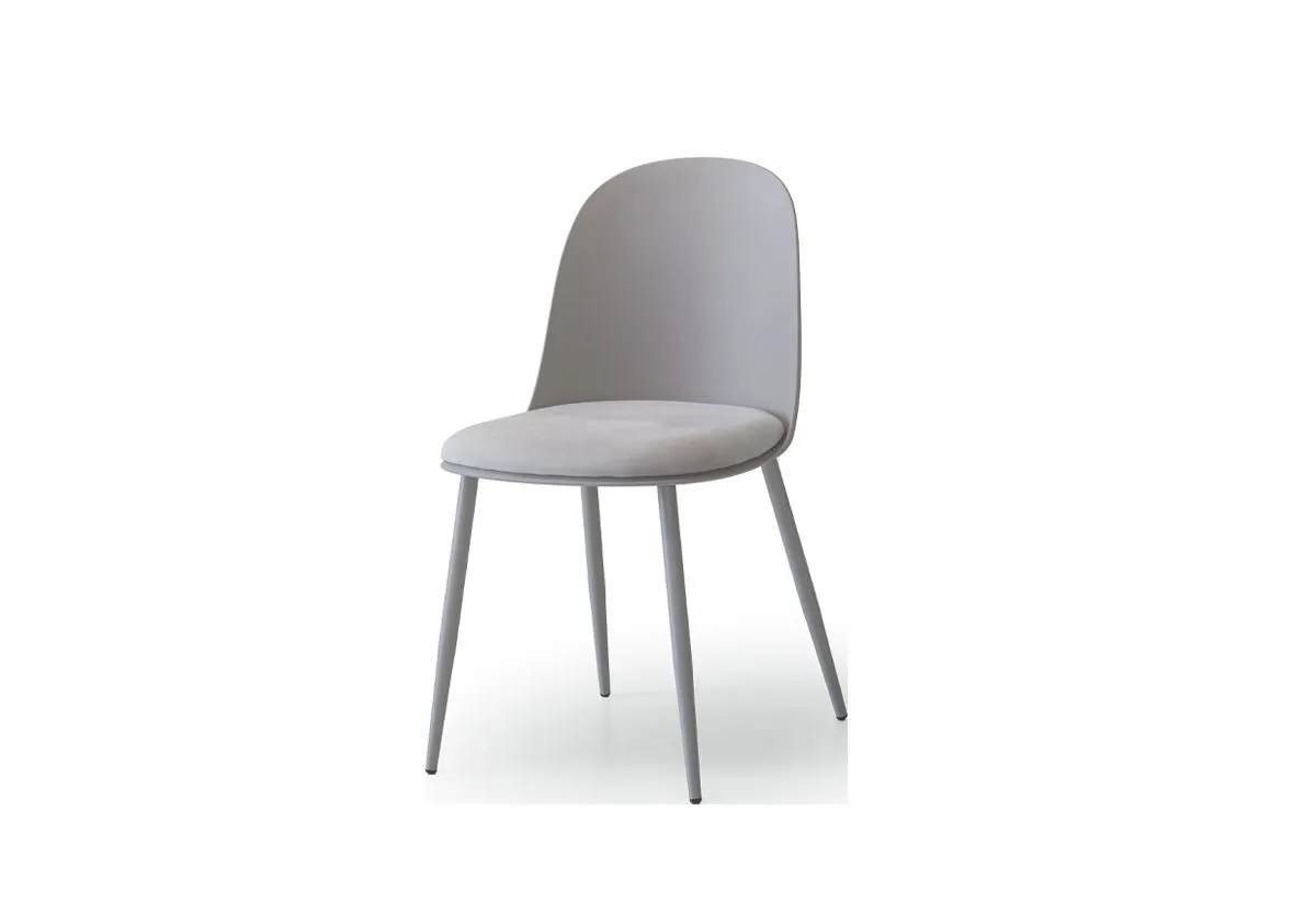 Sedia in polipropilene con cuscino imbottito e rivestito in morbida microfibra effetto velluto.