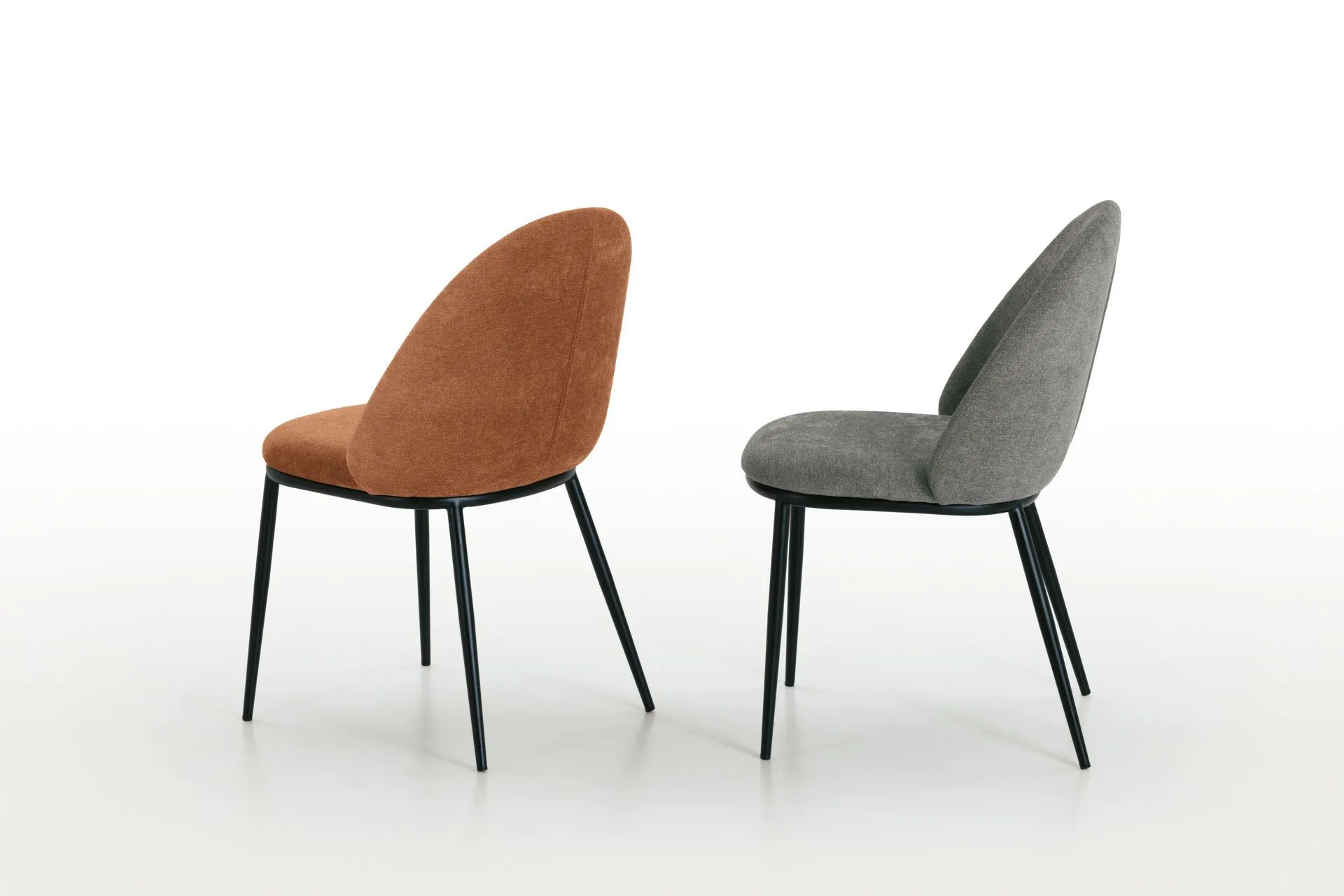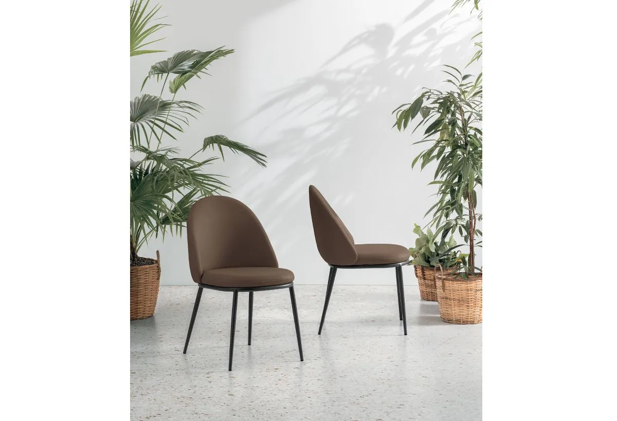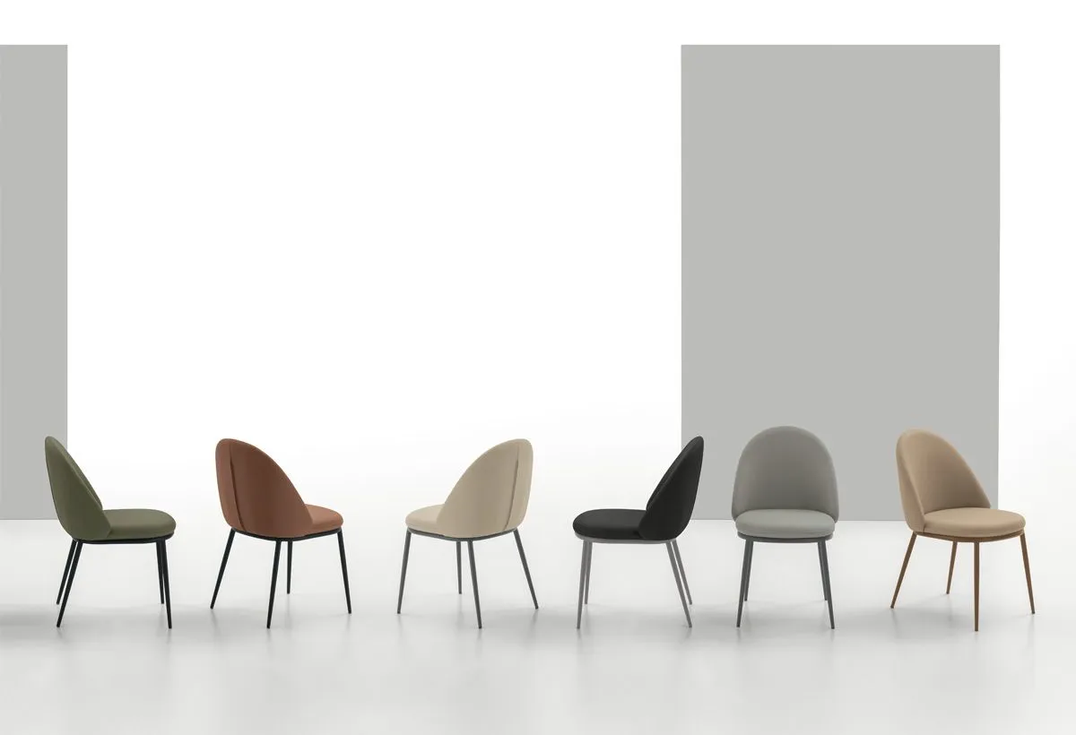 Sedia con struttura in metallo e seduta e schienale imbottiti. Disponibile con rivestimento in morbido tessuto Easy-Touch effetto pelle oppure nel nuovo tessuto Mellow Blend, soffice e resistente, che esalta il comfort della seduta.