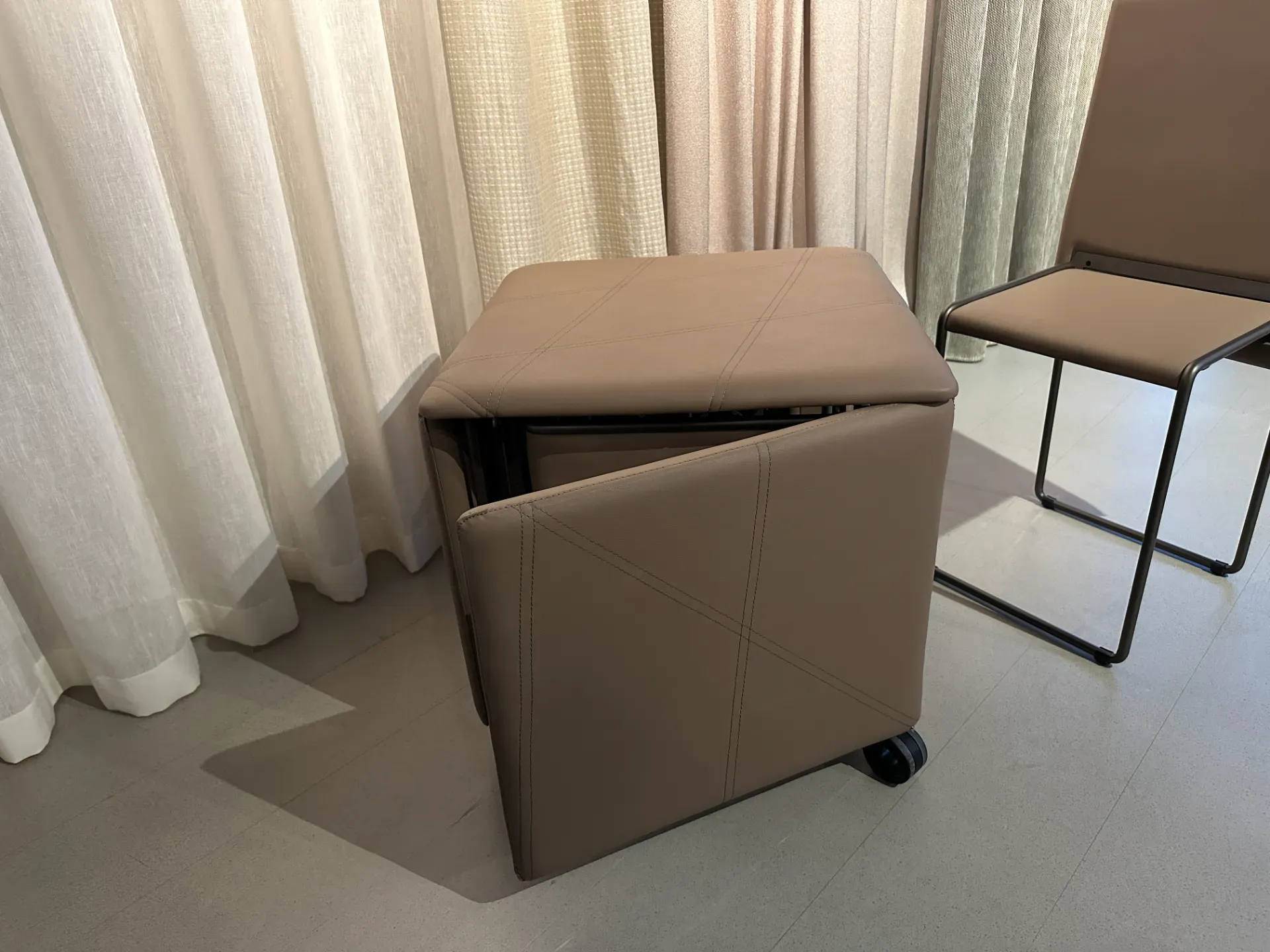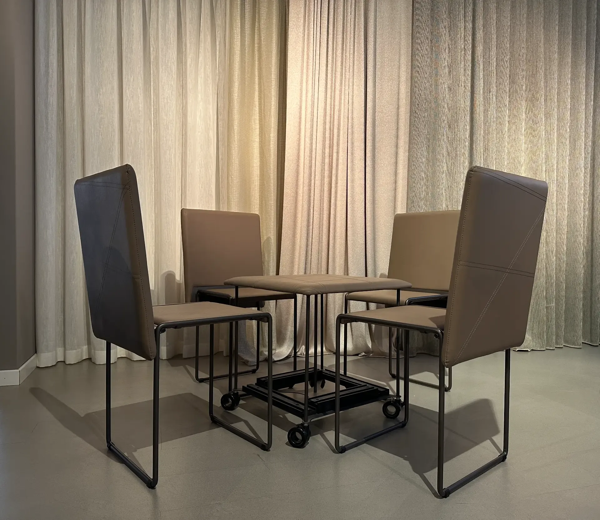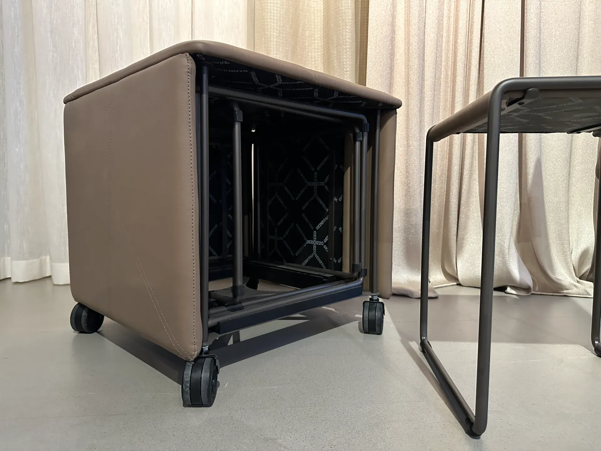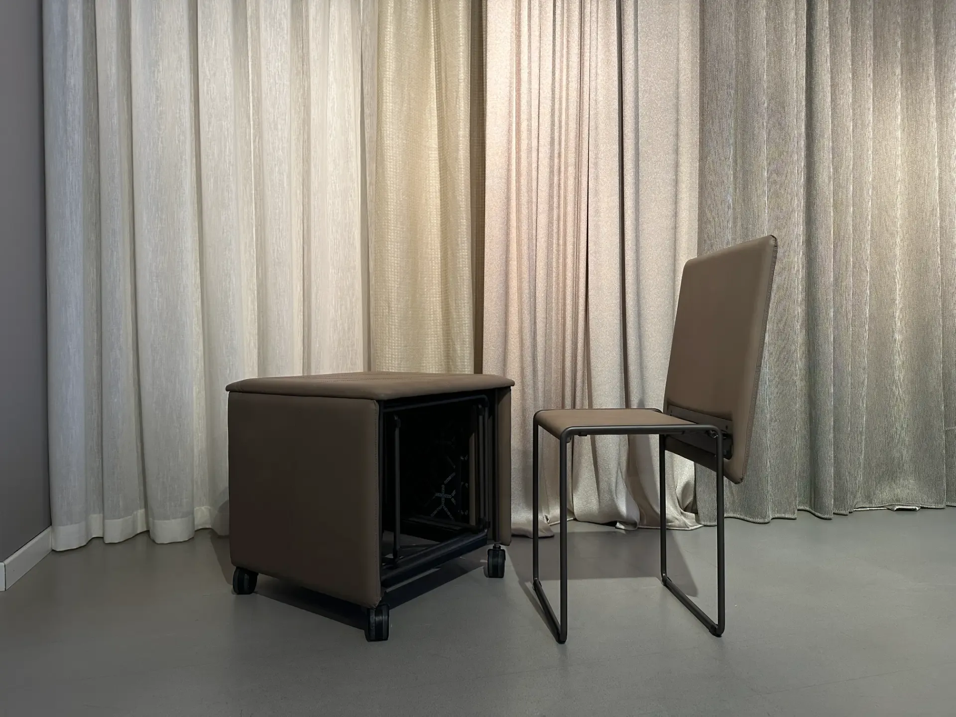 Il modello Cubix unisce praticità e design contemporaneo in una soluzione compatta e versatile. Caratterizzato da linee essenziali e geometriche, si distingue per il suo stile moderno e pulito, ideale per ambienti domestici e professionali. Il Pouf trasformabile è dotato di quattro ruote per un facile spostamento. Contiene al suo interno 4 sedie pieghevoli con seduta e poggia schiena imbottito.
