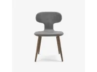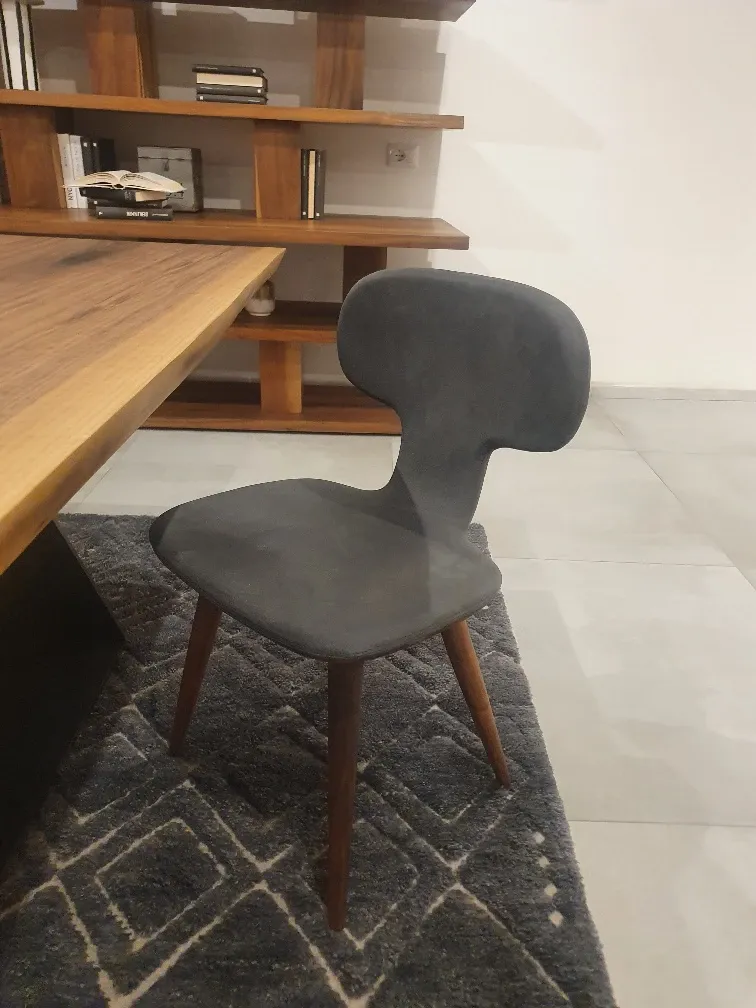 Sedia imbottita e rivestita in pelle camoscio color grigio antracite con cuciture a vista. Dalle forme sinuose ed avvolgenti, dotata di struttura sagomata in legno massello di noce finitura olio. Dimensioni L.48xP.48,5xH79,5cm. Disponibilit quantita 4.