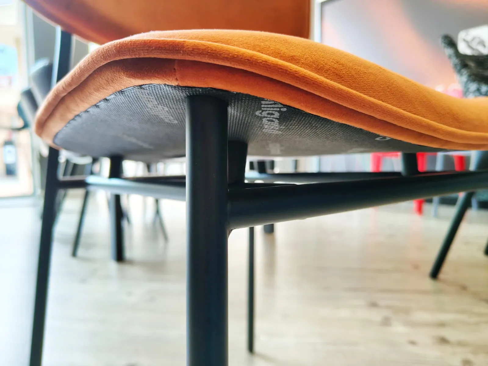 L accostamento tra il rigore del fusto metallico e la morbidezza delle parti imbottite crea un equilibrio visivo perfetto, dove le linee curve della seduta e dello schienale avvolgente invitano al comfort senza appesantire lo spazio circostante.