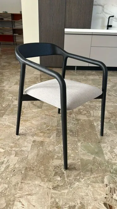 L'uso del nero aggiunge un tocco di eleganza discreta, rendendo queste sedie ideali per arredamenti sofisticati o spazi dal design industriale. La texture naturale del legno di frassino è esaltata da tecniche avanzate che mettono in risalto le venature uniche, conferendo a ogni sedia un carattere distintivo.
