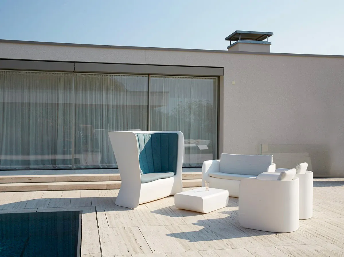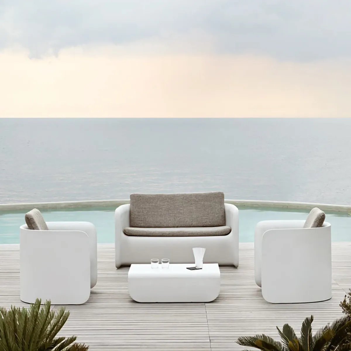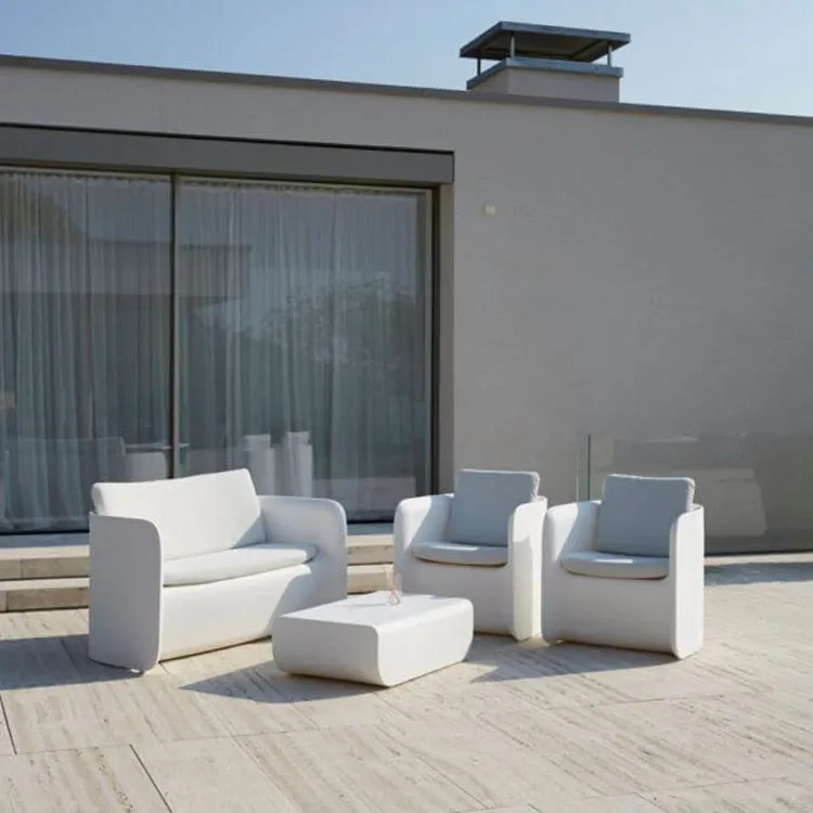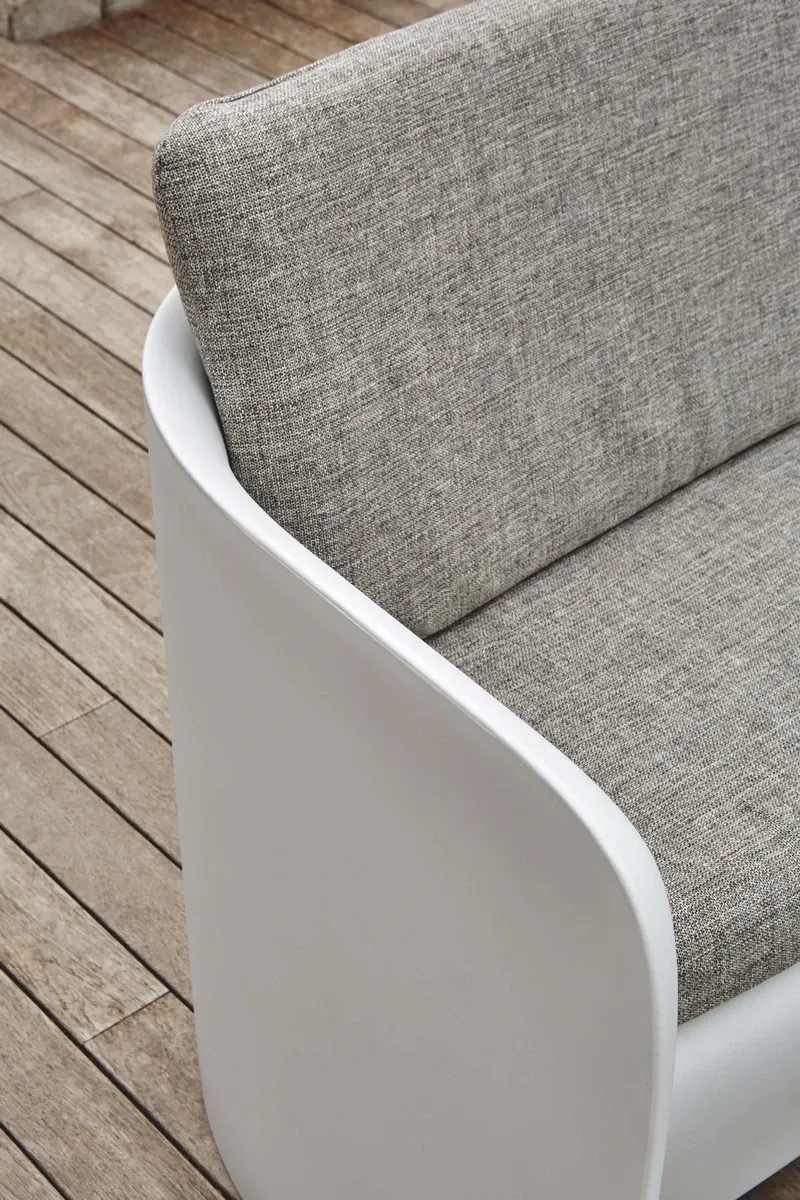 Questo set da esterno contemporaneo comprende 1 divano, 2 poltrone e 1 tavolino coordinato.