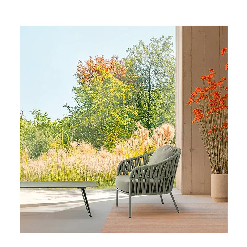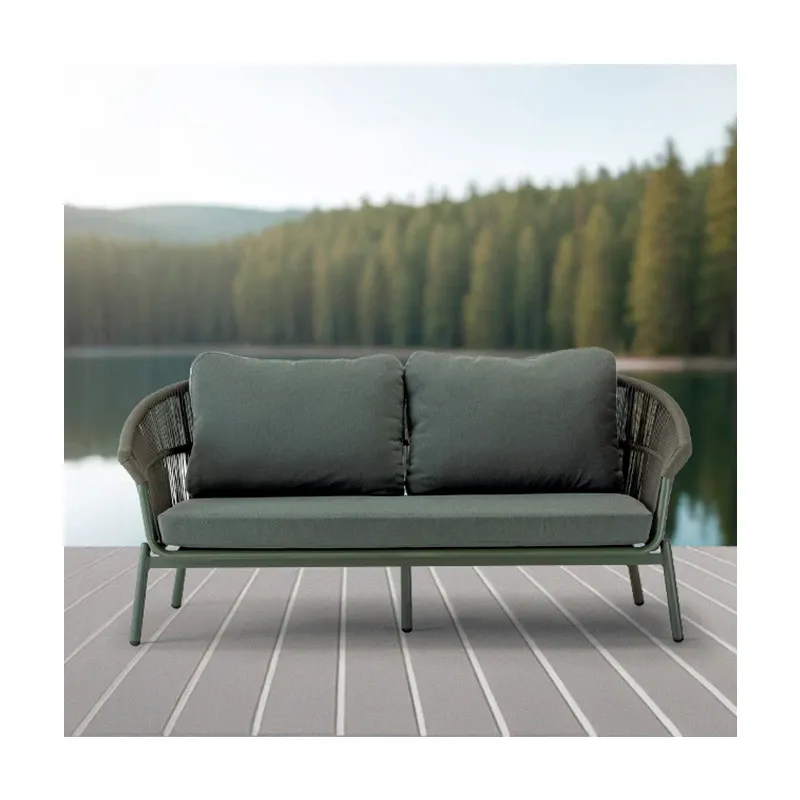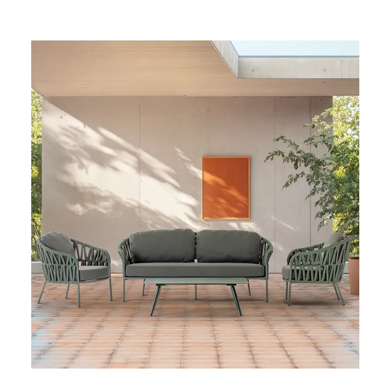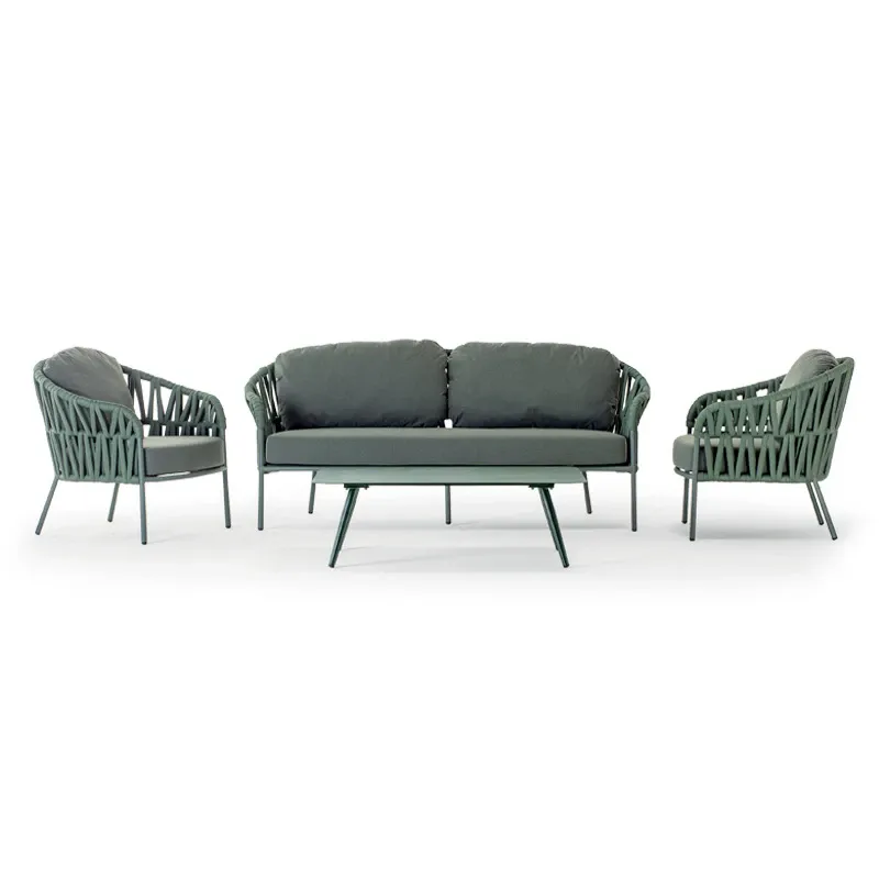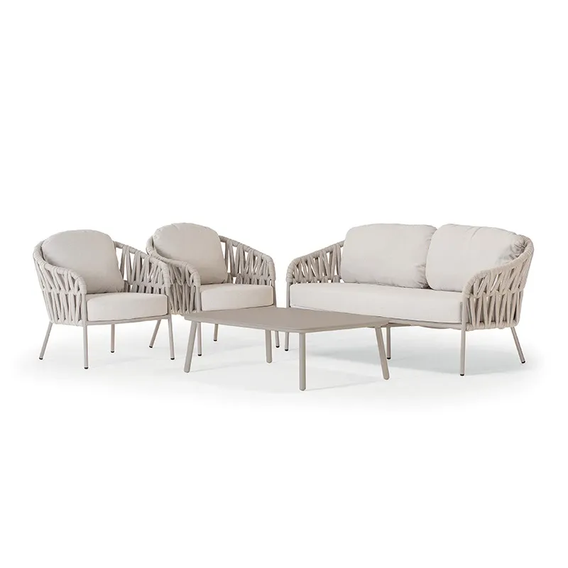 Coordinato con struttura in alluminio e rivestimento in tessuto poliestere e gomma, composto da un divano, due poltrone e un tavolino con piano in alluminio. Cuscineria sfoderabile in tessuto Olefin idrorepellente.