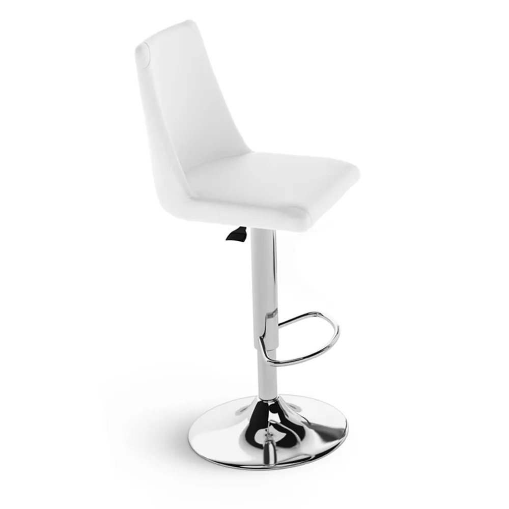 Sgabello con meccanismo a gas regolabile in altezza. Seduta in eco pelle crema caffè, moka, grafite, nero o bianco. Struttura e poggiapiedi in metallo cromato. Base cono e poggiapiedi tondo. Imballo di 2 elementi.