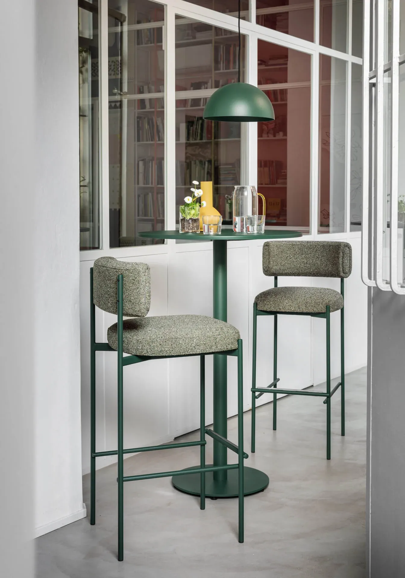 Lo sgabello Amelia è di produzione completamente italiana e si presenta con finiture di qualità e materiali di pregio. La struttura è in metallo laccato e la seduta con lo schienale sono rivestiti in tessuto .