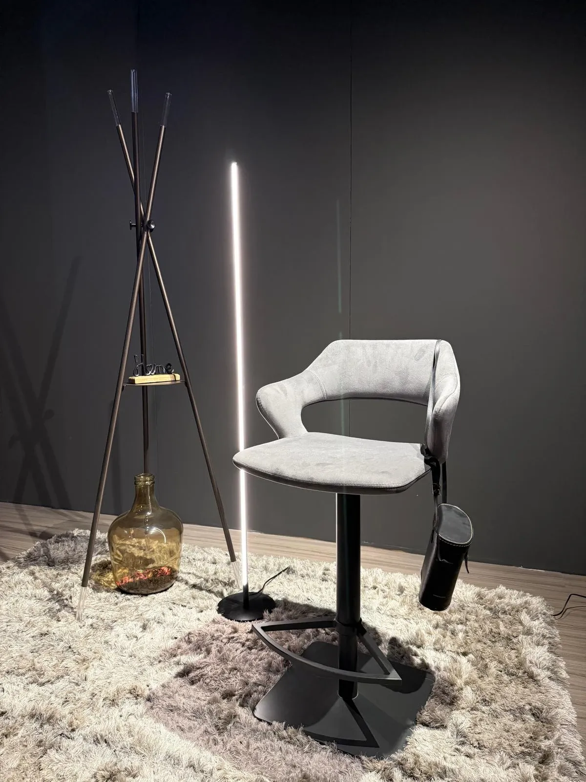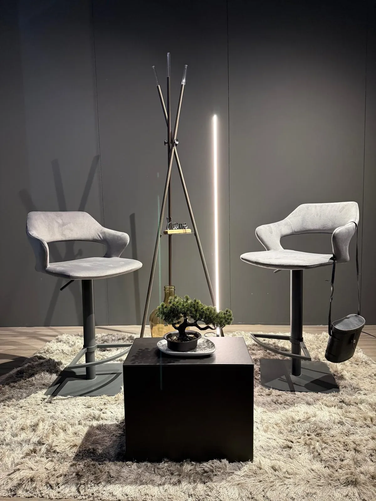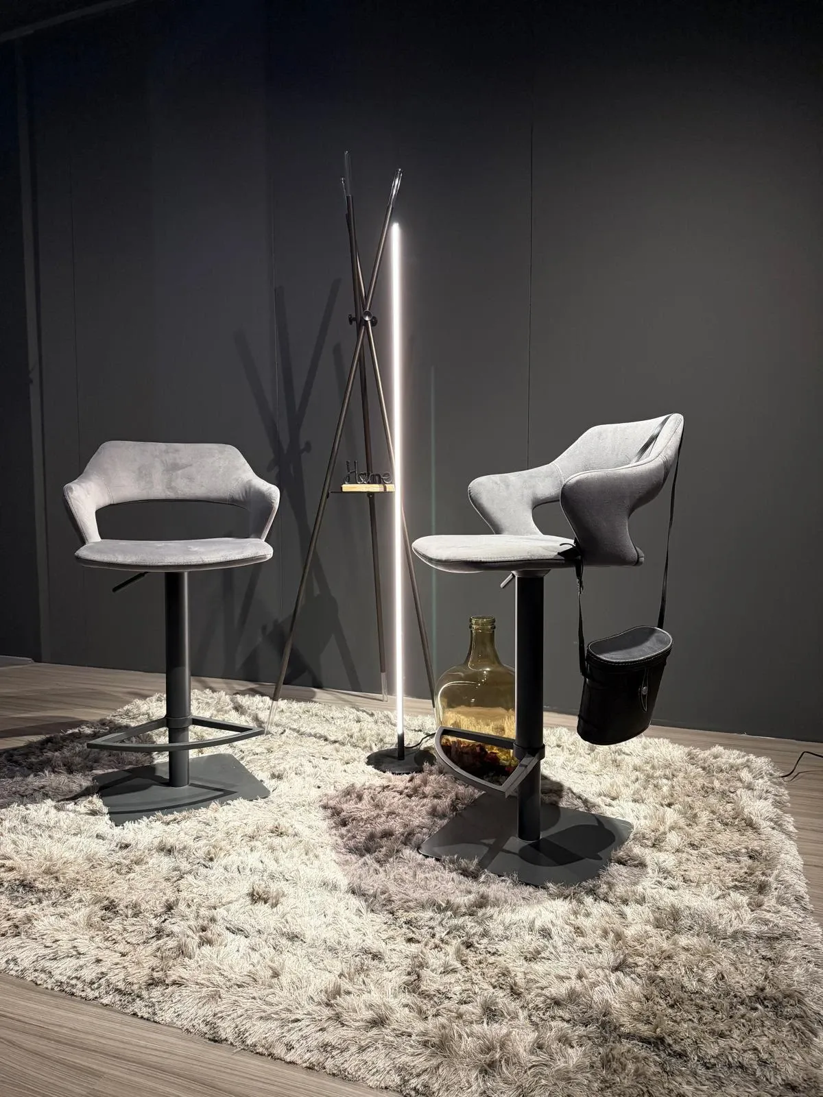 Set di 2 sgabelli regolabili in altezza, caratterizzati da un elegante finitura color grafite. La struttura in metallo verniciato garantisce solidità e durata, mentre la seduta, rivestita in morbida microfibra effetto velluto, offre comfort e un tocco raffinato.