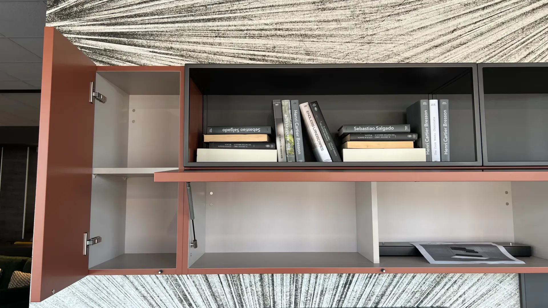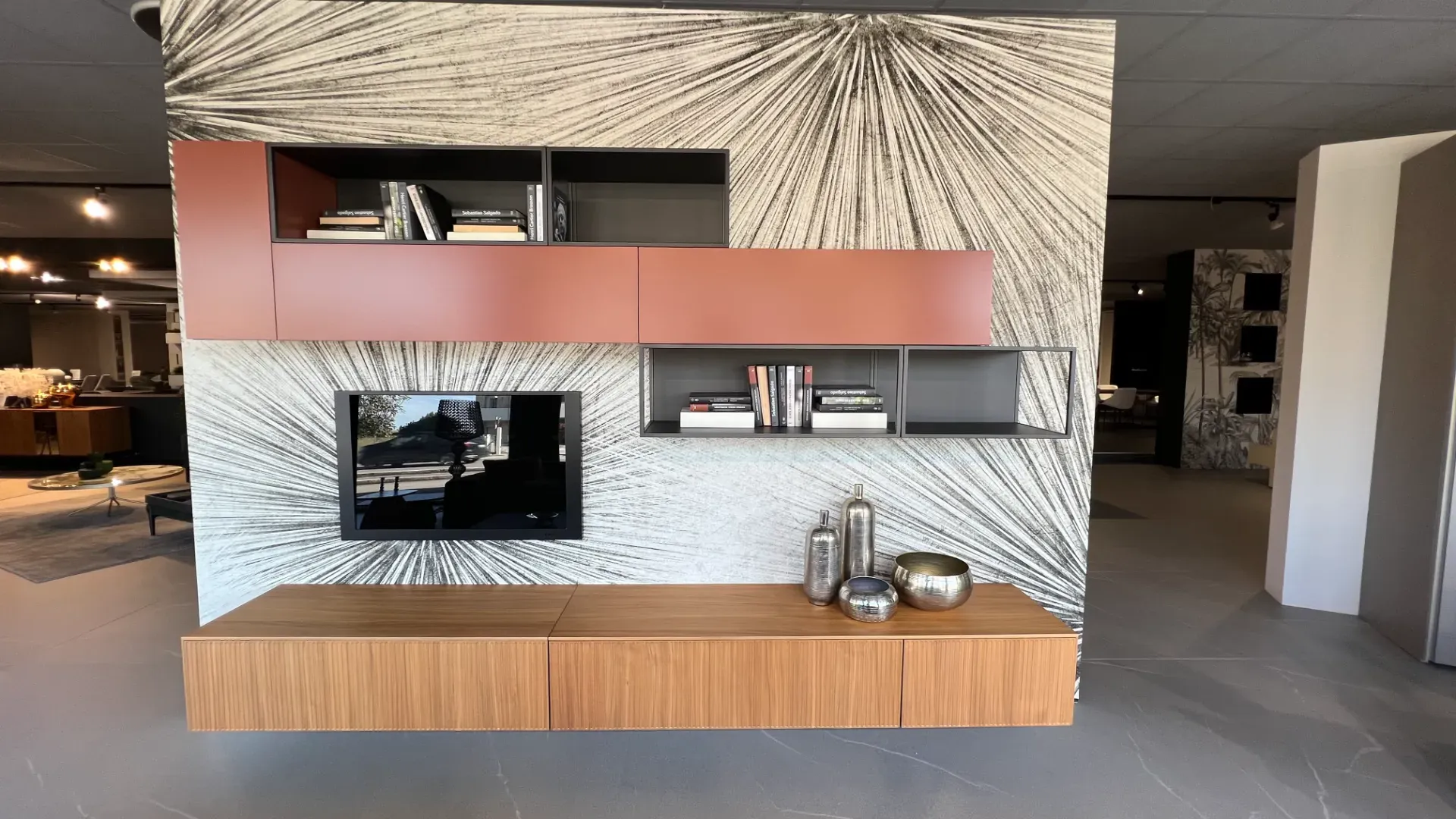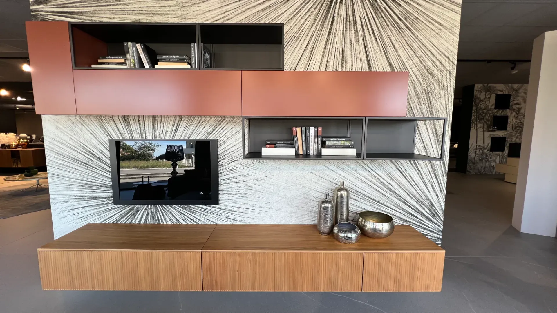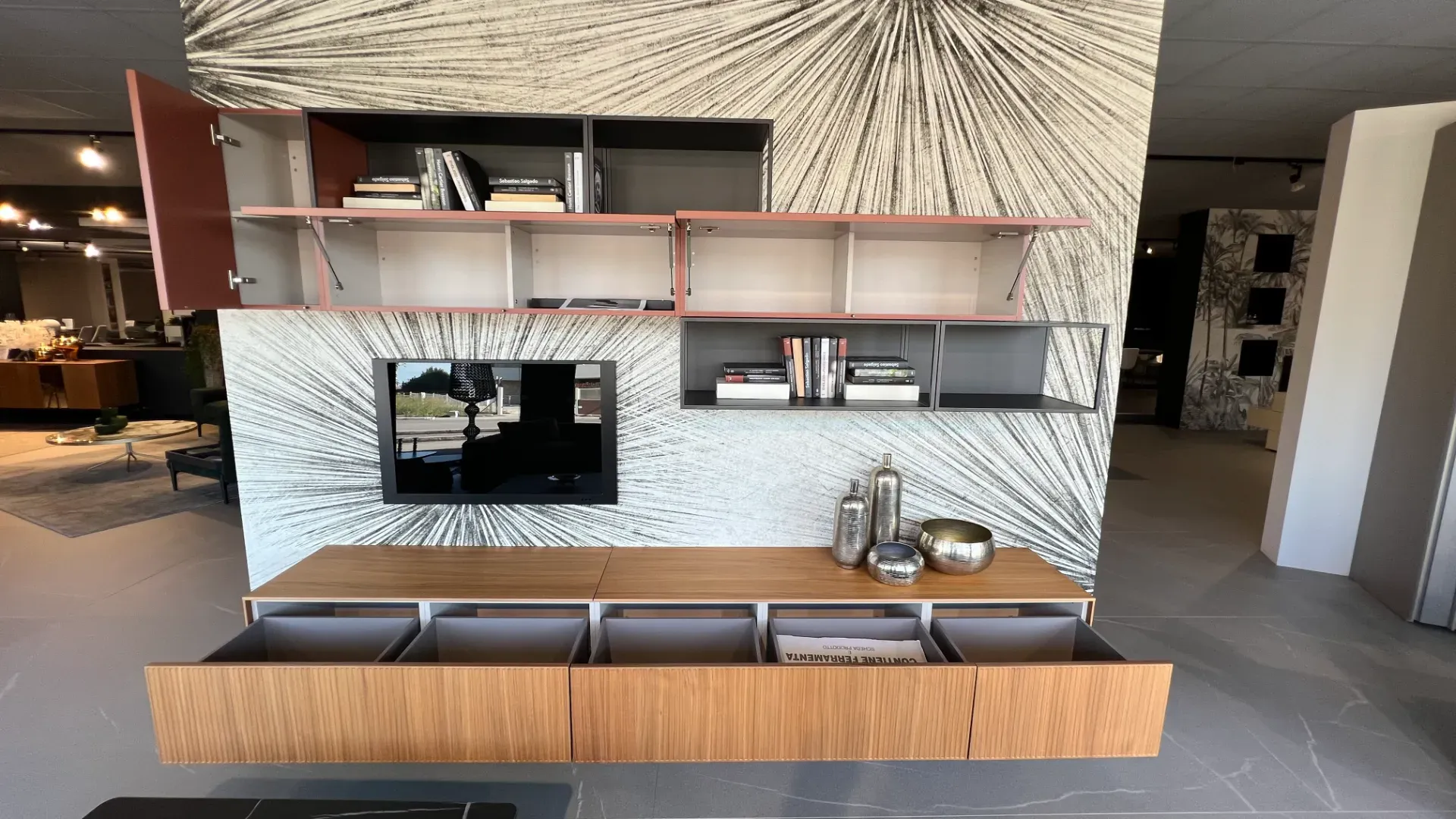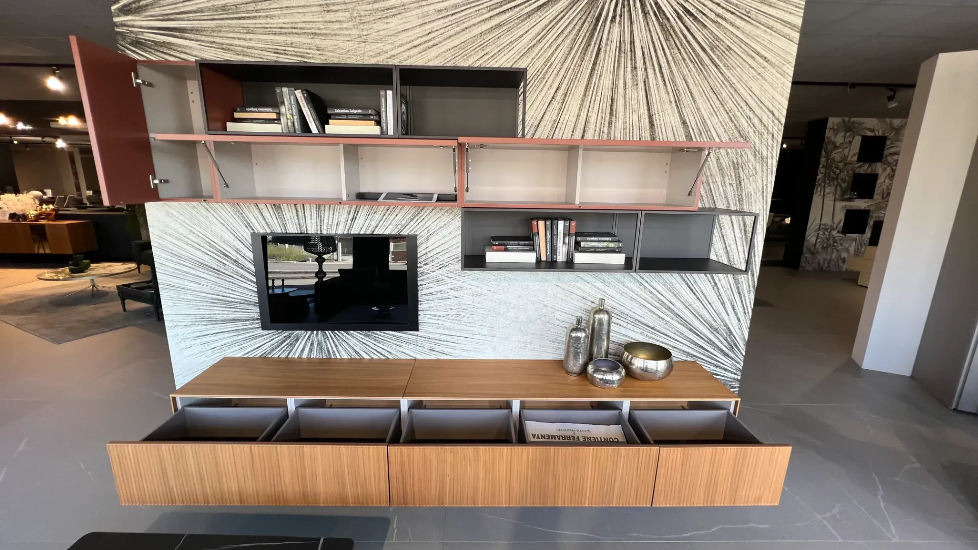 Il soggiorno nella fotografia si compone di differenti mobili ed elementi accessori, arricchiti dalla finitura in legno per essere sempre sempre resistenti e di grande personalità.