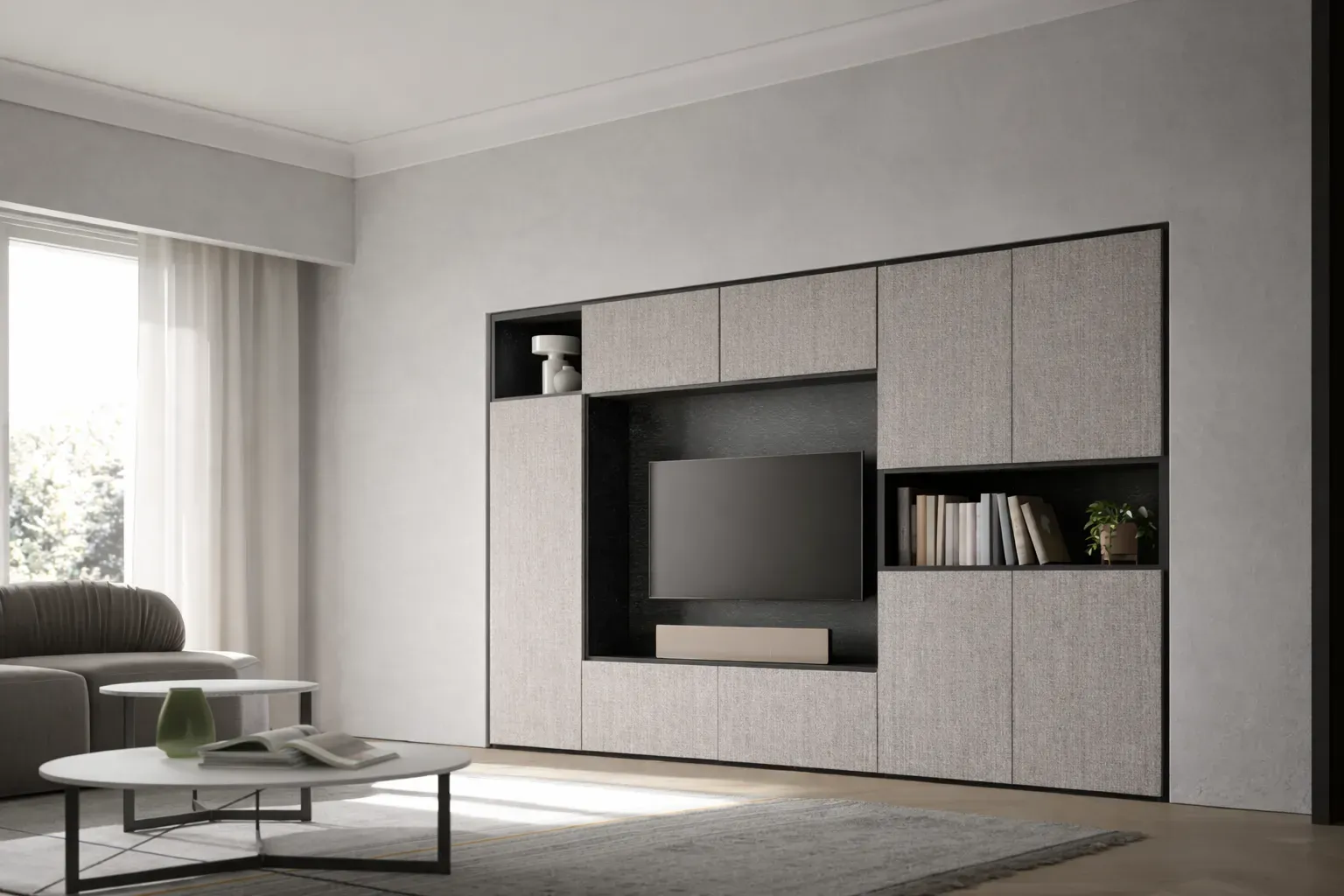 L insieme è caratterizzato da una struttura articolata con ante in legno, cassetti e ribalte, integrate in un sistema di spalle e schiene che definiscono un architettura pulita e rigorosa. Il vano centrale dedicato alla TV è incorniciato da moduli contenitivi e vani a giorno, ideali per organizzare libri e oggetti decorativi. I ripiani in legno, sia con schiena che a giorno, contribuiscono a creare ritmo e profondità, alternando pieni e vuoti in modo equilibrato.