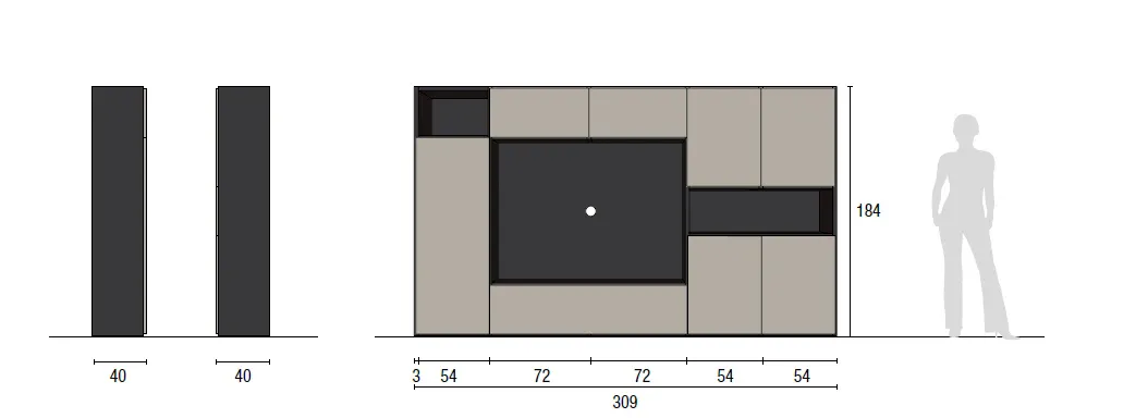 La composizione ha dimensioni complessive di L 309 cm, P 40 cm, H 184 cm ed è configurata come una parete attrezzata completa con moduli contenitivi, vani a giorno e spazio TV integrato, studiata per offrire massima funzionalità e un estetica moderna e coerente.