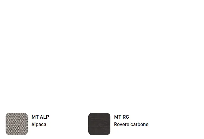 Le finiture conferiscono un carattere sofisticato e contemporaneo: l Alpaca dona una texture materica ed elegante, mentre il Rovere Carbone introduce profondità e contrasto con le sue tonalità scure, creando un ambiente raffinato e accogliente.