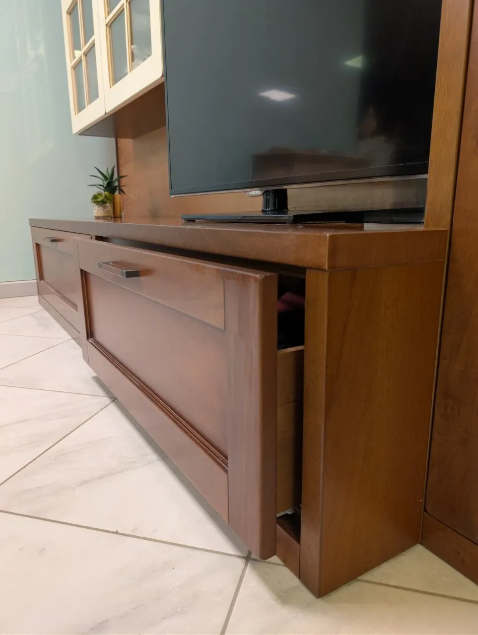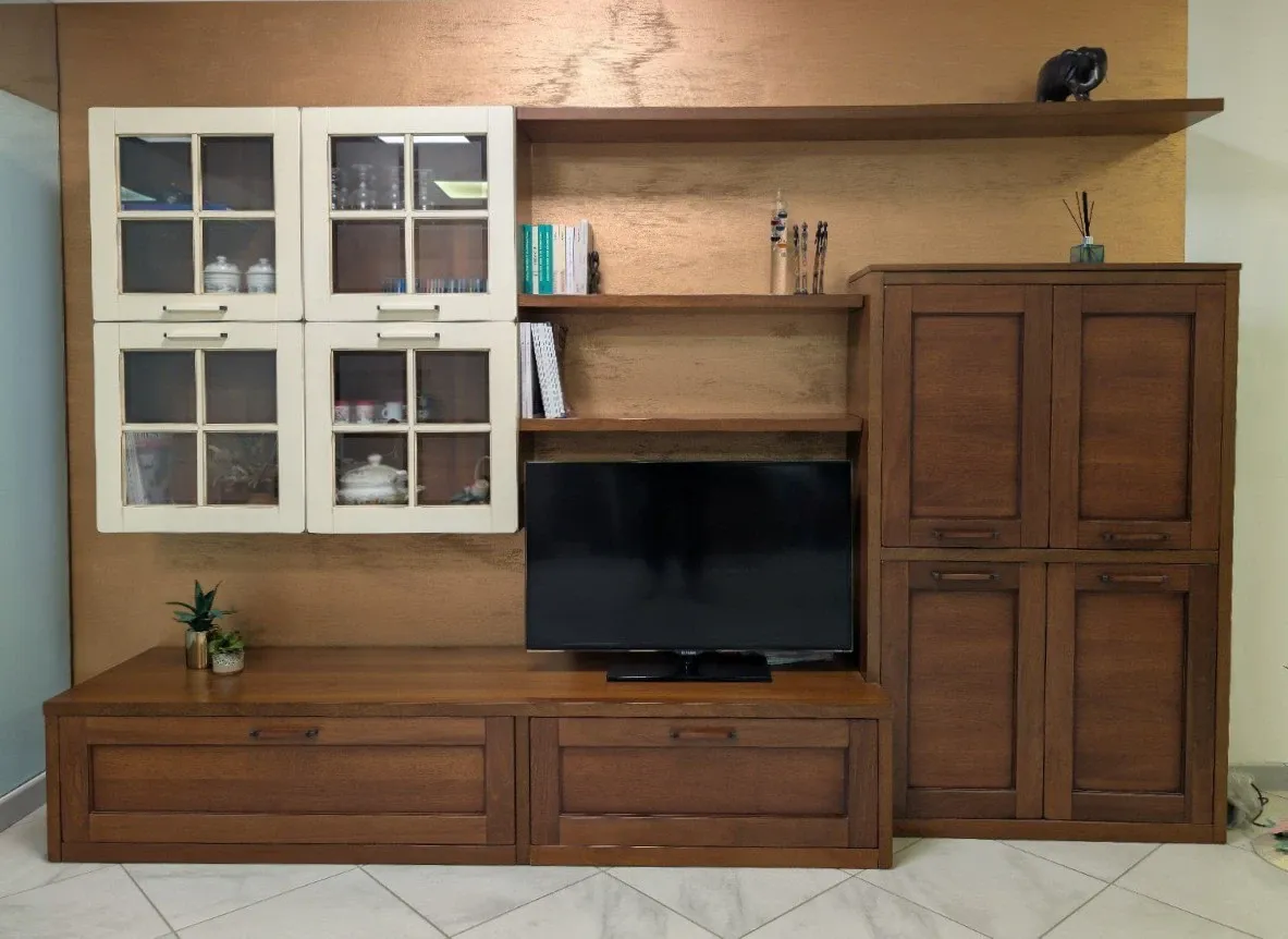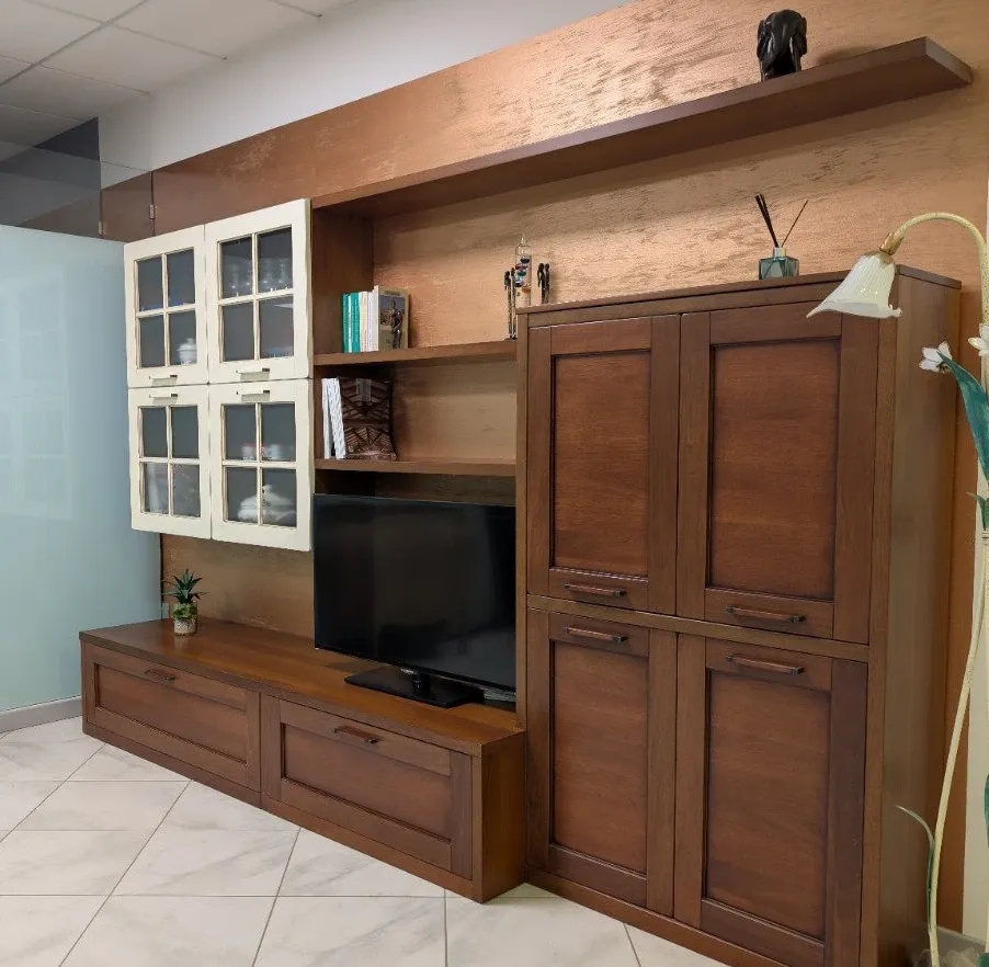 La parete attrezzata in legno con modanature in tinta noce, è un mobile per soggiorno intramontabile che può essere abbinato ad uno stile d'arredo classico o in combinazione con uno stile moderno, creando un contrasto molto ricercato nelle ultime tendenze d'arredo contemporanee. Perfetta per funzionalità e eleganza.