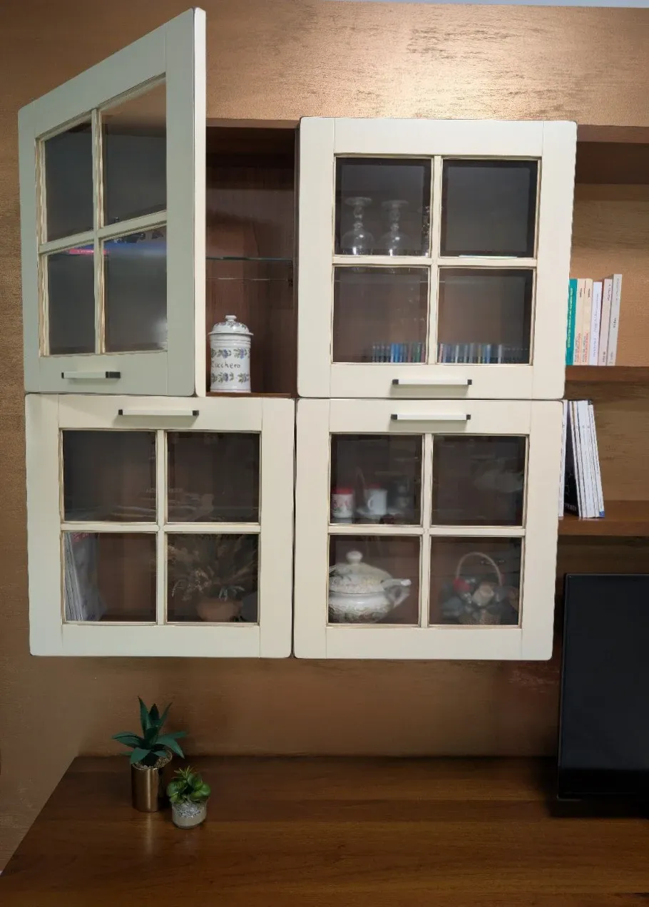 Mobile per soggiorno ideale per ottimizzare gli spazi a disposizione. Dotata di 2 cassettoni e 4 ante chiuse bugnate e 2 ante in legno color panna a vetro satinato liscio dotate di un ripiano interno in legno, questa libreria accoglierà la vostra tv e molti altri oggetti, sia da tenere nascosti che da mettere in mostra.