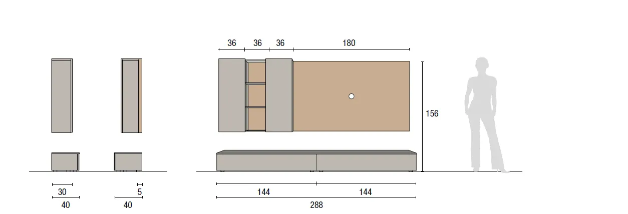 La composizione ha dimensioni complessive di L 288 cm, P 5/30/40 cm, H 156 cm ed è composta da: