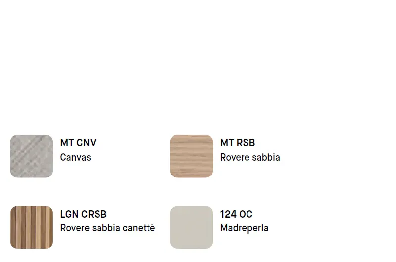 Le finiture esaltano il carattere materico e sofisticato: il Rovere Sabbia canettè introduce una texture tridimensionale calda e naturale, il Madreperla illumina l ambiente con una tonalità chiara e raffinata, mentre il Canvas e il Rovere Sabbia completano l insieme con un equilibrio cromatico elegante e contemporaneo.