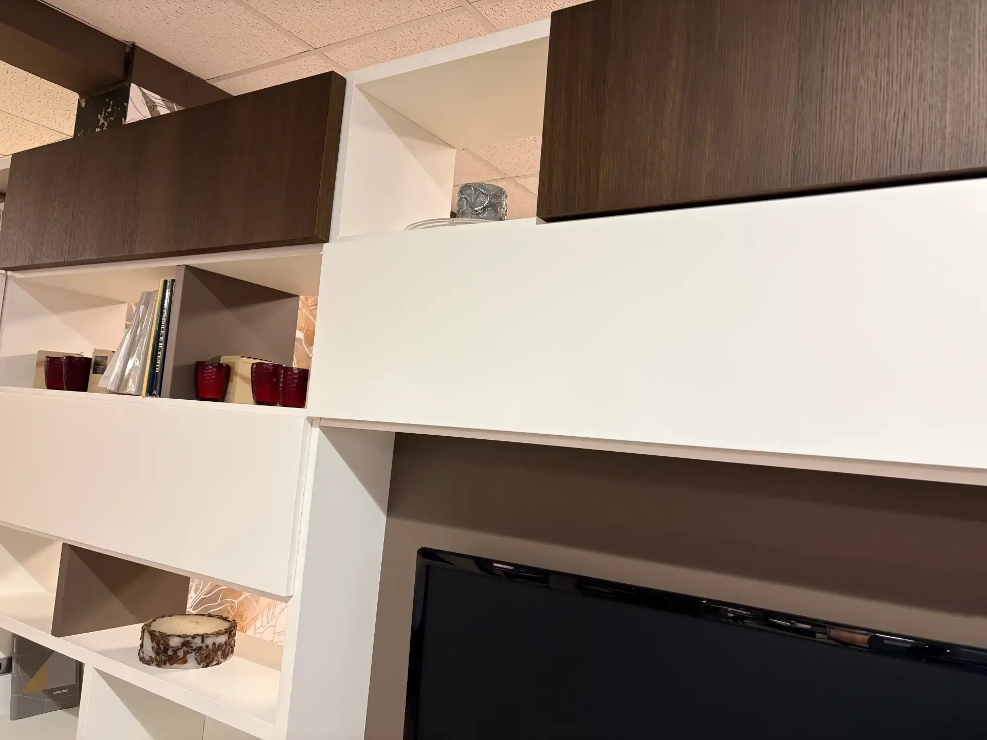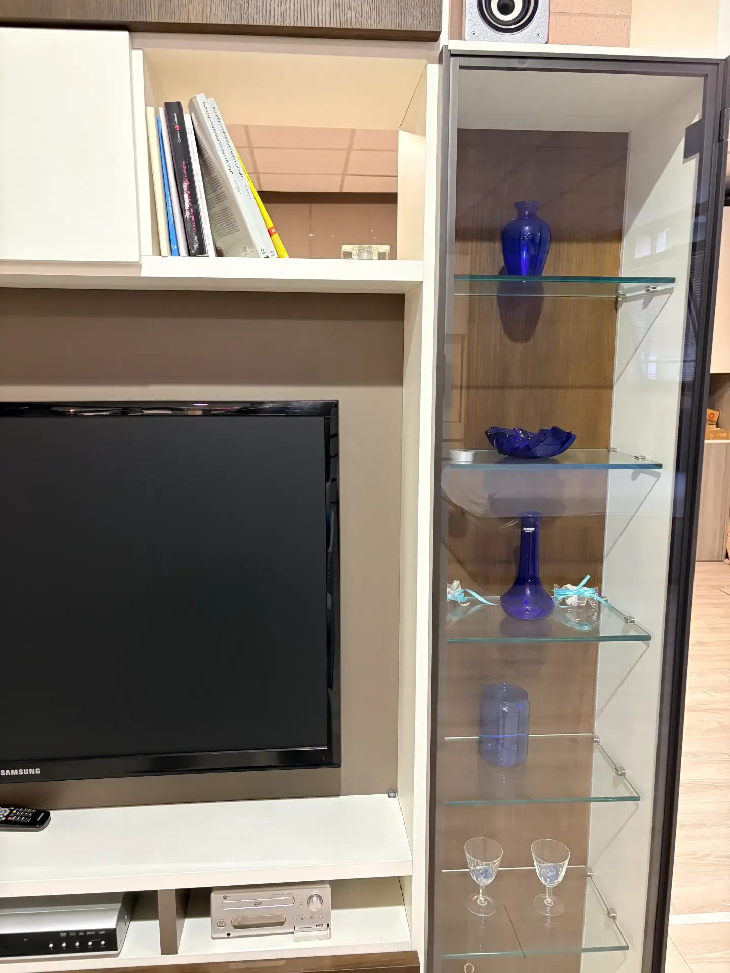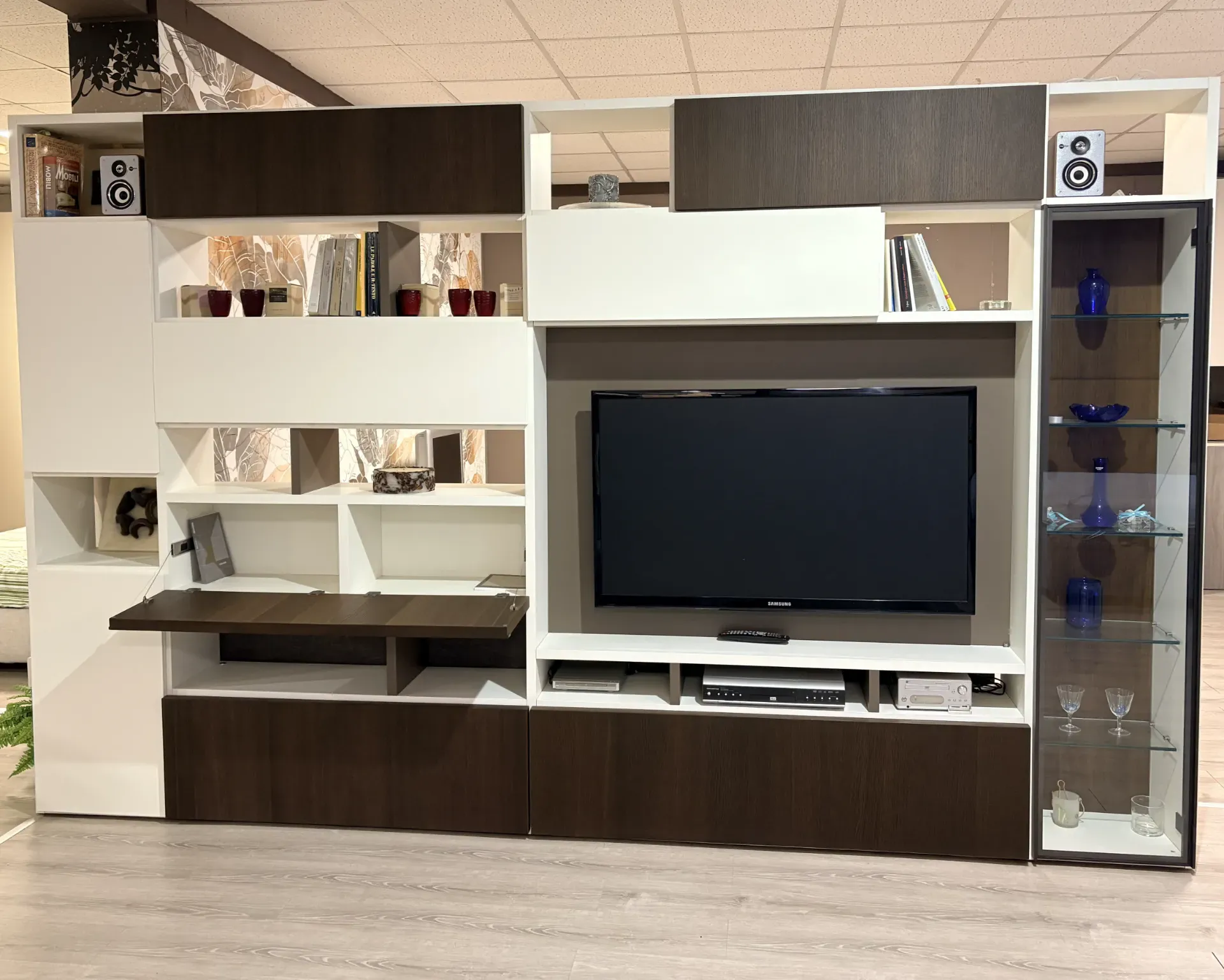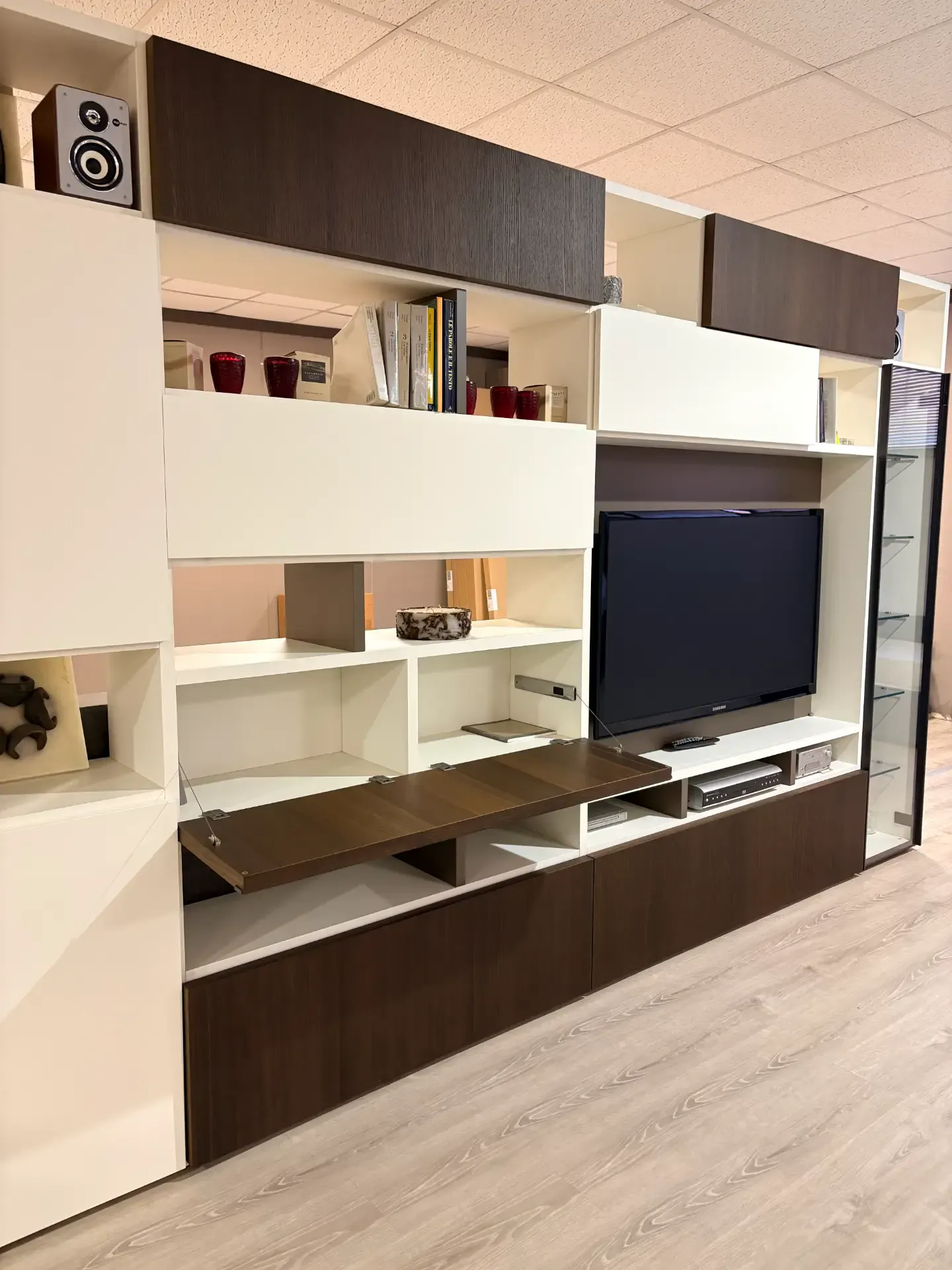 Composizione a spalla modello Modo Sangiacomo in finitura mat. bianco 10, frontali sp 20 laccato bianco 10 opaco , frontali sp35 rovere termo trattato , pannello retro tv e inserti in libreria laccati creta opaco , vetrina verticale scrigno con ripiani in vetro e luce led interna .Ribalta uso scrittoio .