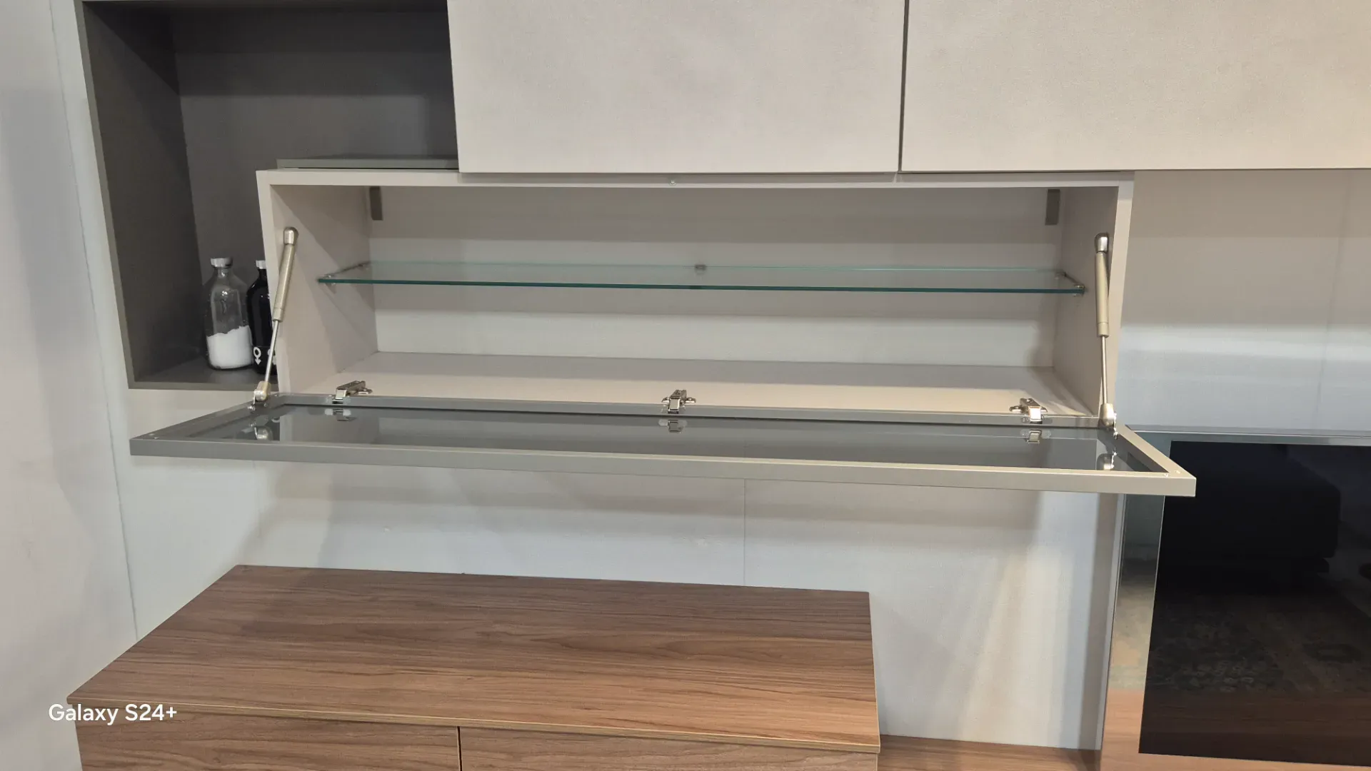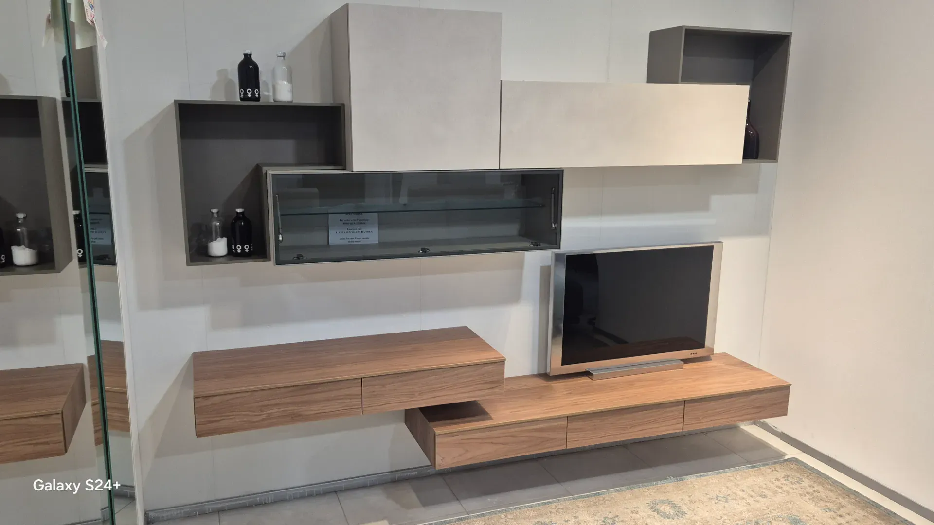 SOGGIORNO DALLE LINEE DINAMICHE E MODERNE CON BASI SOSPESE, SOGGIONO L.270 P.47,5 H.210 COLORE DELLE BASI NOCE NATURALE , PENSILI CON EFFETTO CALCE E PENSILI A GIORNO CACHEMIRE