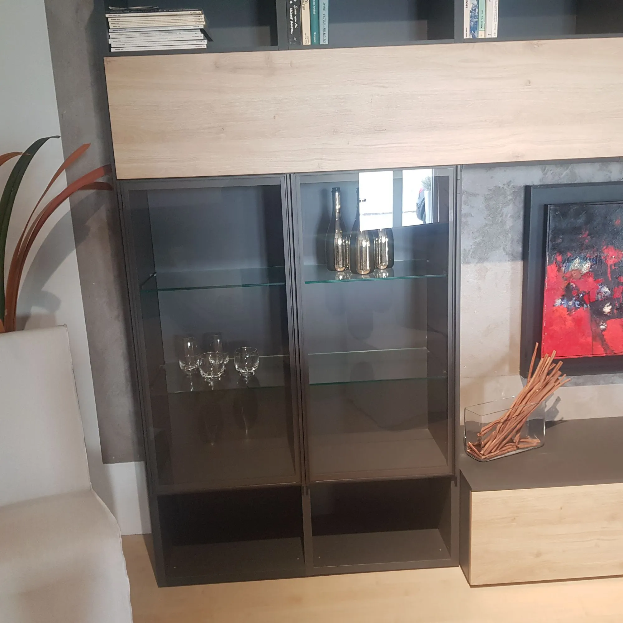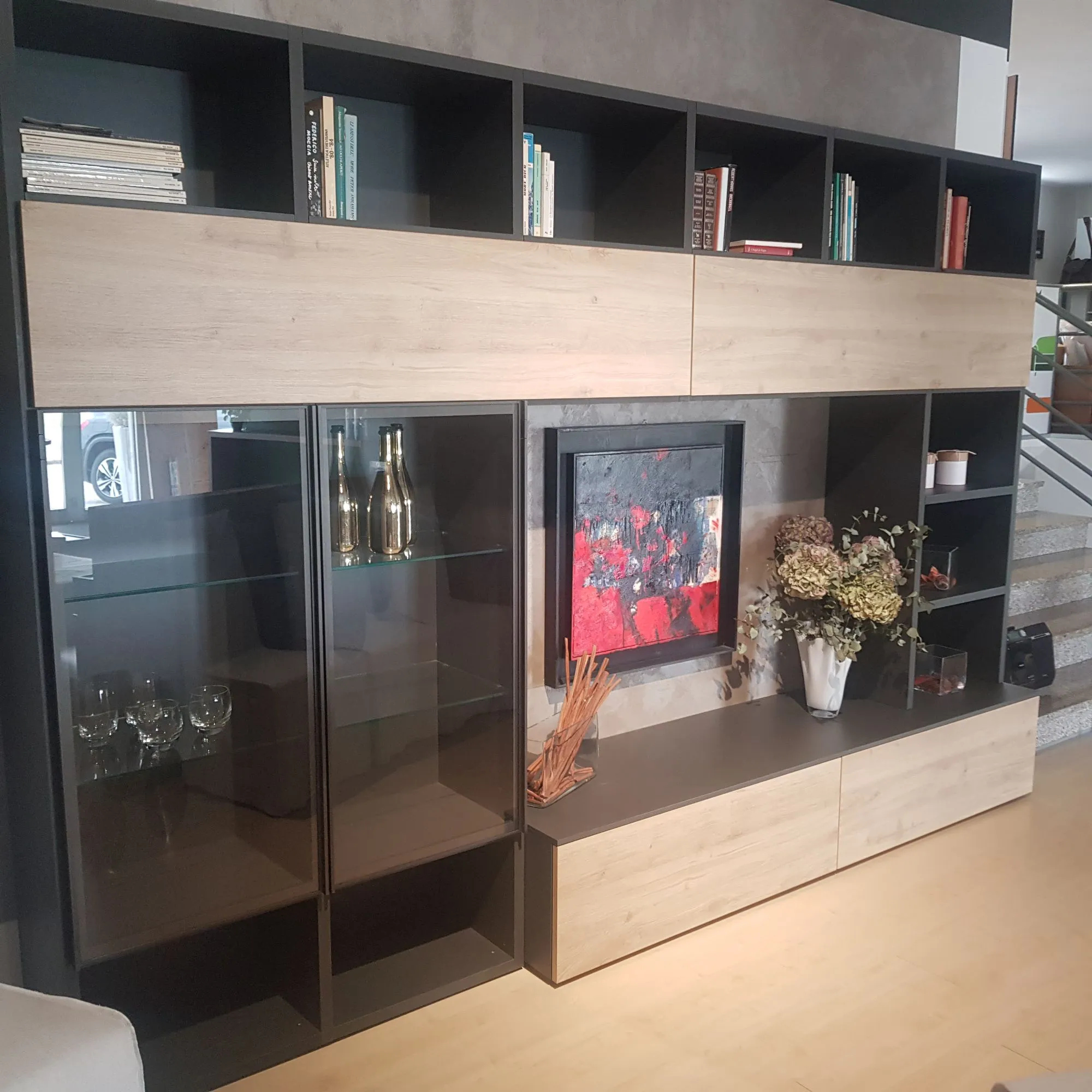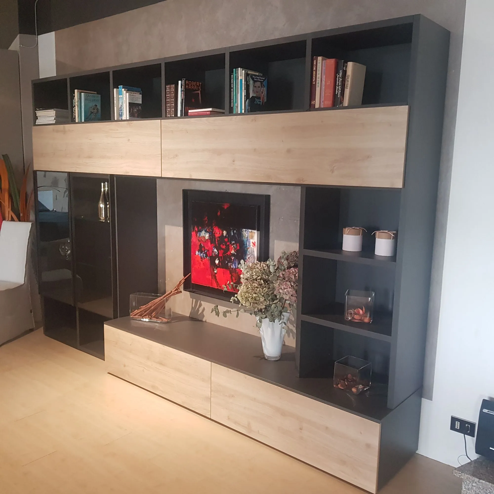 Dai forma al tuo living con una capiente composizione completa di tutto, in grado di assicurarti tutta la funzionalità di un mobile a terra.
