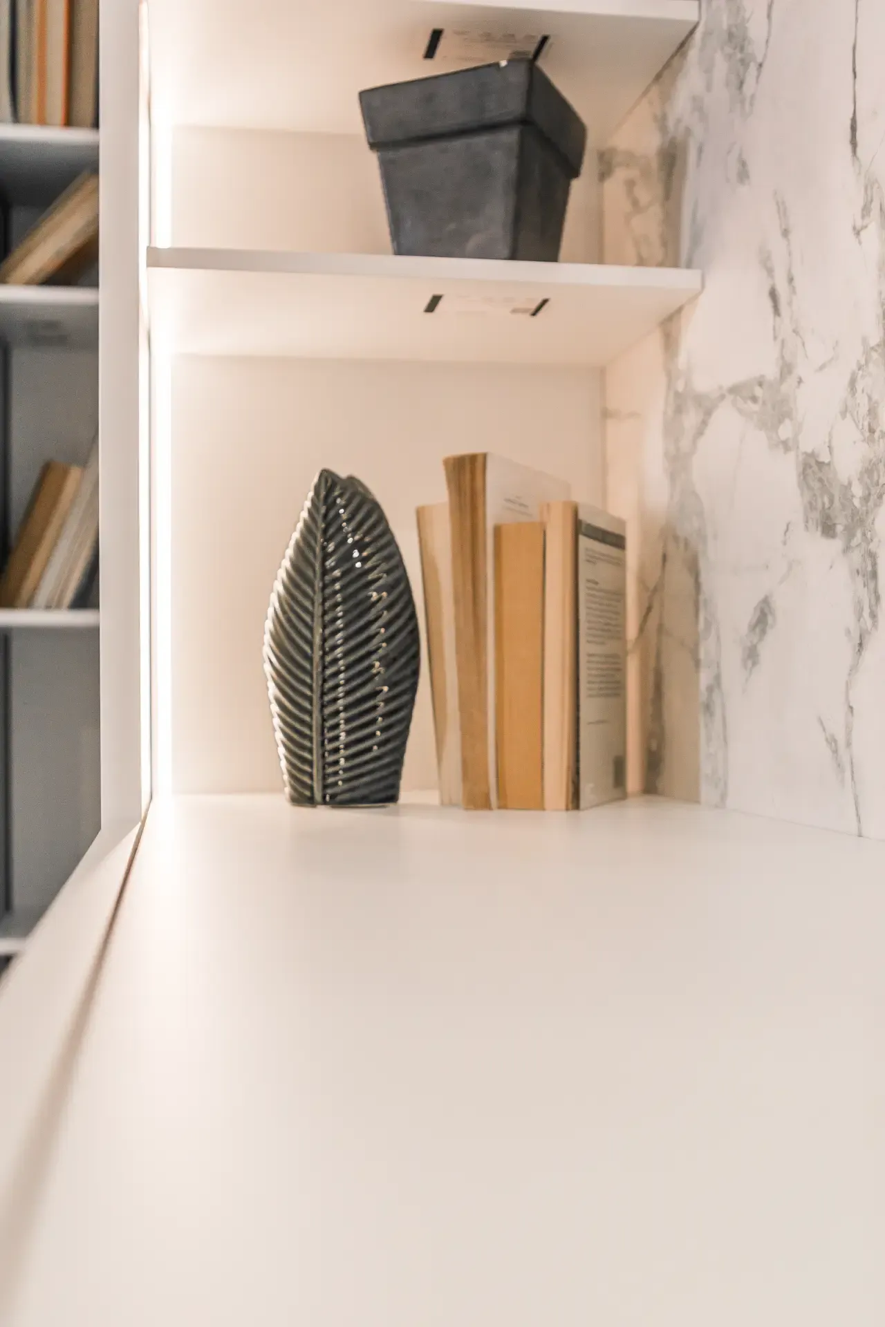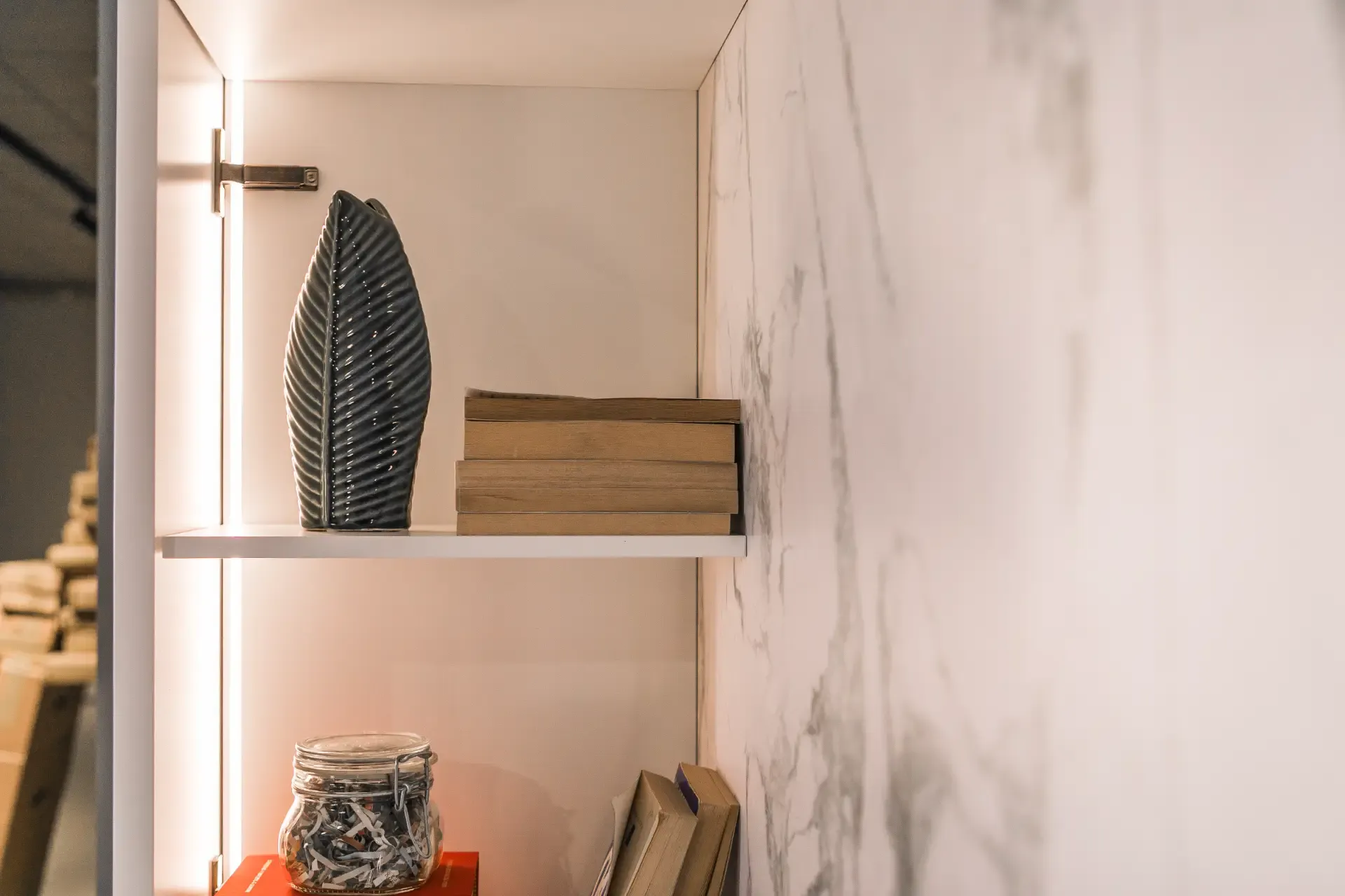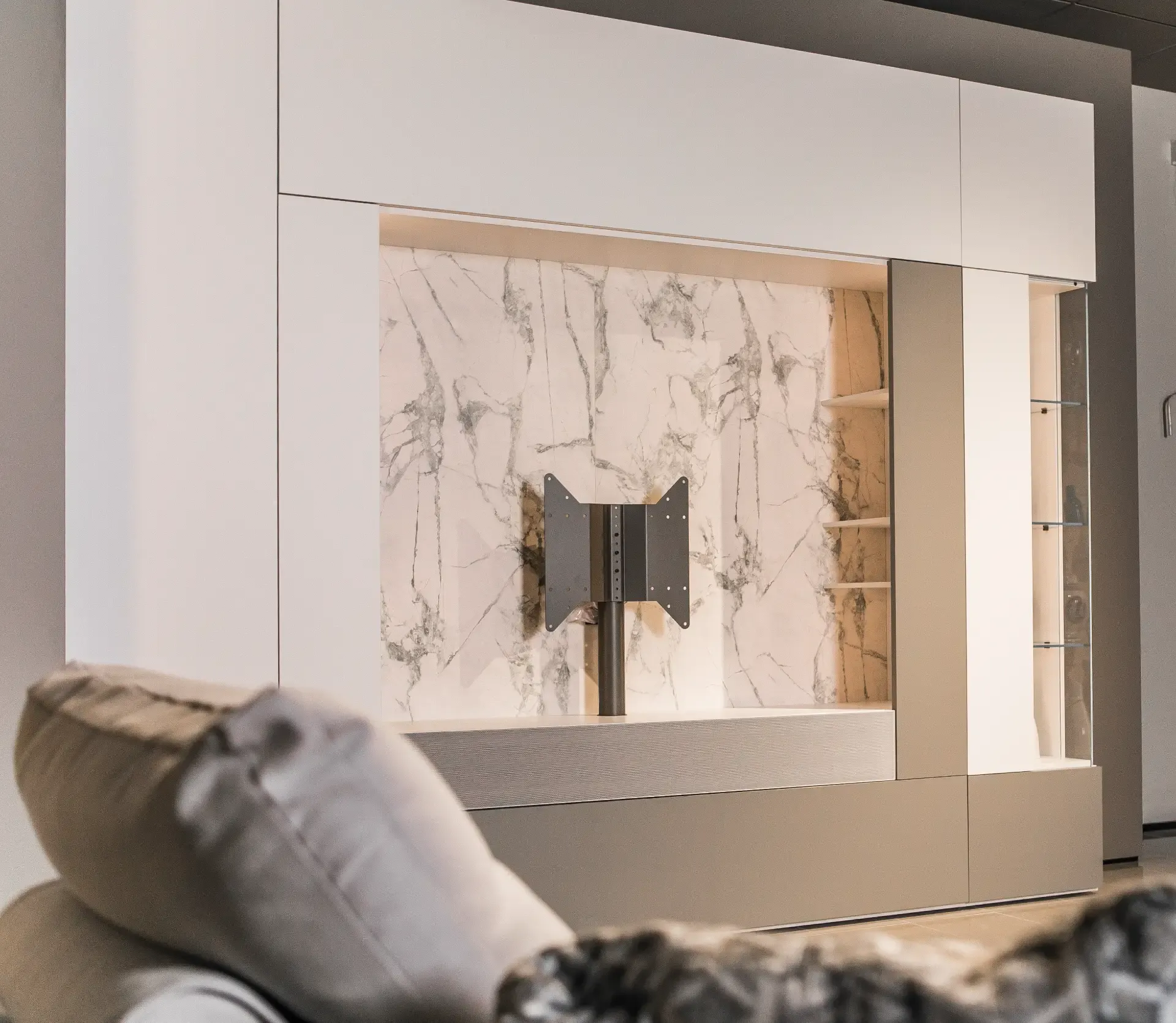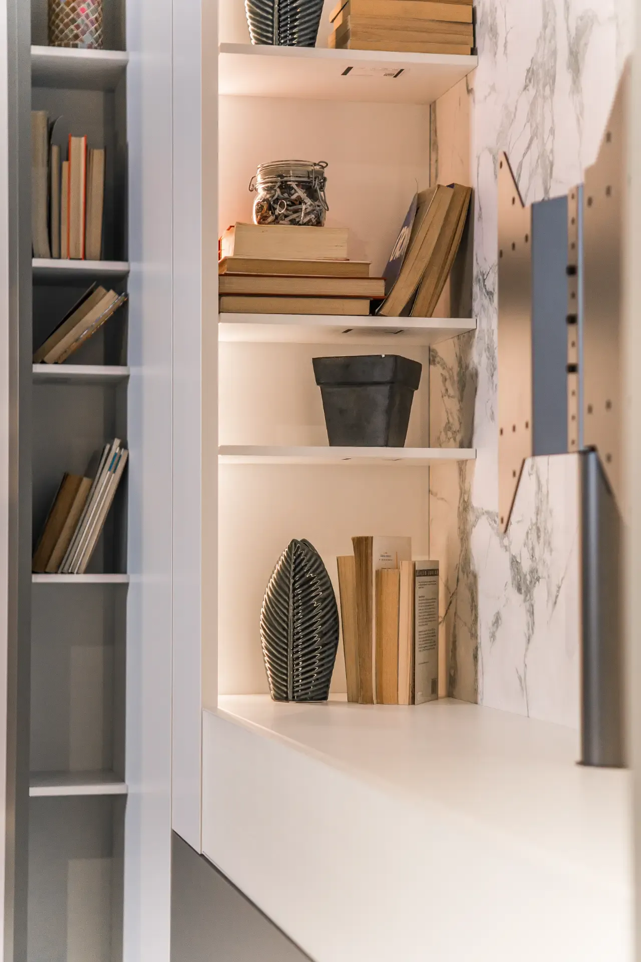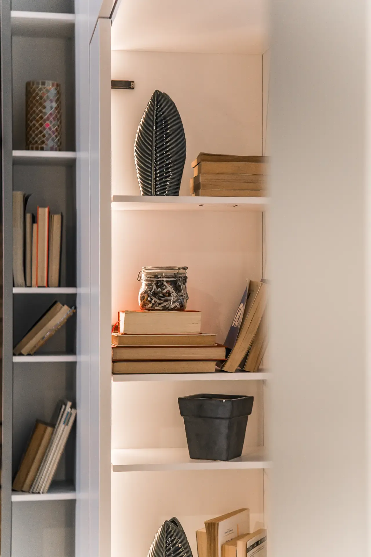La composizione proposta si compone di elementi libreria, contenitori di varie profondità che vengono utilizzati come guardaroba/ scarpiera e sistema luci. La nicchia attrezzata al centro del modulo si trasforma in uno spazio totalmente dedicato al televisore nascondendo cavi/trasformatori connessi allo schermo.