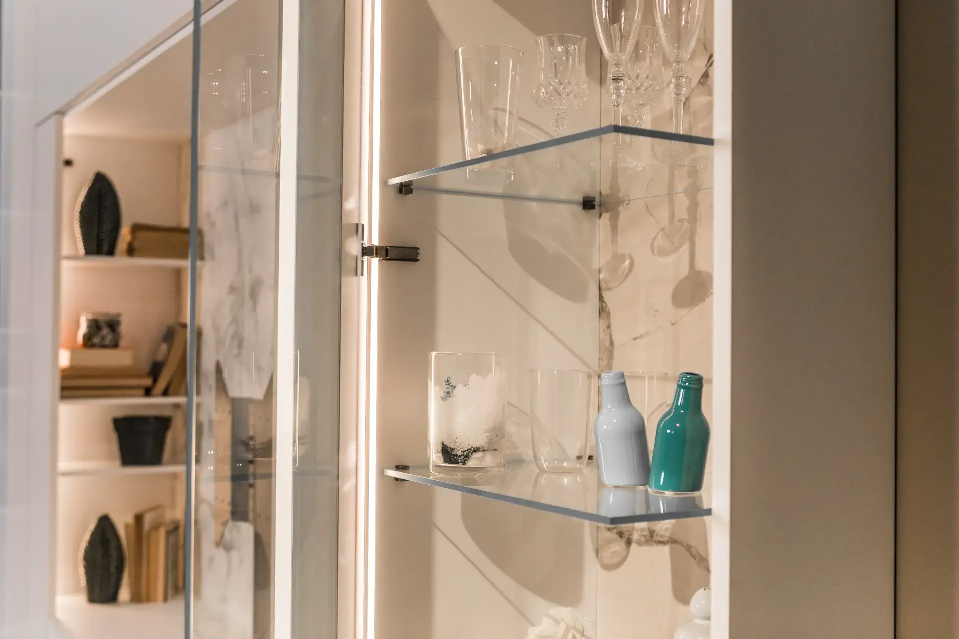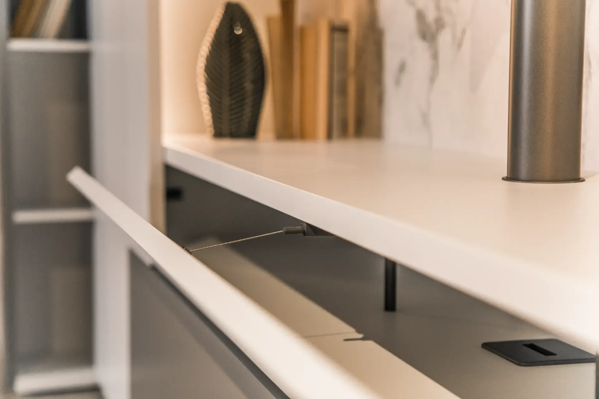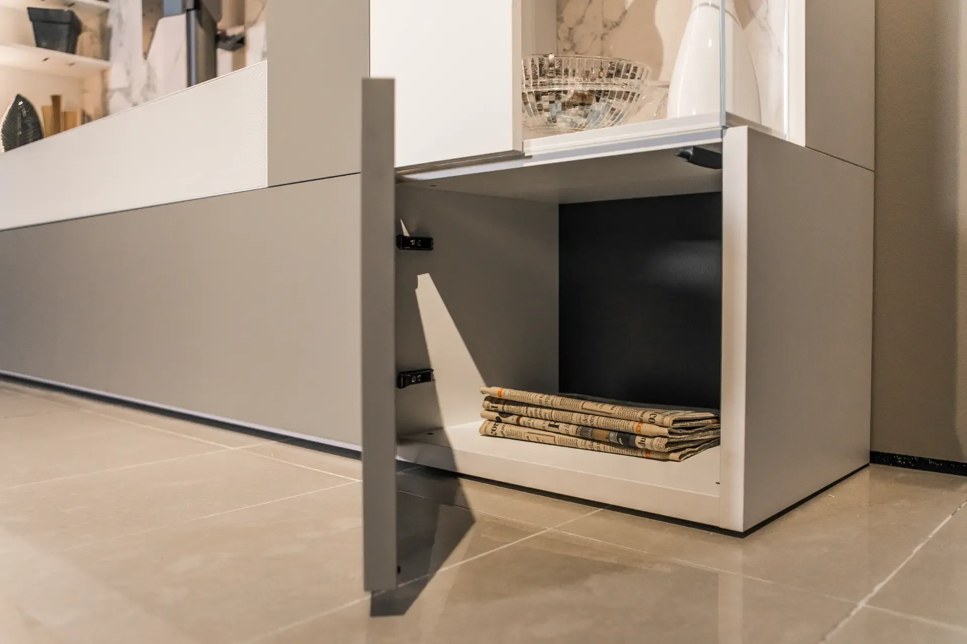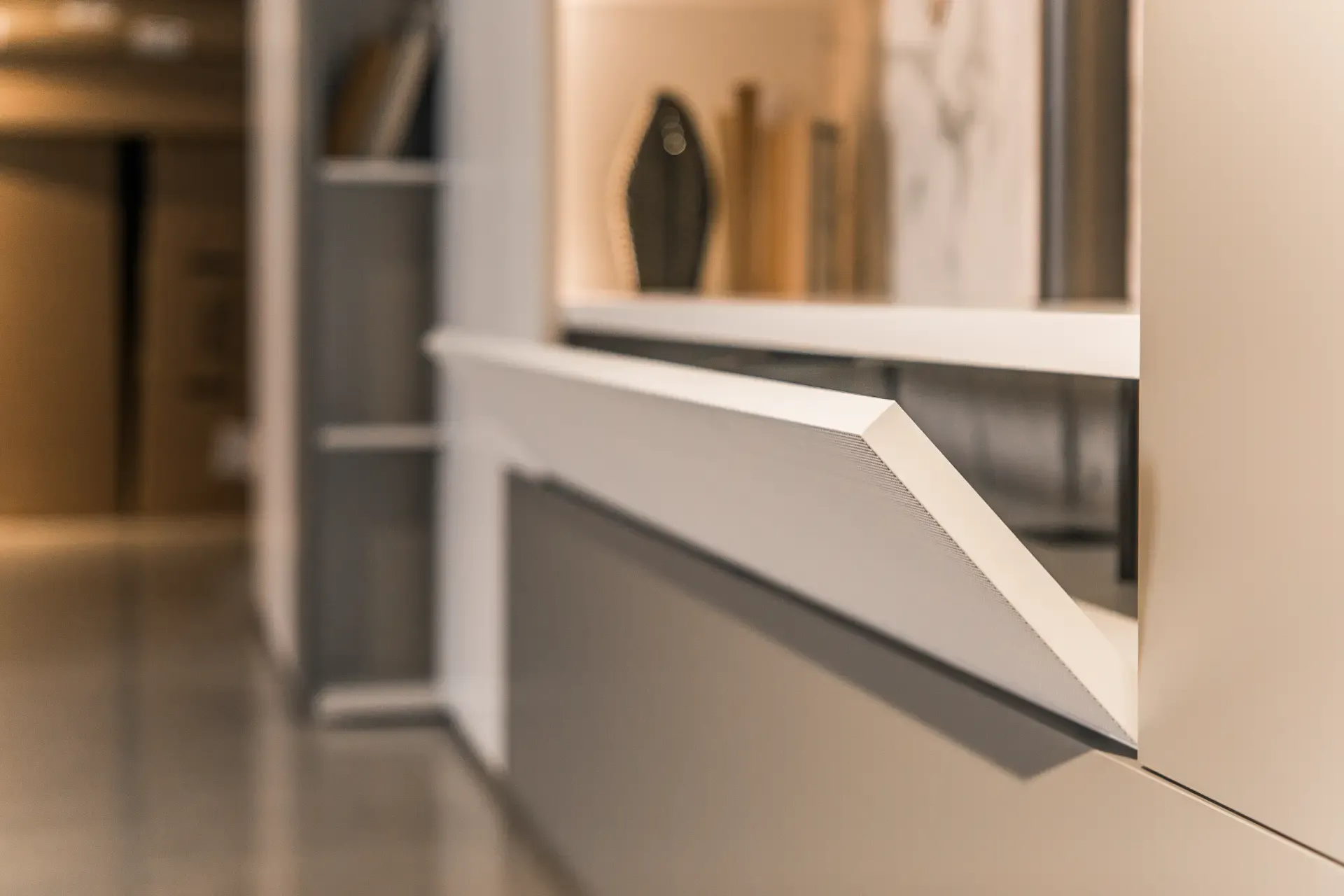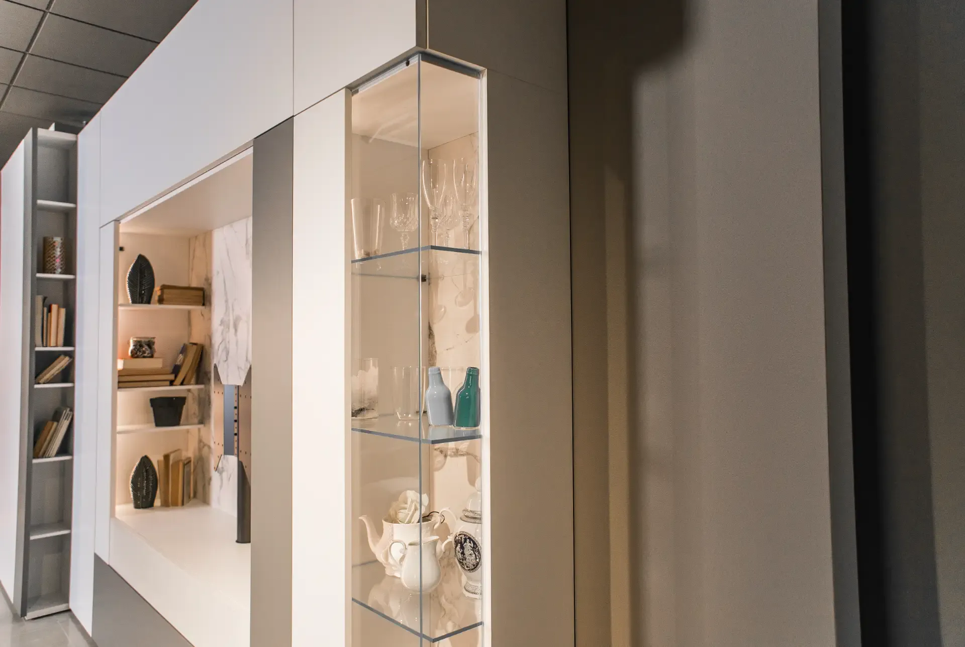 Il soggiorno protagonista di questa proposta molto vantaggiosa è realizzato in laccato opaco: la solidità e la modularità della struttura si fondono perfettamente con il valore estetico della finitura, ripresa dai diversi elementi della composizione.