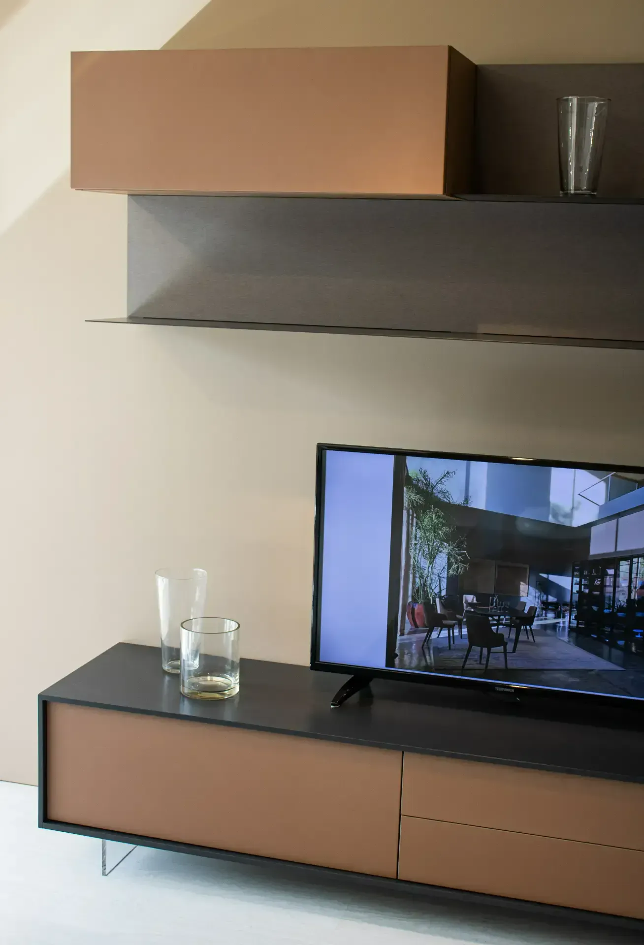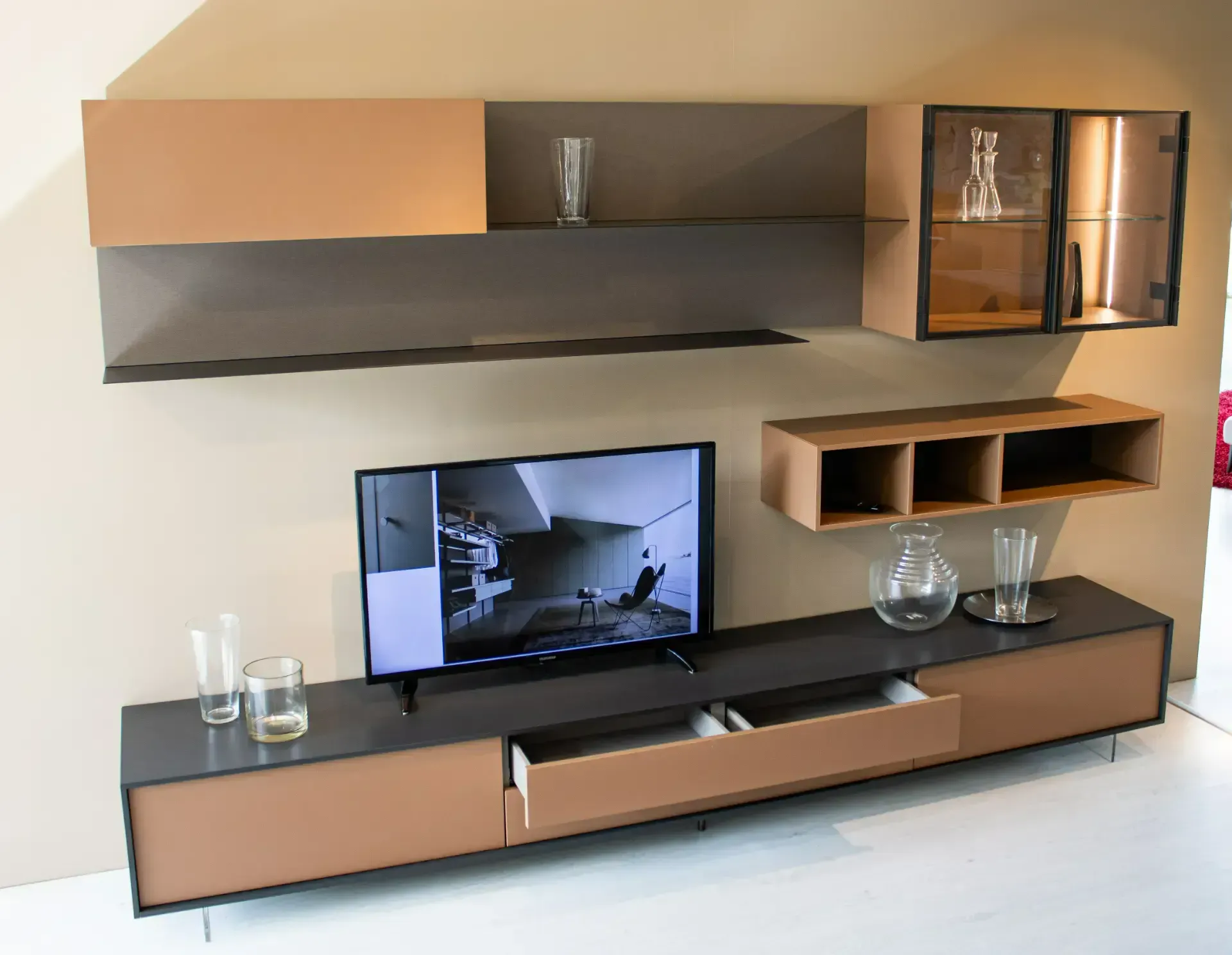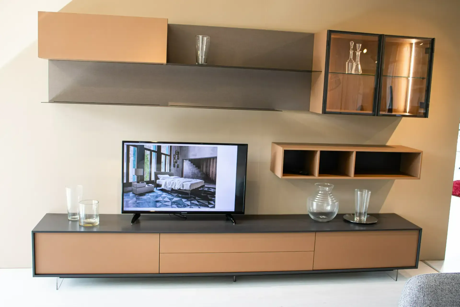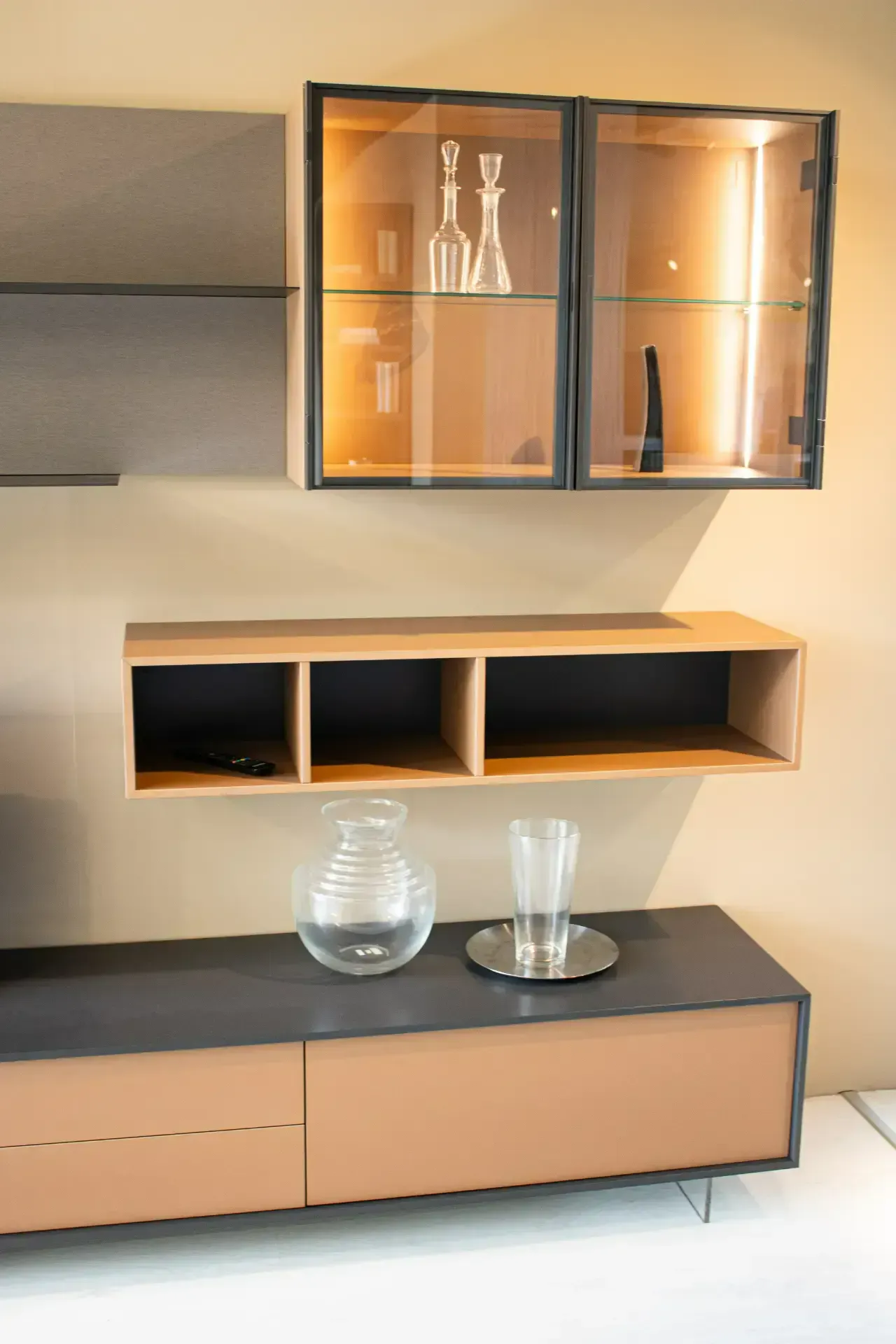 Composizione con basi a terra con piedini trasparenti effetto sospeso, mensole in metallo e pensili vetrina con cerniere nascoste e illuminazione a LED.